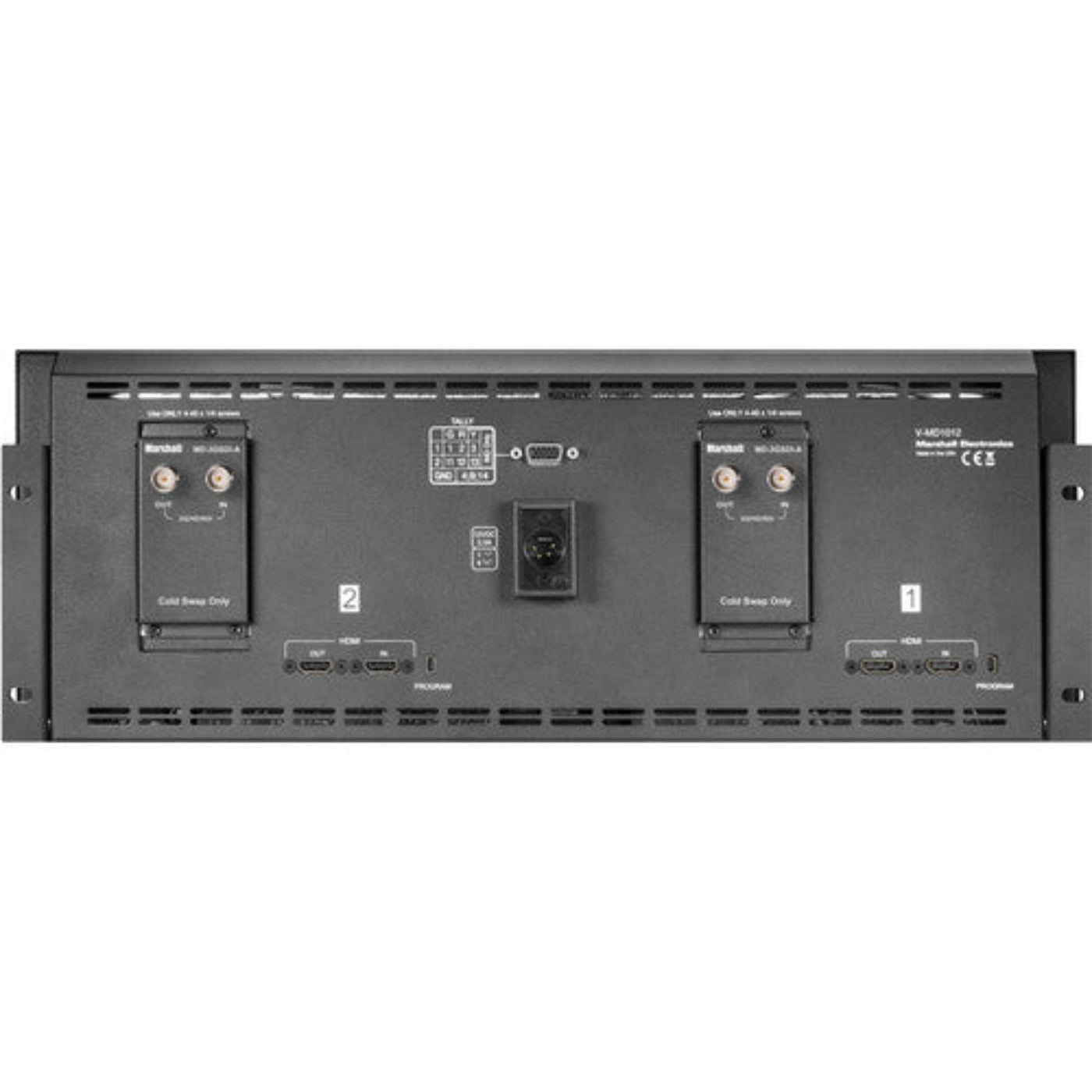 The Marshall Electronics V-MD1012 features two 10.1-inch LED high resolution (1920 x 1200) displays in a rack-mounted design with easily accessible back panels and swappable input modules. The dual independent displays include fully-adjustable crop, aspect ratio, and markers to dial in any kind of desired framing, as well as aneasy-to-use graphical user interface.