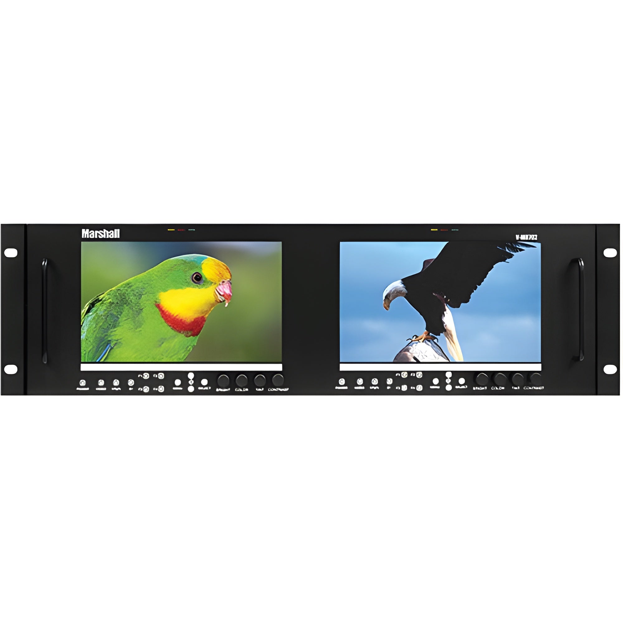 A: The Marshall V-MD702 is a dual 7-inch rack-mounted LCD monitor with a modular design, featuring composite and component loop-through outputs, ideal for broadcast, production, and multi-camera monitoring.