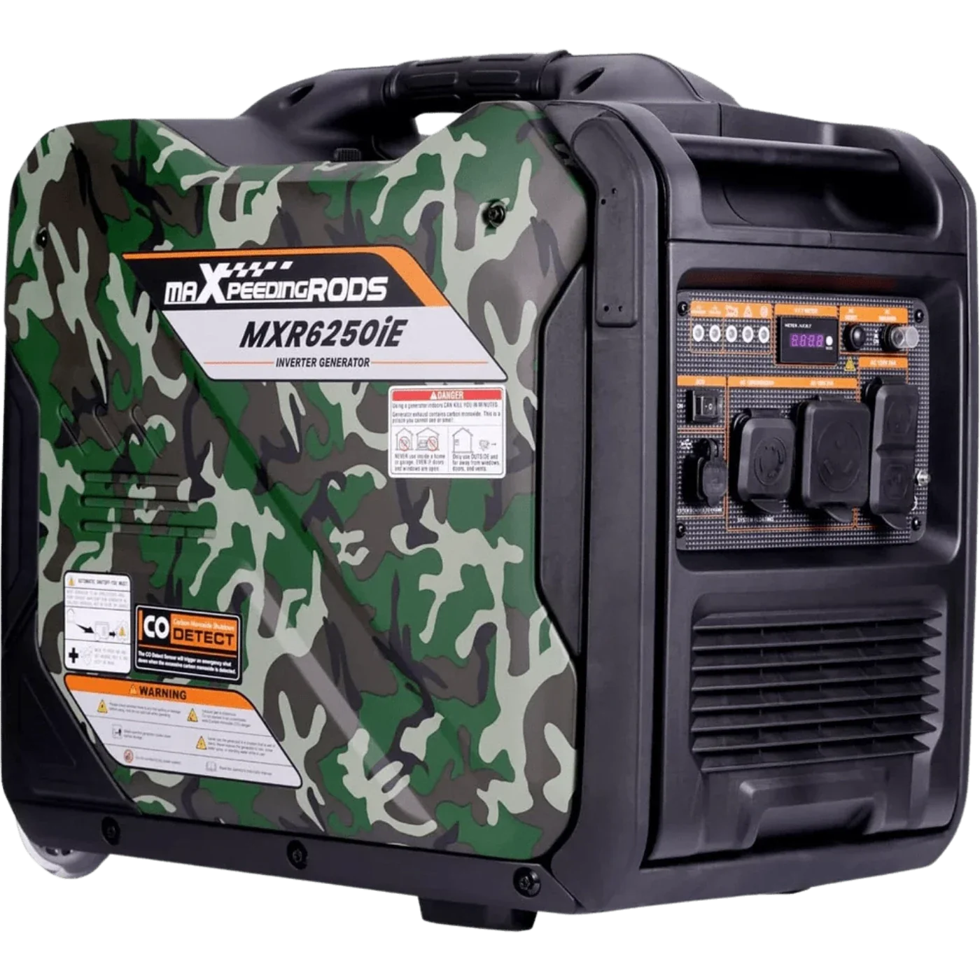 The Maxpeedingrods MXR6250IE-US Portable Gas Inverter Generator provides 5000W with a maximum of 5500W super-quiet operation at just 68 dB. Featuring a compact design with wheels for easy transportation and carrying. Reliable, clean power perfect use for camping to jobsites and power failure in extreme weather.