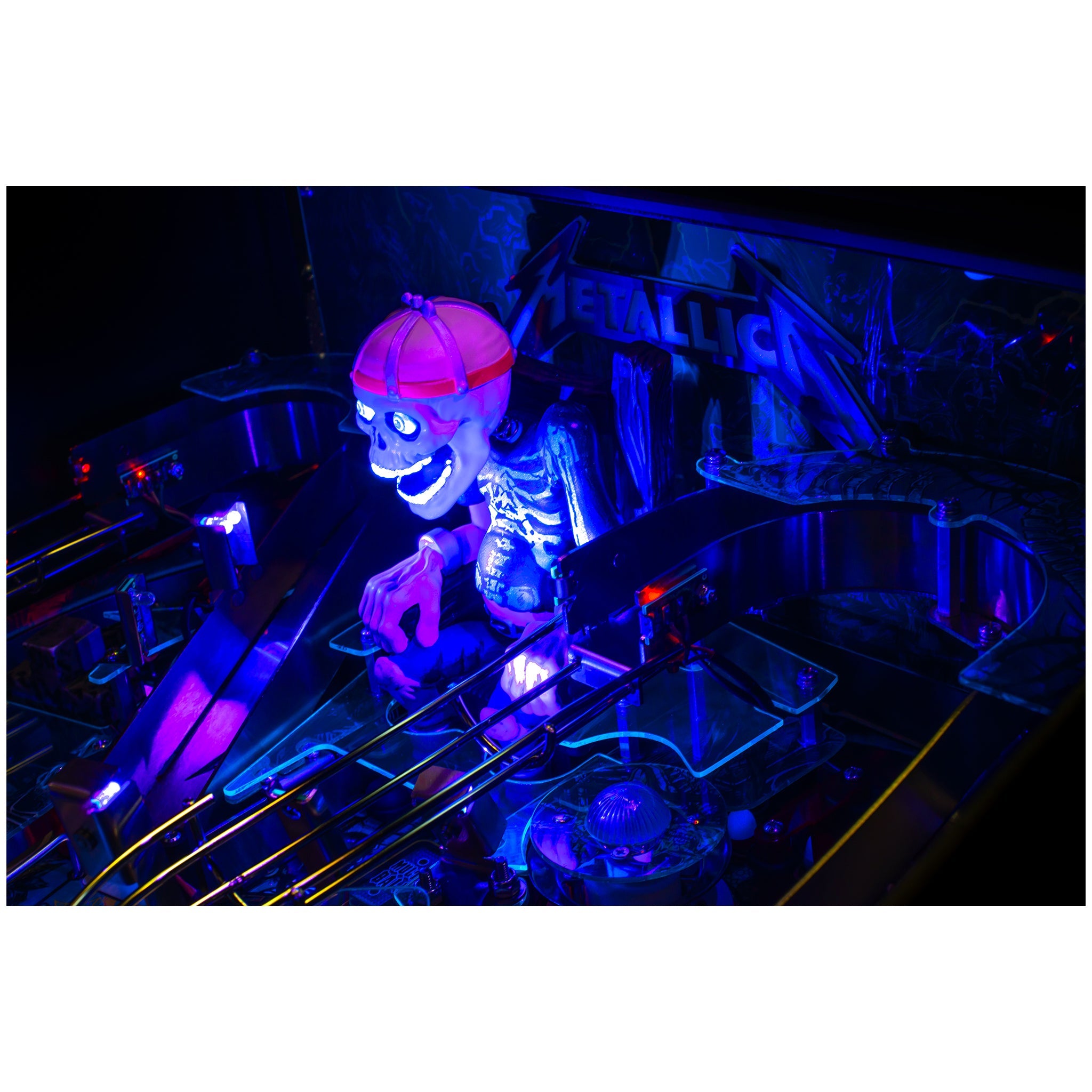 John Borg’s classic playfield architecture has been enhanced with three all-new sculptures: Sparky, the Hammer, new RGB-illuminated Skulls, and a new Metallica logo spell-out on the back panel. Dramatic UV lighting effects have been implemented throughout the playfield and on Sparky, and the game includes numerous quality and durability refinements.