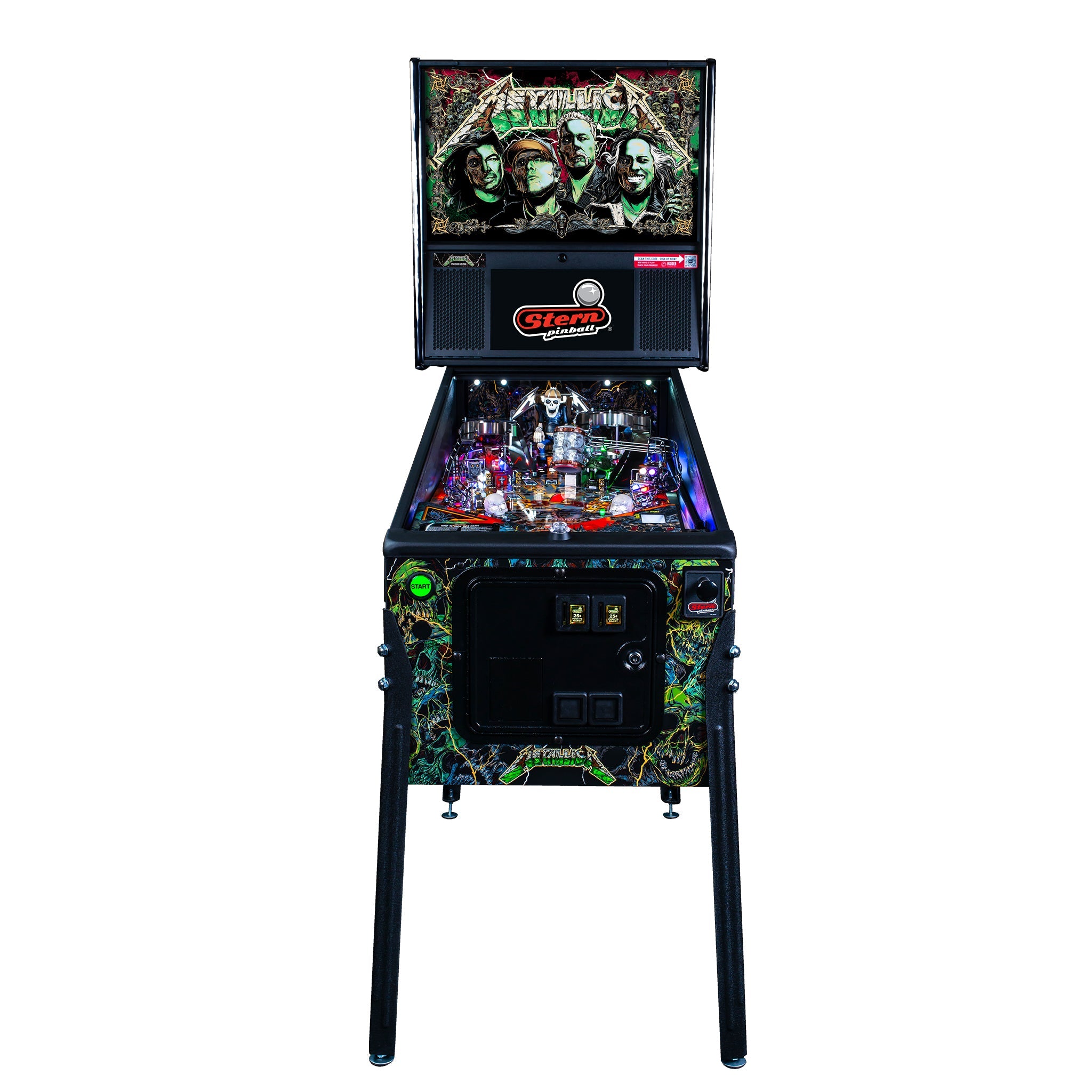Metallica Remastered is updated with a full-color LCD display featuring all-new animations and live concert video footage. Stern’s modern Spike 2 electronics will power the gameplay experience. Fans will enjoy expanded gameplay and improved presentation with 22 songs (8 more than the original) and expanded gameplay rules. Cabinet improvements include an Expression Lighting system and 2 all-new art packages by Metallica artist Rhys Cooper. Players will experience the same great flow from the original Metallica playfield layout with geometry and mechanical improvements, new versions of gameplay toys, updated mechanical devices, and new UV lighting effects.