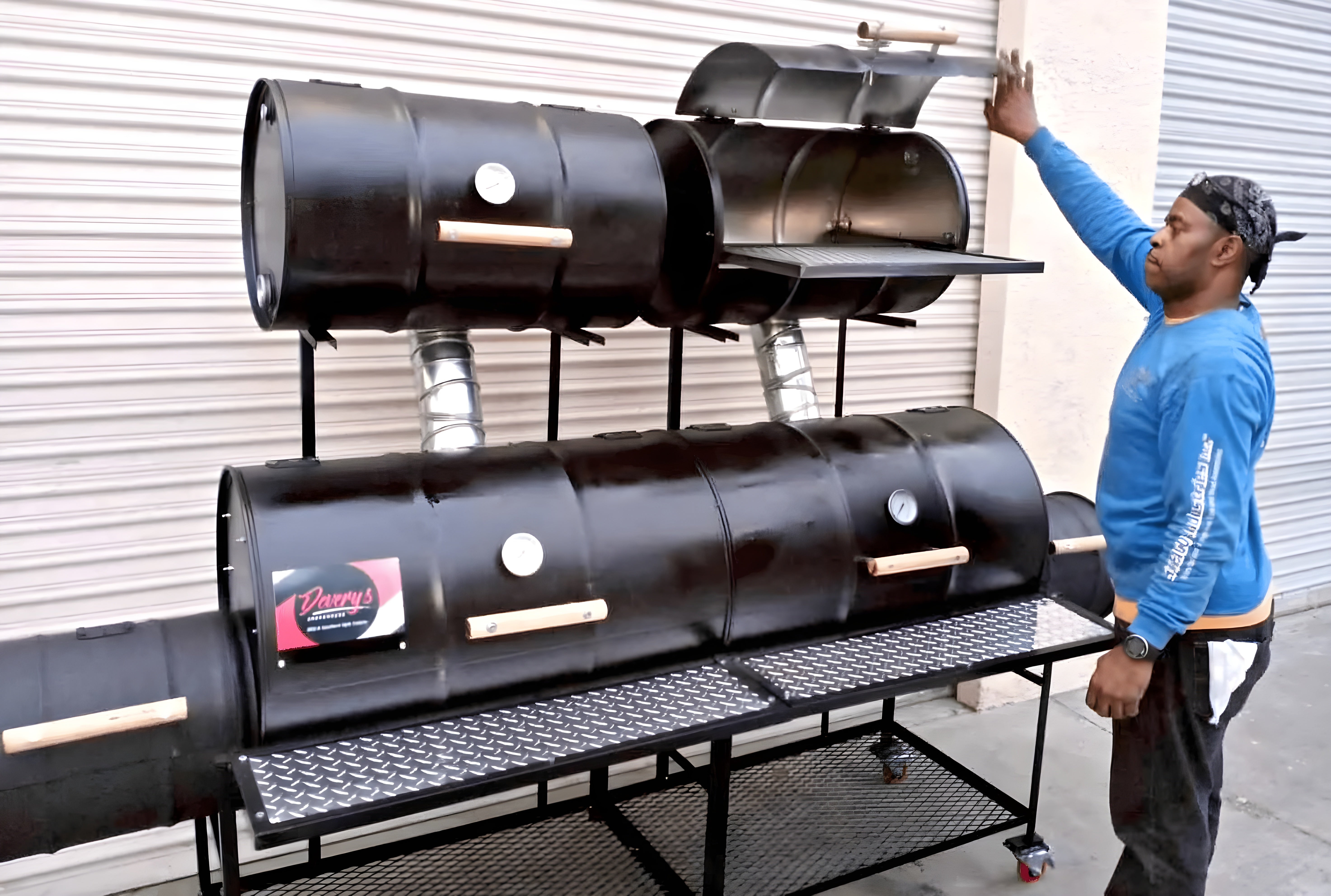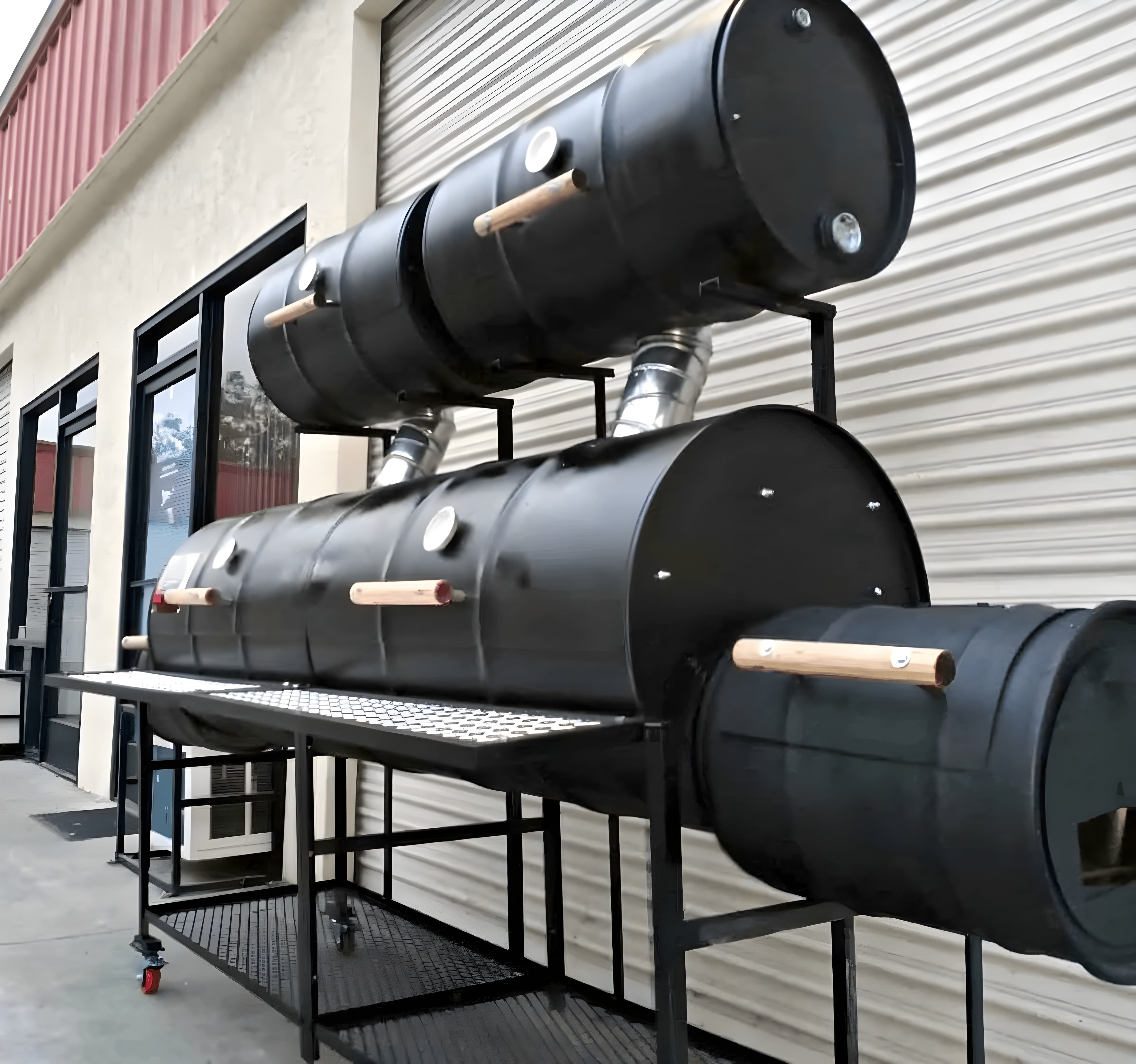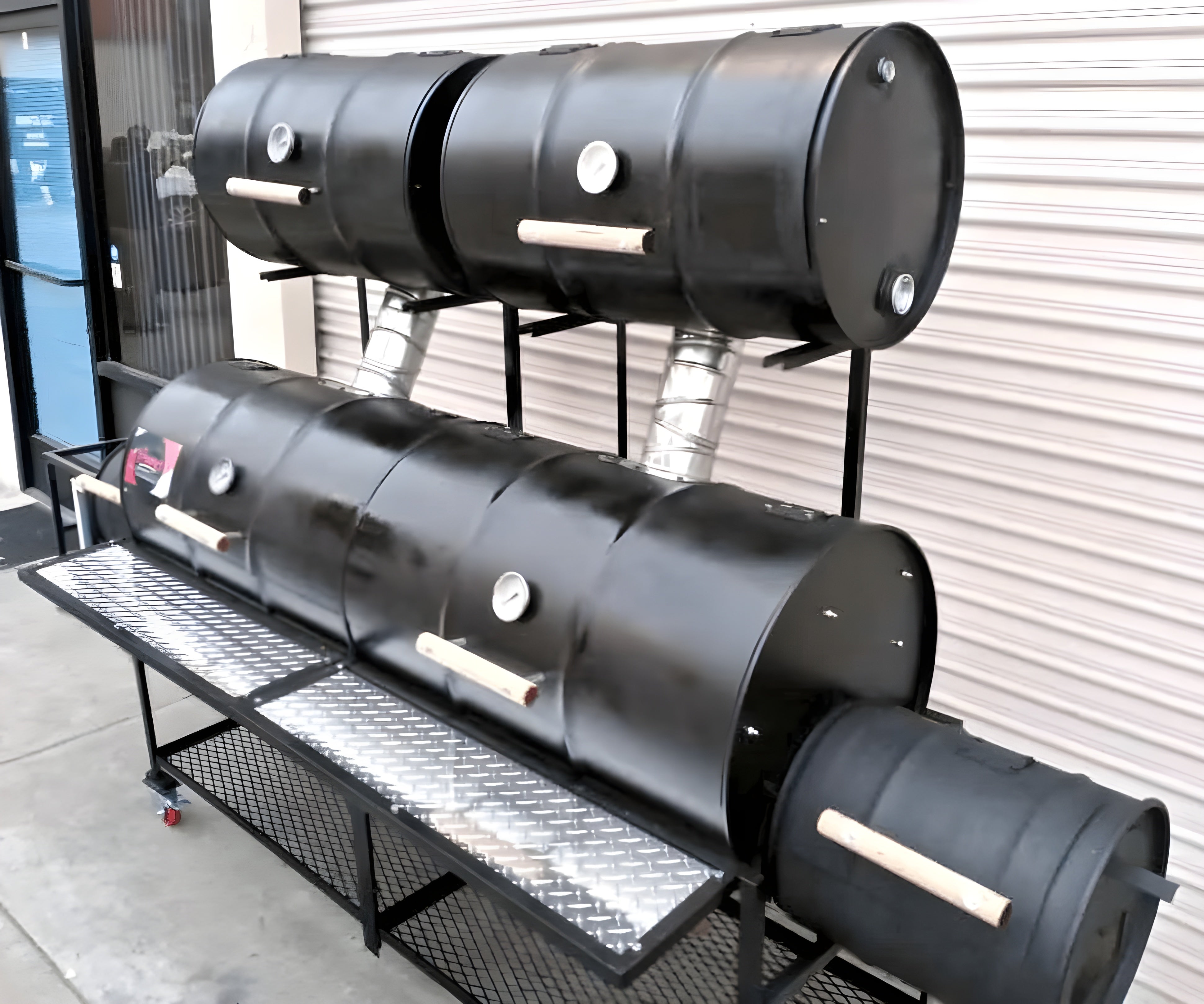 A: This heavy-duty, commercial-grade grill features four barrels for large-scale cooking, with separate smoking and grilling zones for ultimate versatility and heat control.