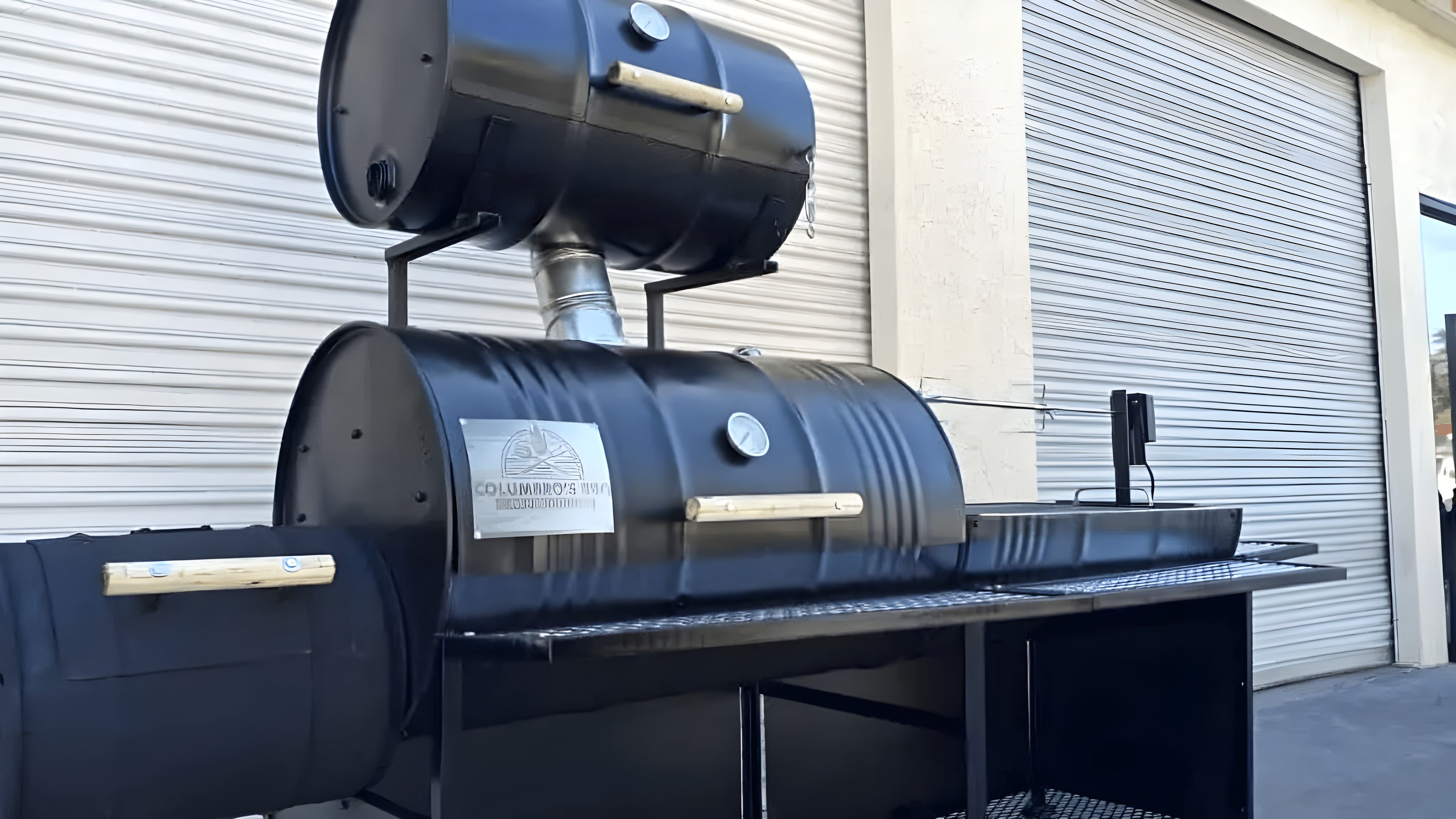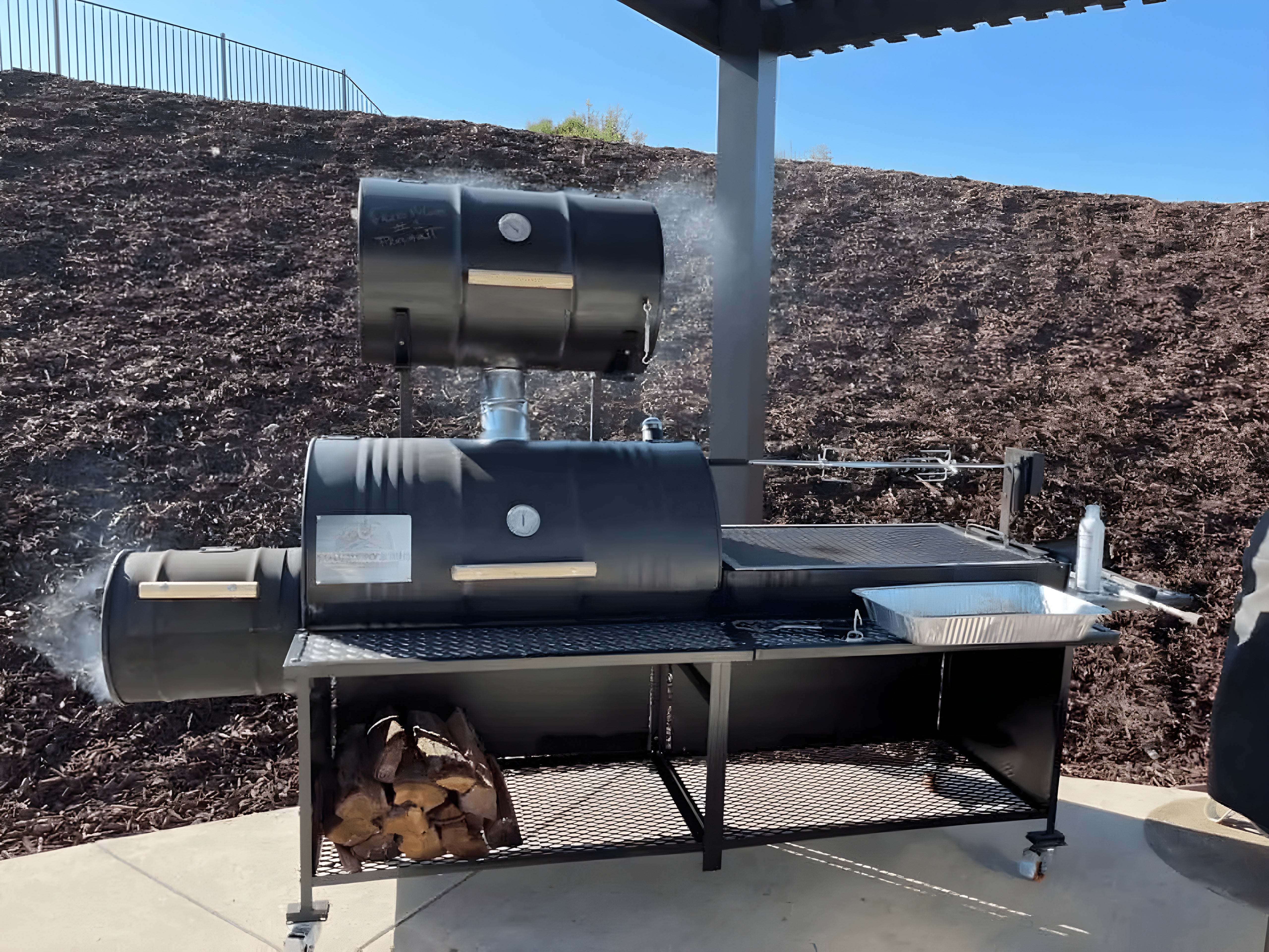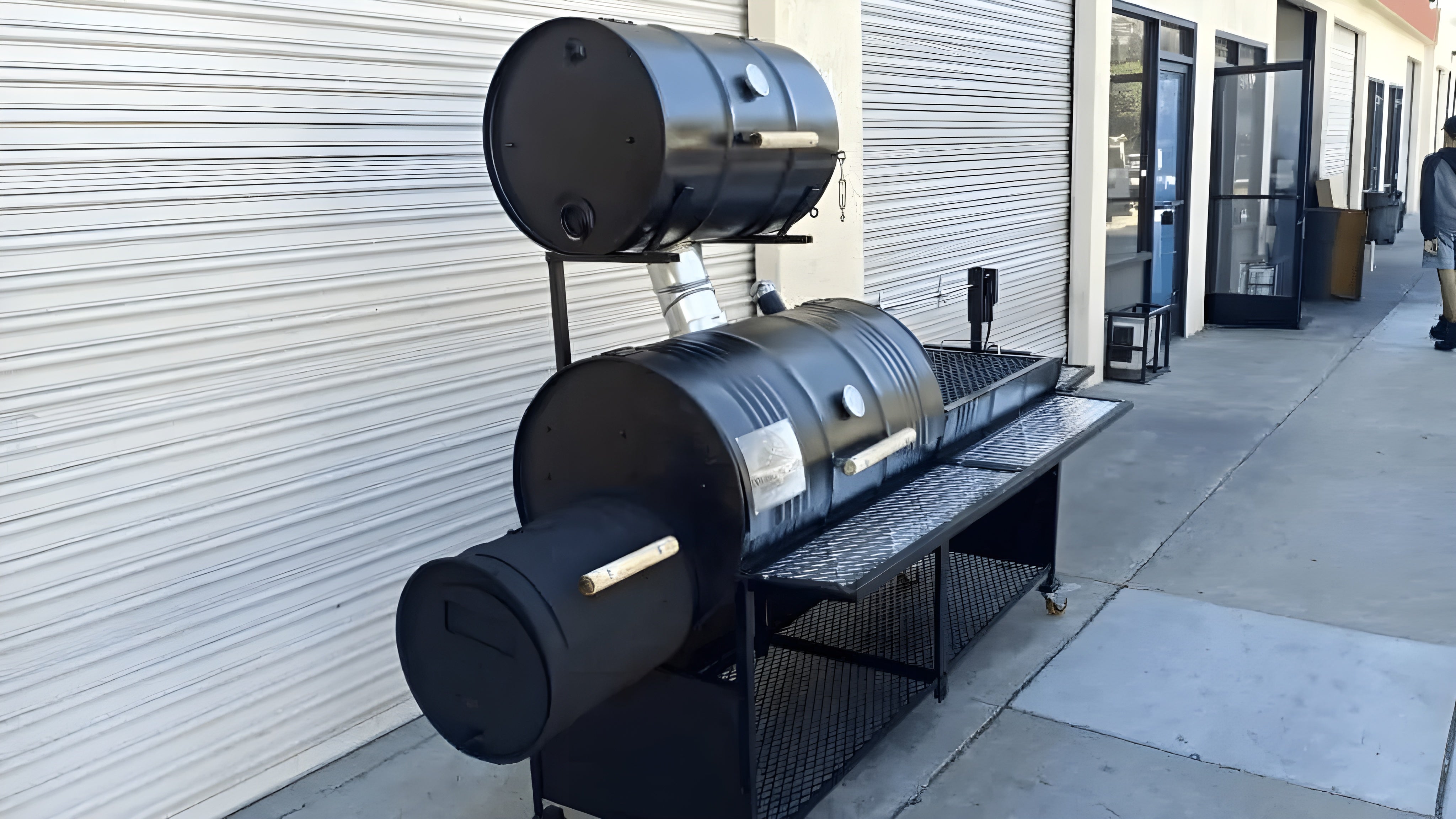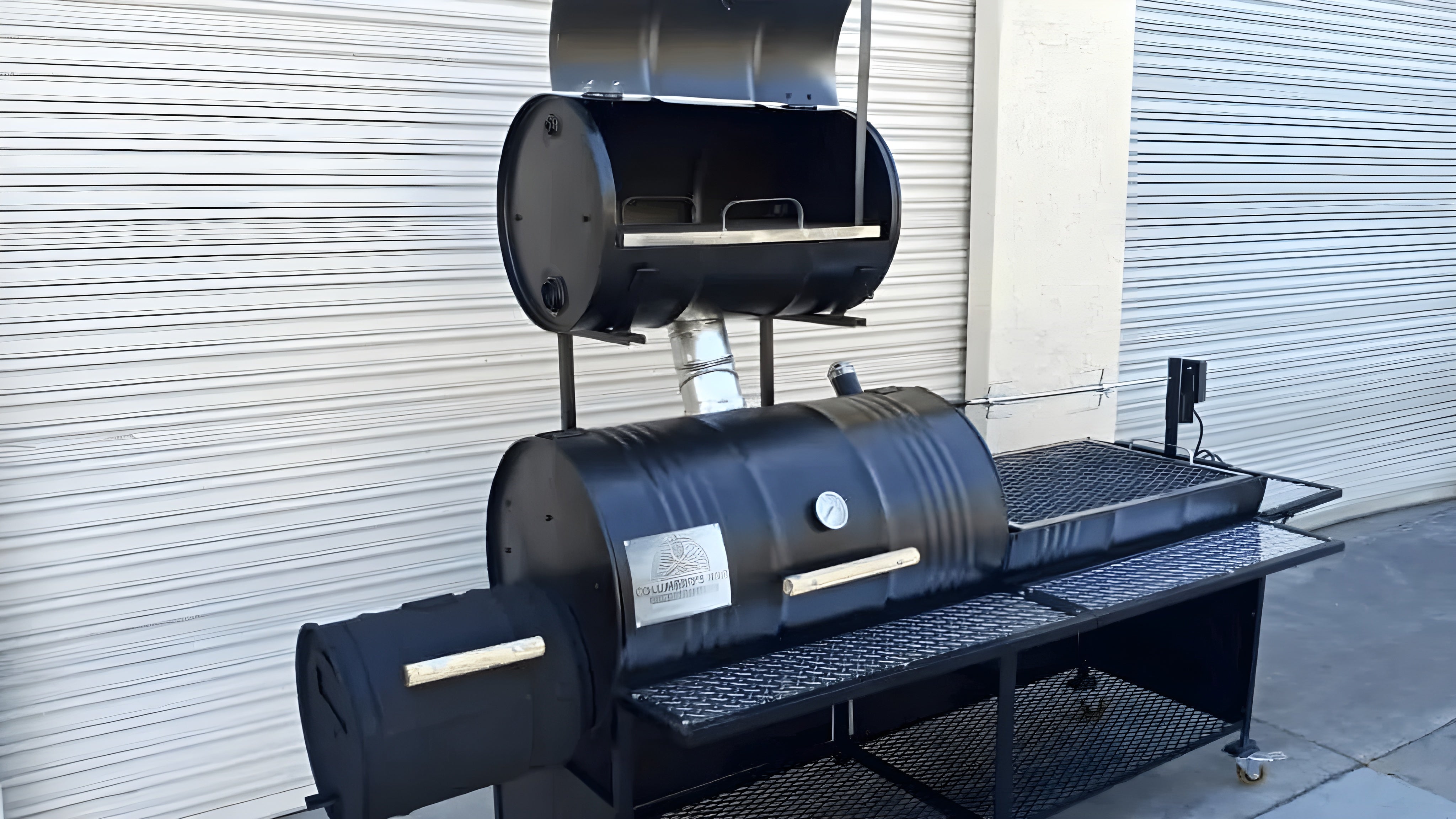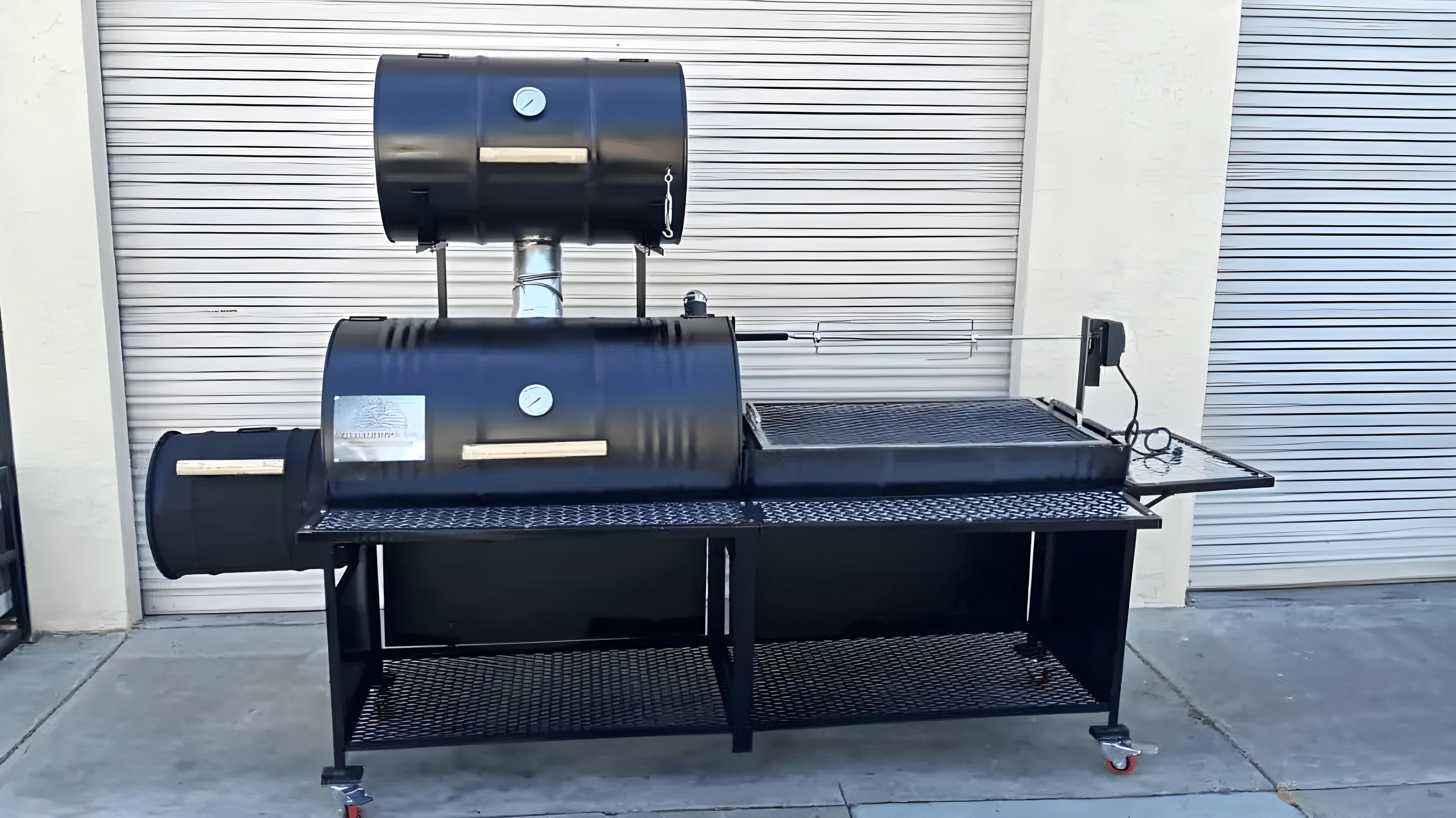 This unit is a wonderful Upgraded Ranch Style Moss Grill Smoker that has all the features of the Ranch Style Smoker with an added 30-gallon barrel designed for smoking above the main cooking grill. Now you can smoke meats, vegetables, pies, and macaroni and cheese directly above the grill unit. This unit also includes an added rotisserie in addition to the wall enclosure unit and locking caster wheels.