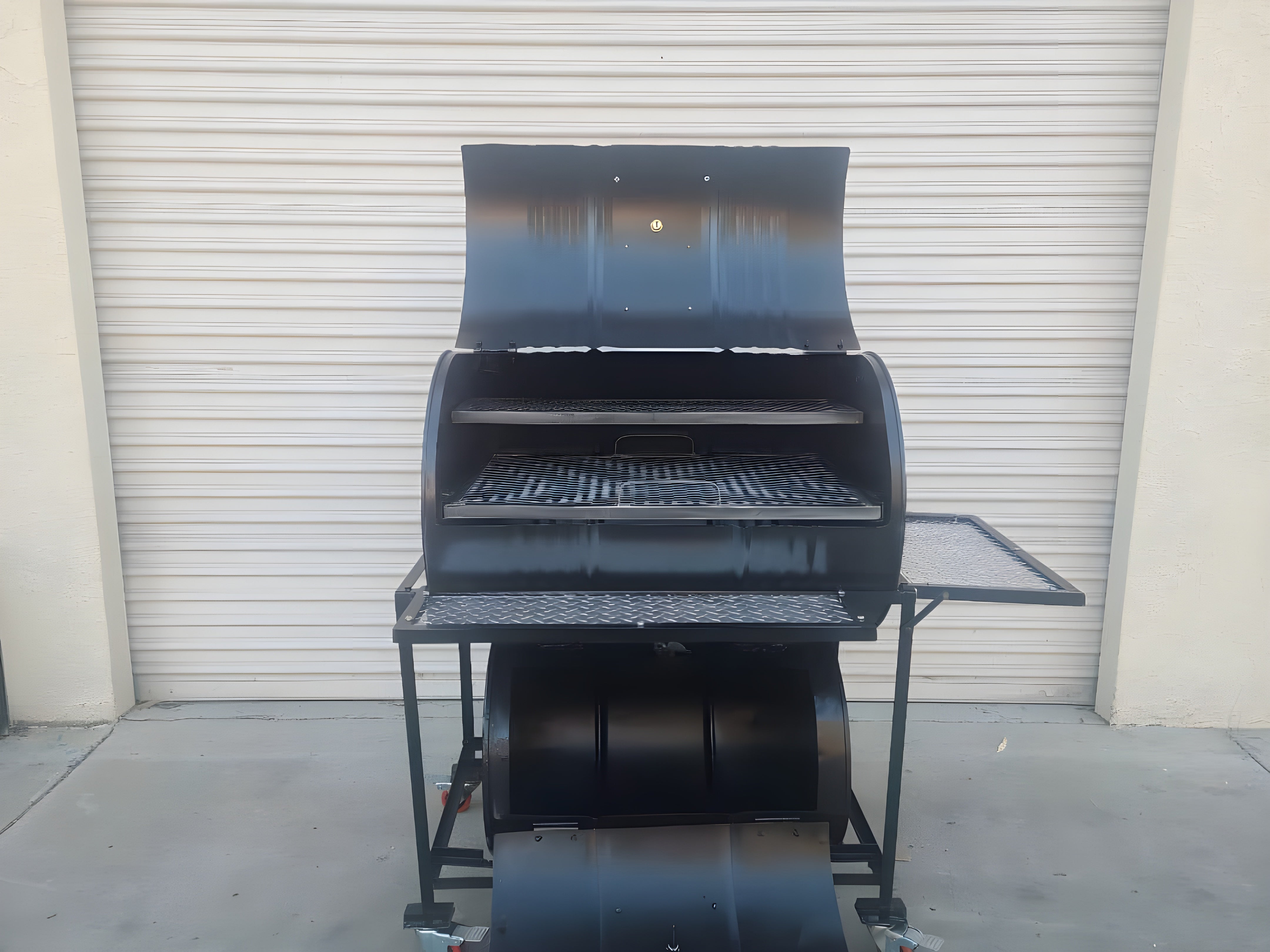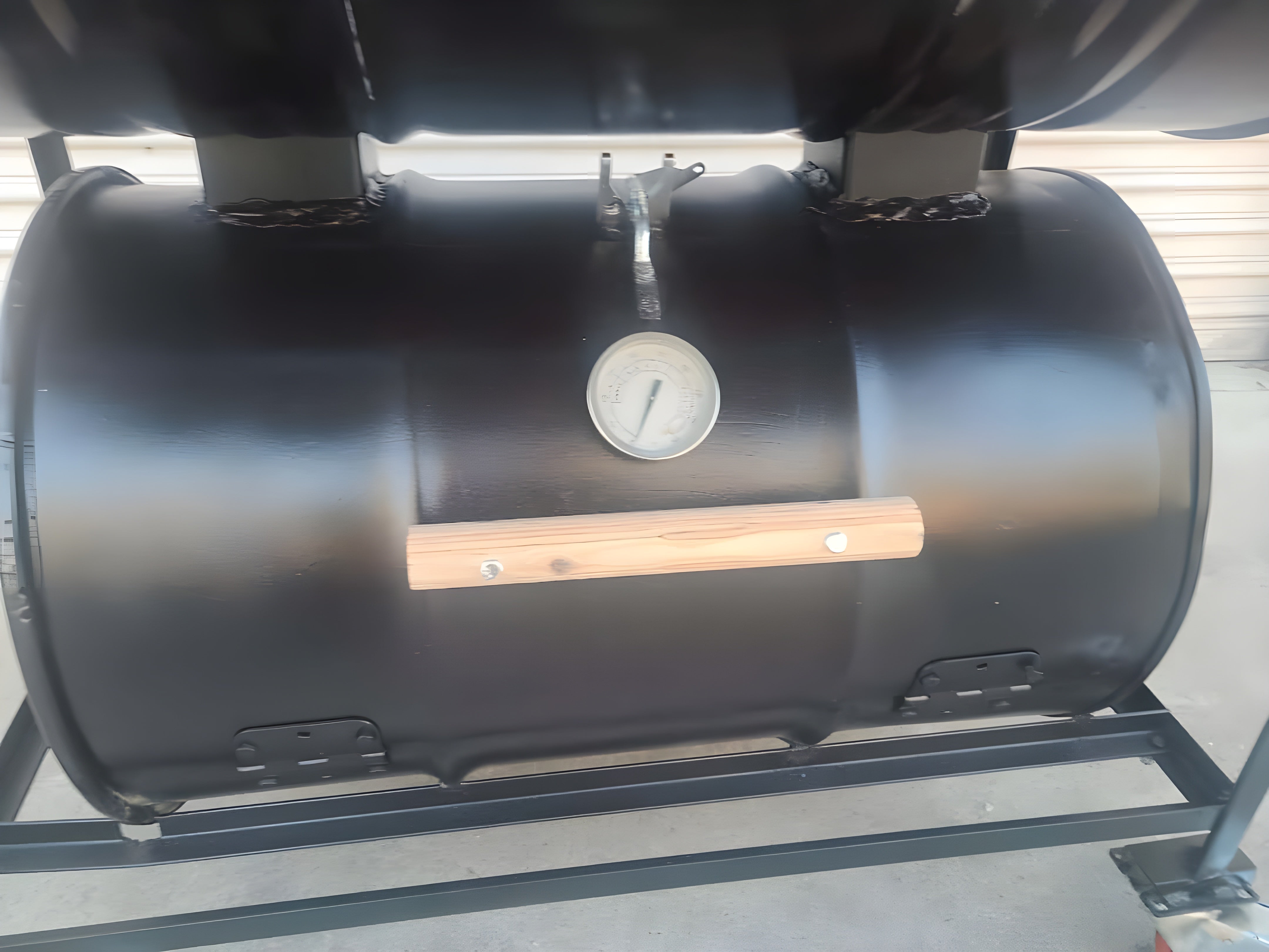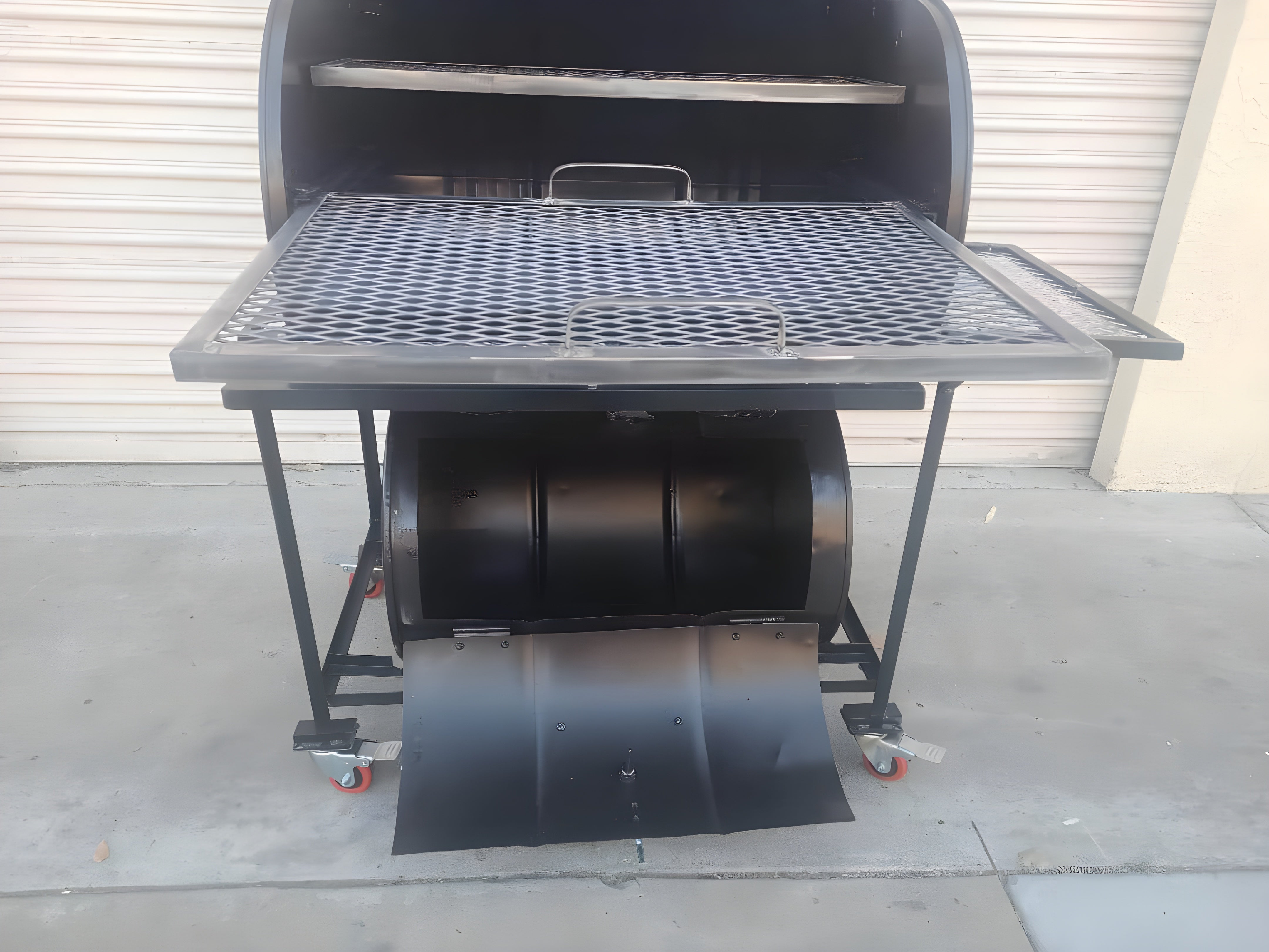 - One 35-gallon smoker underneath that connects directly to the 55-gallon drum barrel grill.