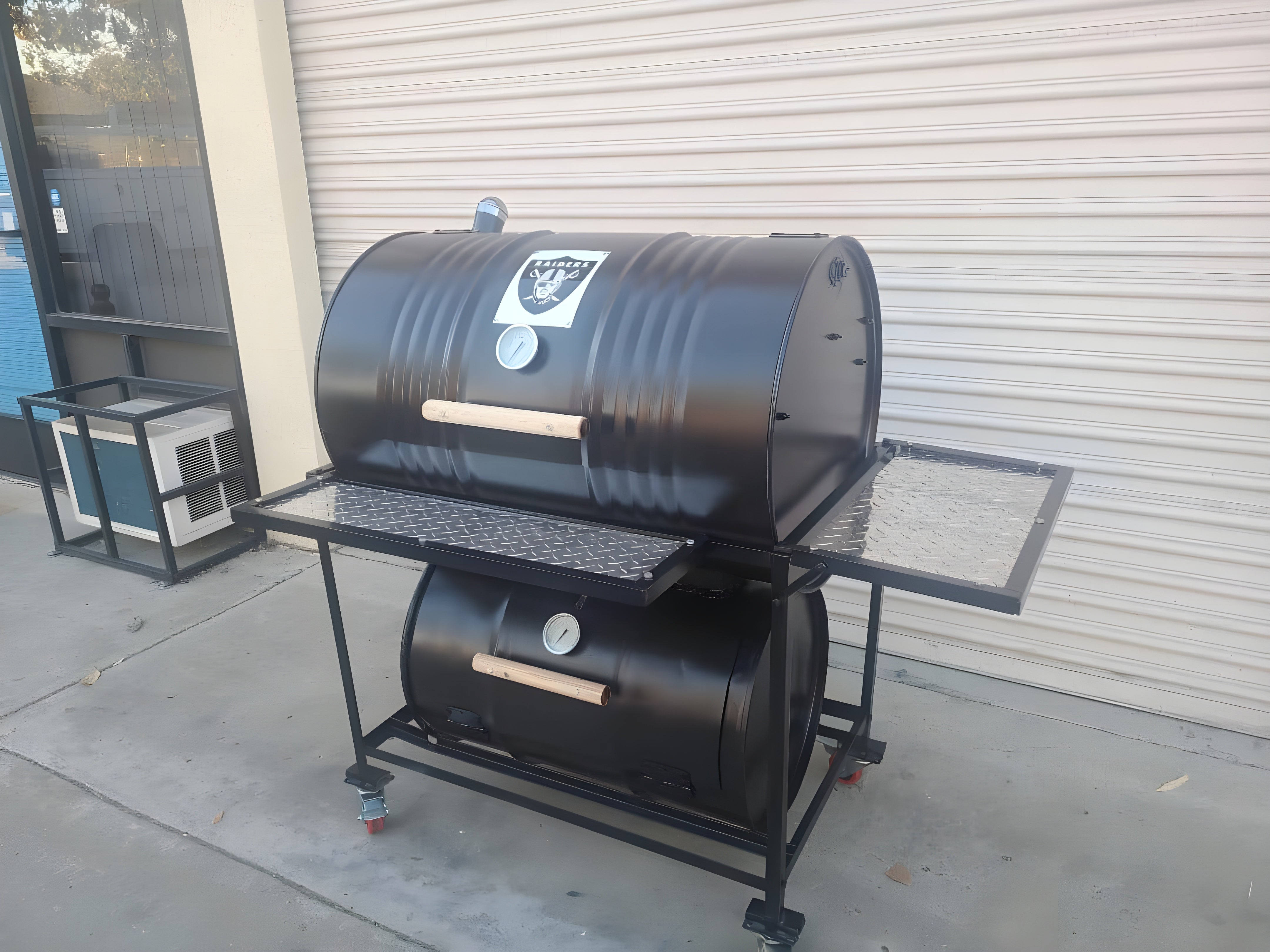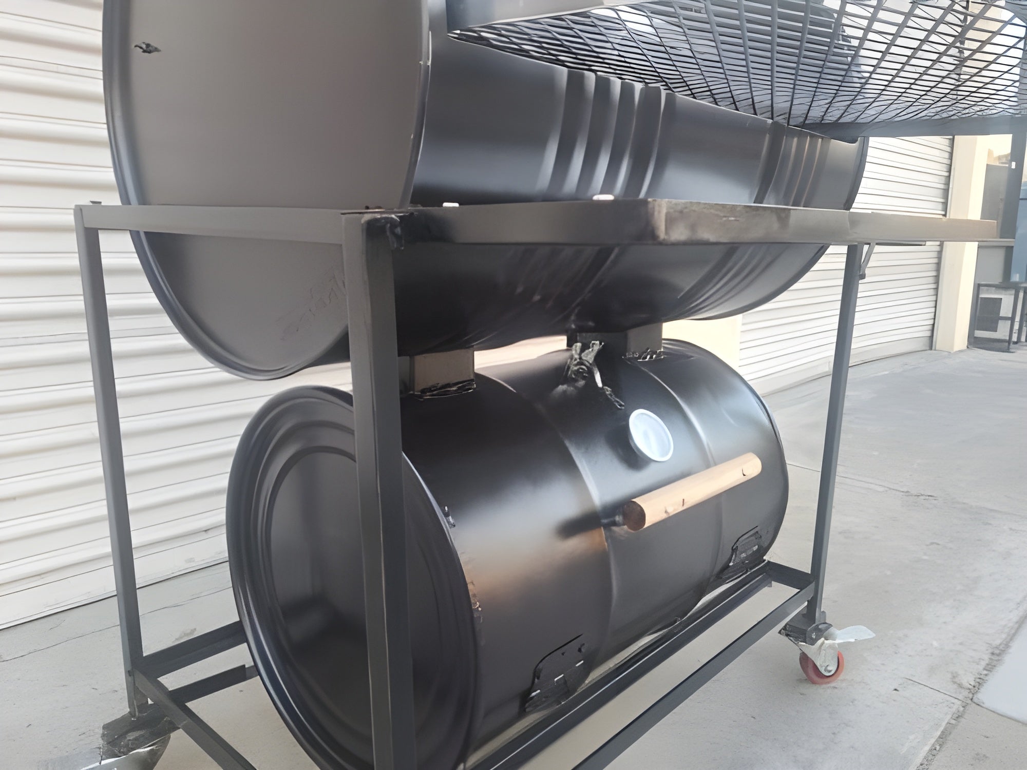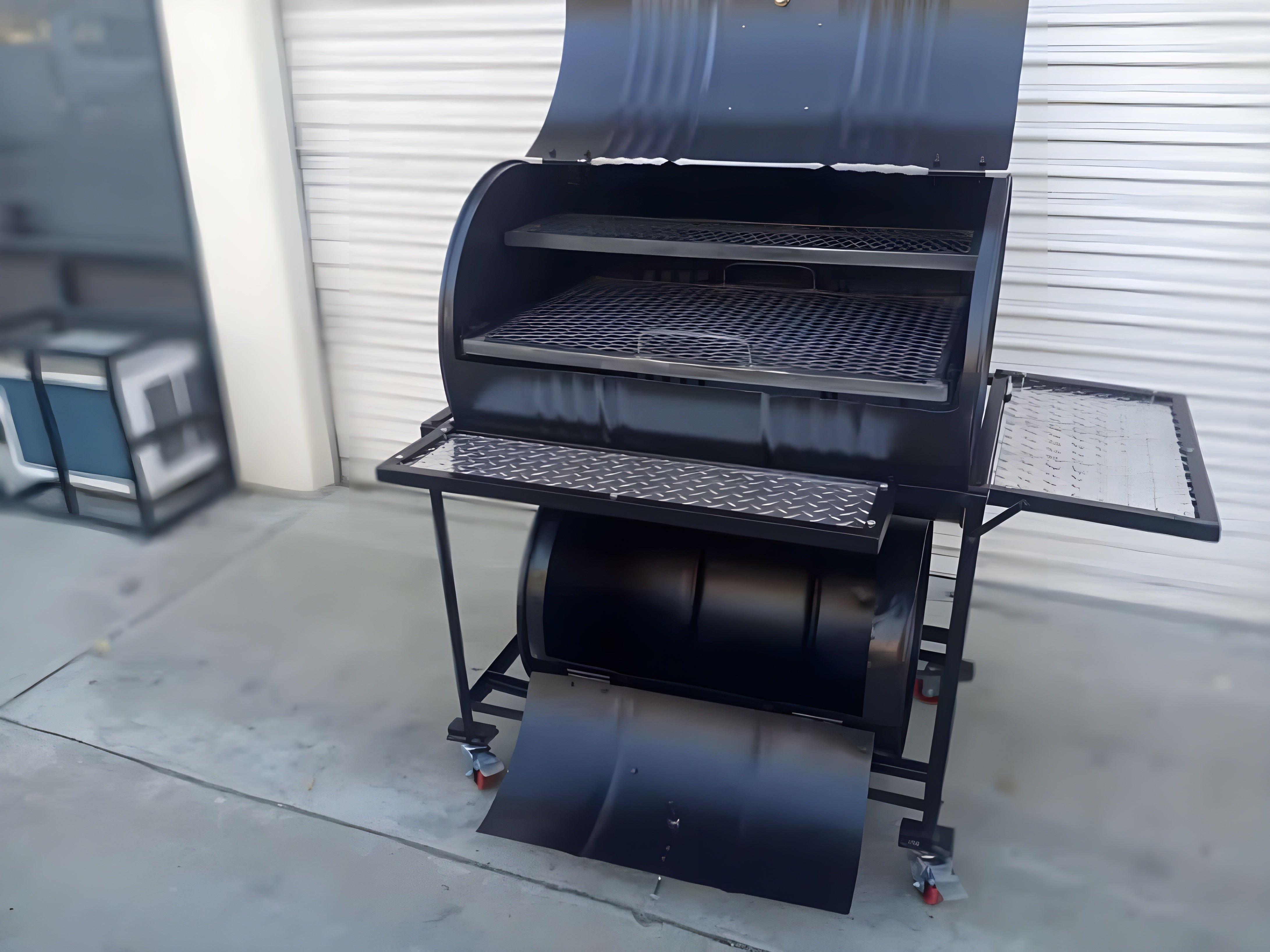 - One 35-gallon smoker underneath that connects directly to the 55-gallon drum barrel grill.