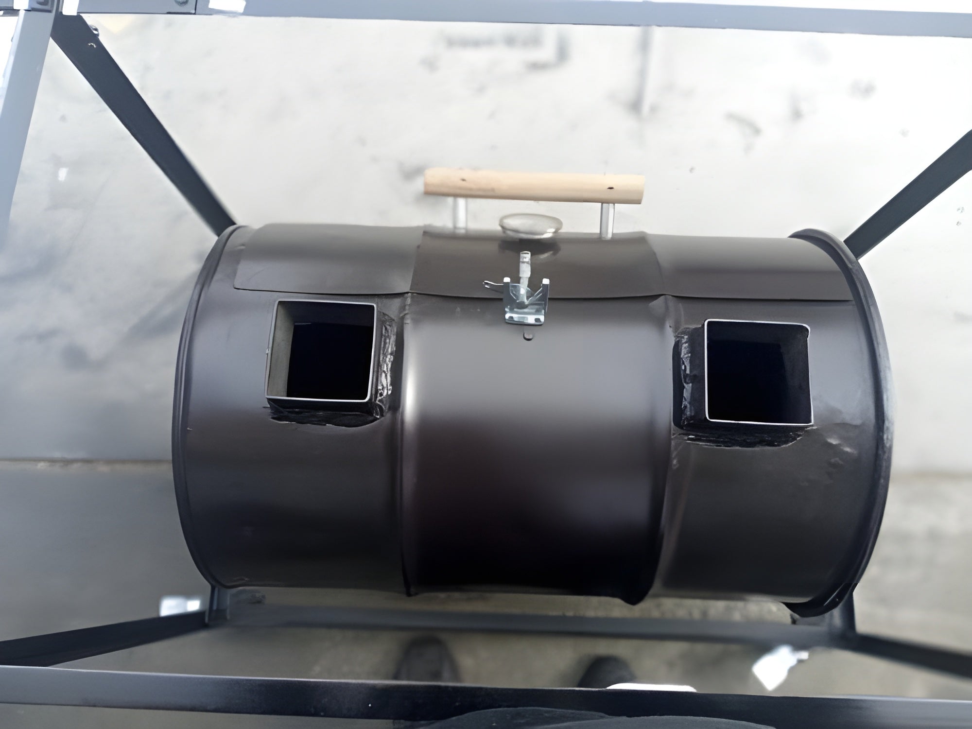 - A smoker box installed underneath the 55-gallon barrel. It’s used for smoking large and “big stick” woods.