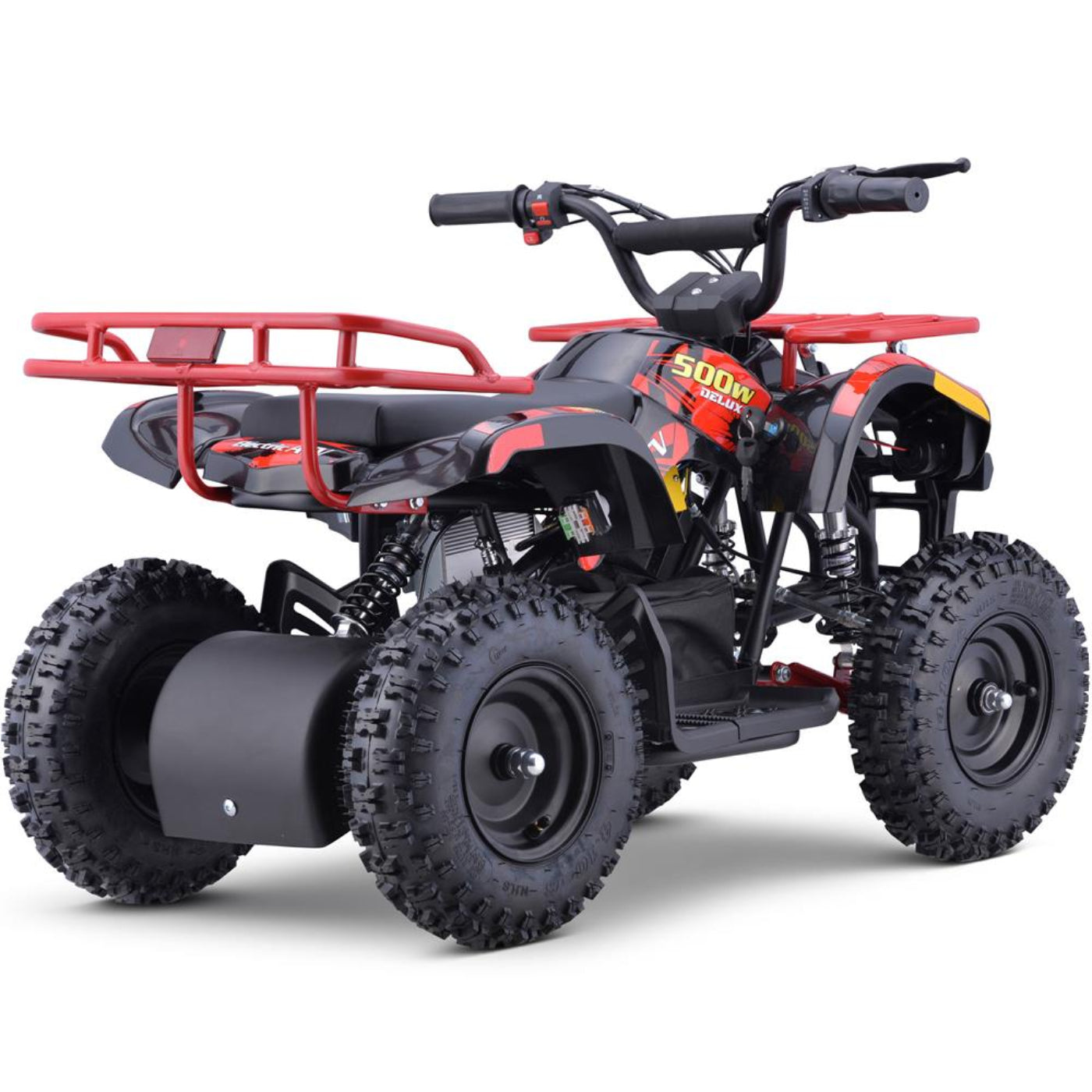 The MotoTec 36v Sonora Mini ATV is the ultimate kids ride! Great for driveway and backyard fun, cruise over bumps and speed through dirt trails with ease. Comes standard with front & rear suspension, front & rear brakes, front & rear carrying racks and large 13 inch knobby pneumatic tires. This mini quad provides longer ride times than the competition with THREE large 12v 12amp hour batteries. New features include: headlights, parking brake, key start, battery meter, half twist throttle, forward & re This ATV can last up to three hours of riding time, giving your kids the opportunity to explore and enjoy the outdoors. With 13 inch knobby pneumatic tires and front and rear suspension, your kids can take on any terrain with confidence.verse. ATV's are sold by following age ratings: Y6+, Y10+, Y12+, Y14+, Y16+