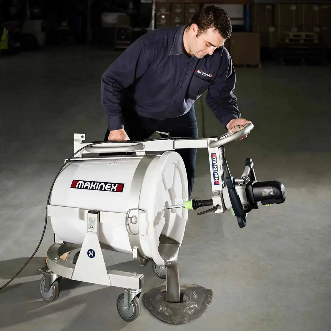 Makinex MS-100 Mixing StationThe Makinex Mixing Station MS-100 is the ultimate mixing solution for self-leveling cement, compounds, and epoxies, producing a perfect mix every time. Designed by Contractors for Contractors, this portable station provides efficient hands-free mixing and enables fast, precise pouring of materials.
