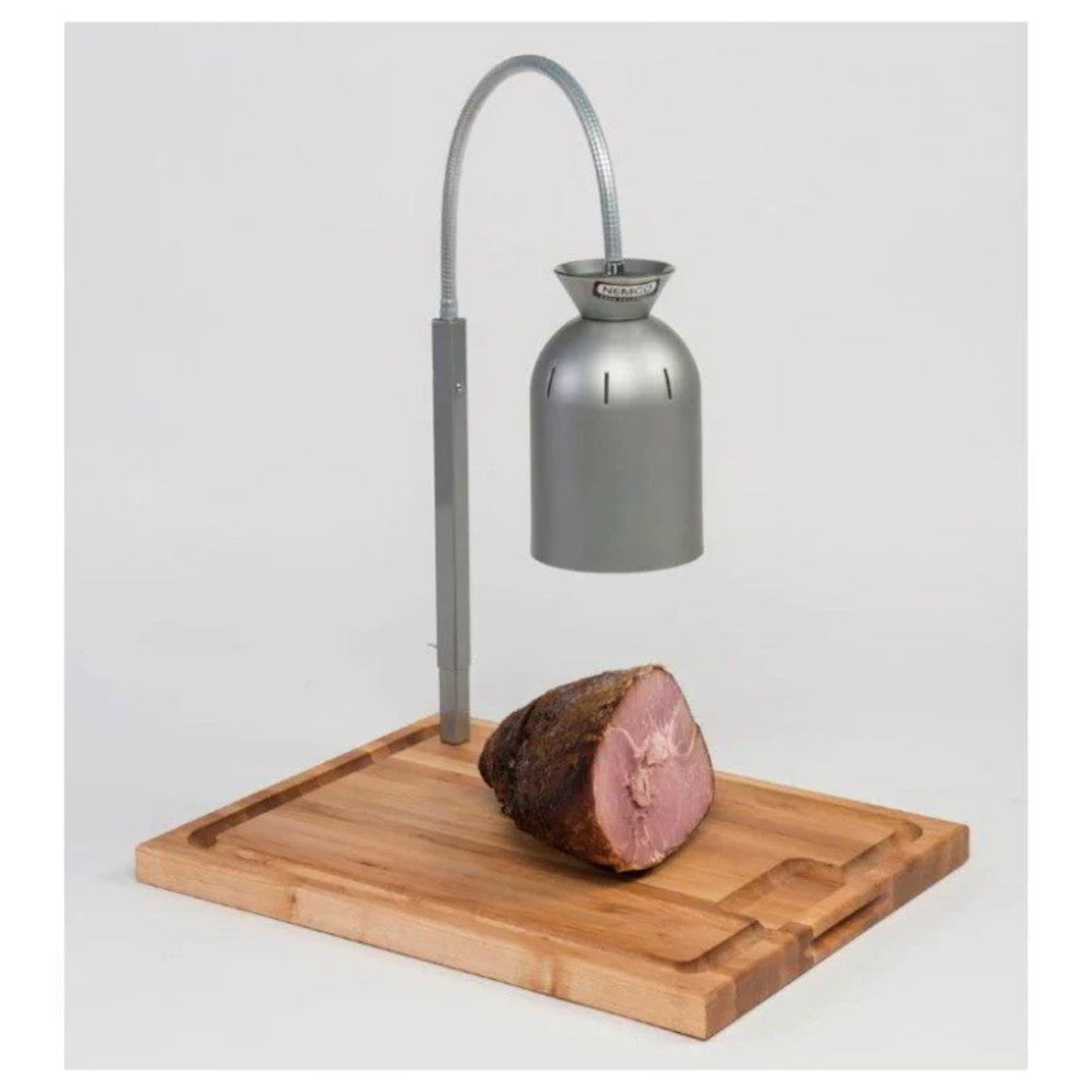 The Nemco 6016 Countertop Carving Station is durable and easy to use. It has a sturdy steel frame and aluminum hood with a scratch-resistant finish. The hood has an infrared, single bulb. It uses 120 volts and 250 watts to keep plated foods at optimum serving temperatures. It is perfect for holding baked foods, such as rolls, breads, and desserts, as well as your most popular fried favorites and side dishes like chicken fingers, poppers, French fries and more. The 6016 can also be used for steamed and broiled foods as well.