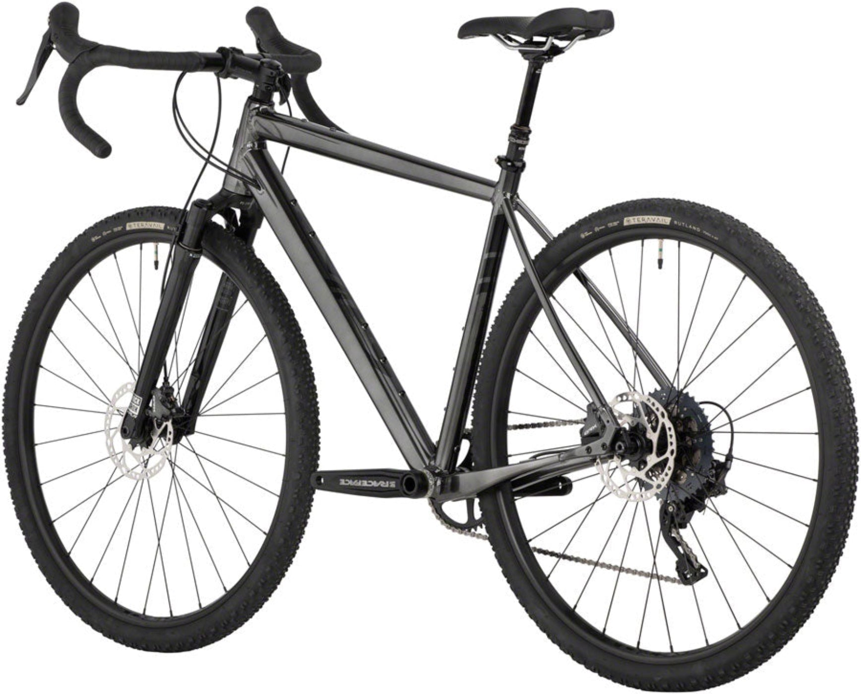 A: The bike is equipped with 700c WTB ST i25 TCS 2.0 rims and Teravail Rutland 700c x 47mm tires. These tubeless-ready tires offer excellent traction and durability on gravel and mixed surfaces.