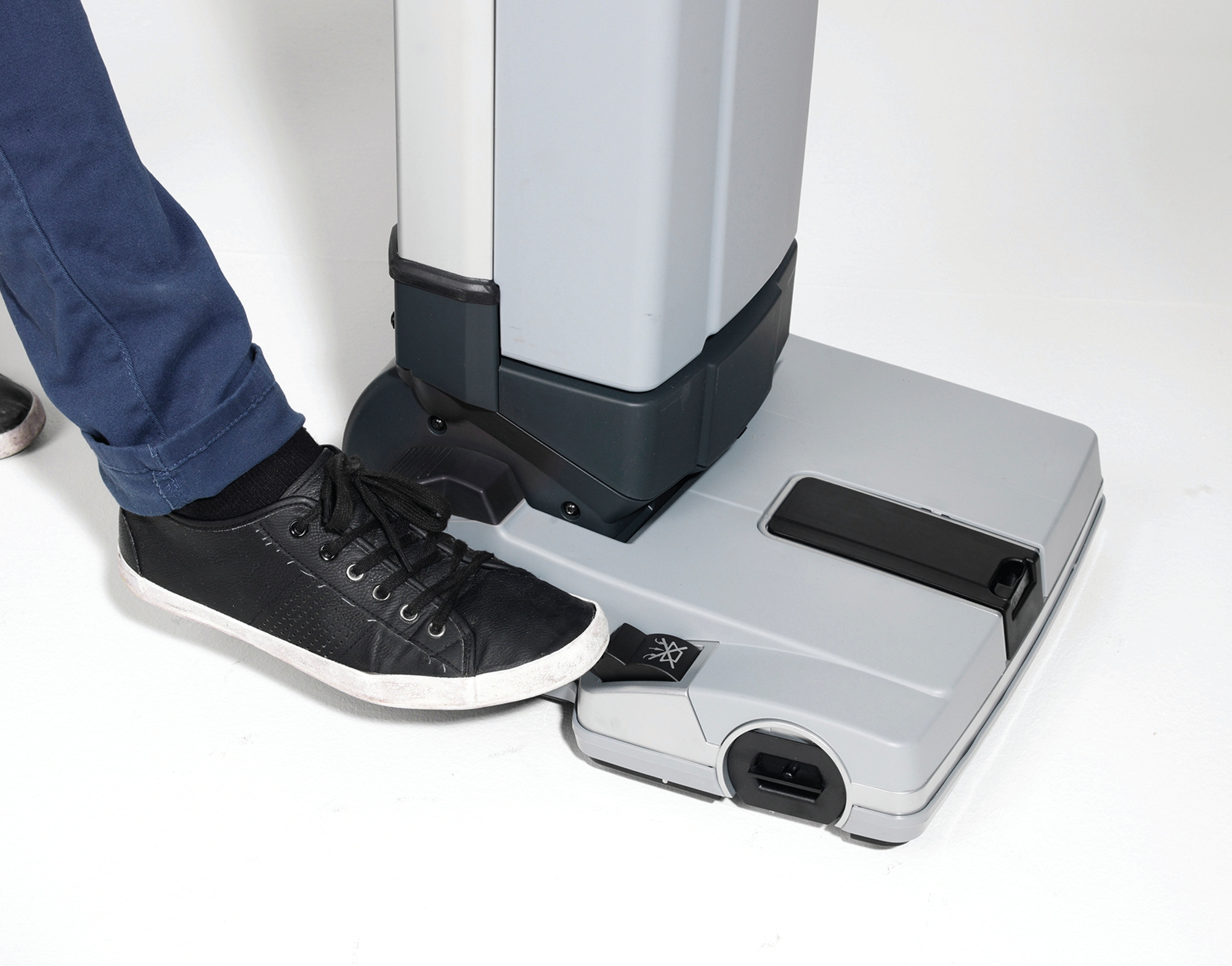 The SC100™ has a cleaning clearance of under 4 inches. Machine functions stop when in the upright position. Solution tank dispenses only clean solution, unlike a traditional mop-and-bucket. |