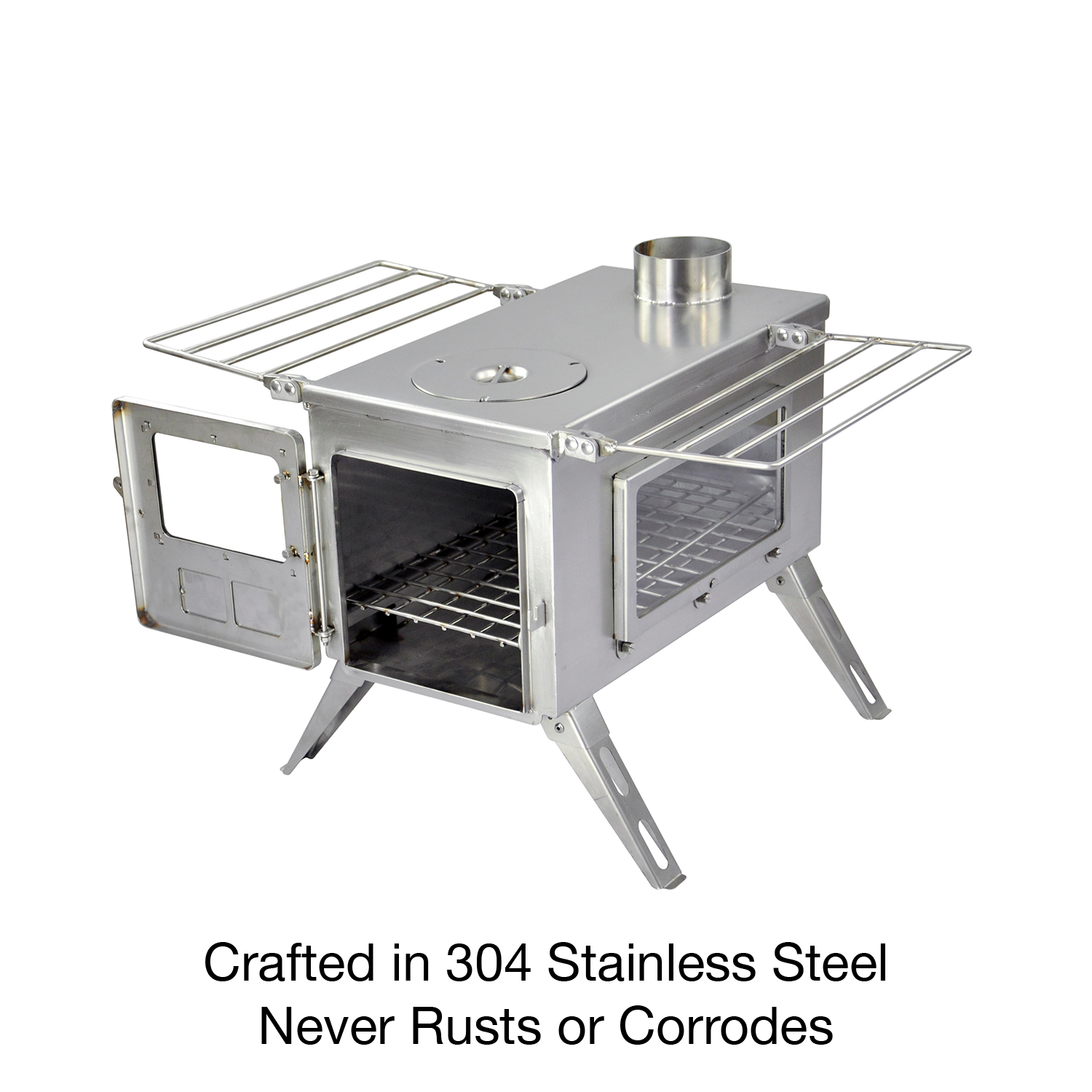 A: It is a high-performance wood-burning stove designed for heating and cooking in large tents, yurts, and outdoor shelters.