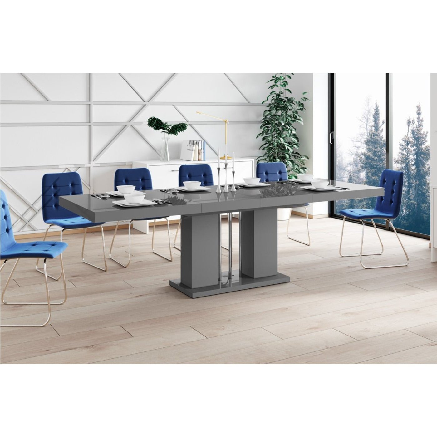 The original base and a modern high gloss table top make NOSSA Dining table and chairs a stylish and sophisticated accent of your dining/living room or even office. In addition to its modern design, the table also features a practical folding function. You can easily get 82.7 inch or even 102.4 inch from the standard length of 63 inch.