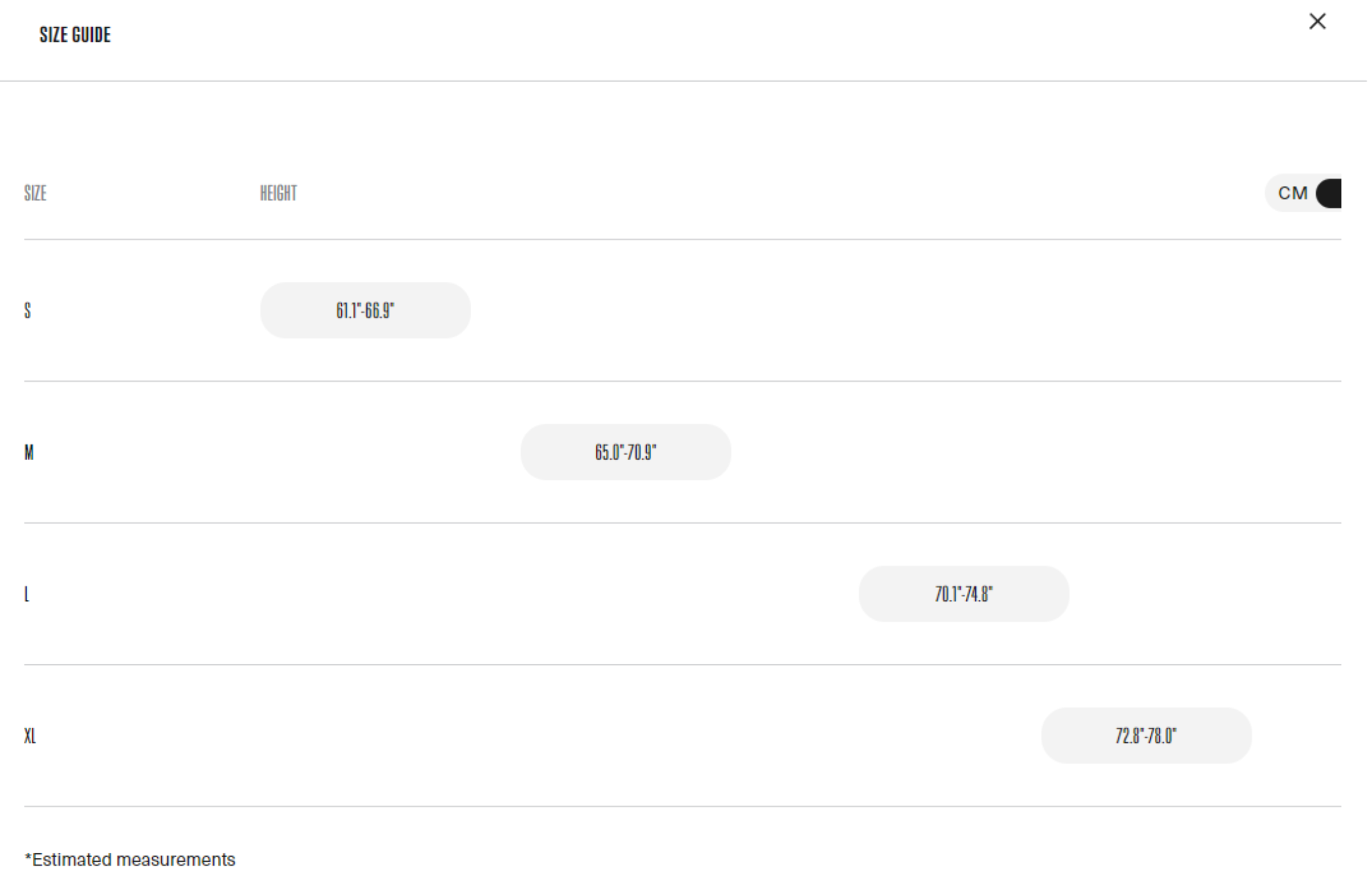 The bike is available in Small, Medium, Large, and Extra Large sizes to fit different rider heights.