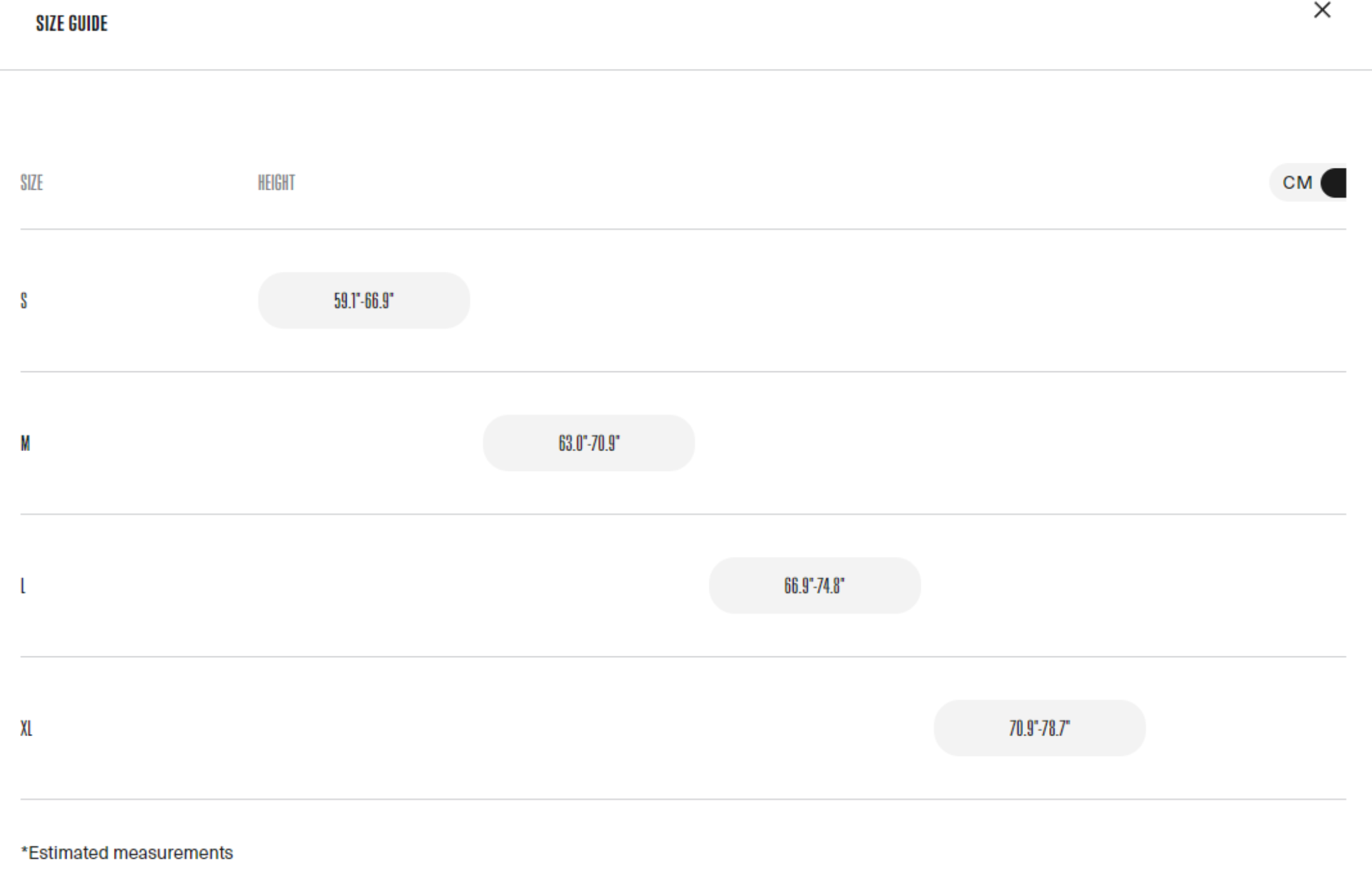 The bike is available in sizes Small, Medium, Large, and Extra Large.