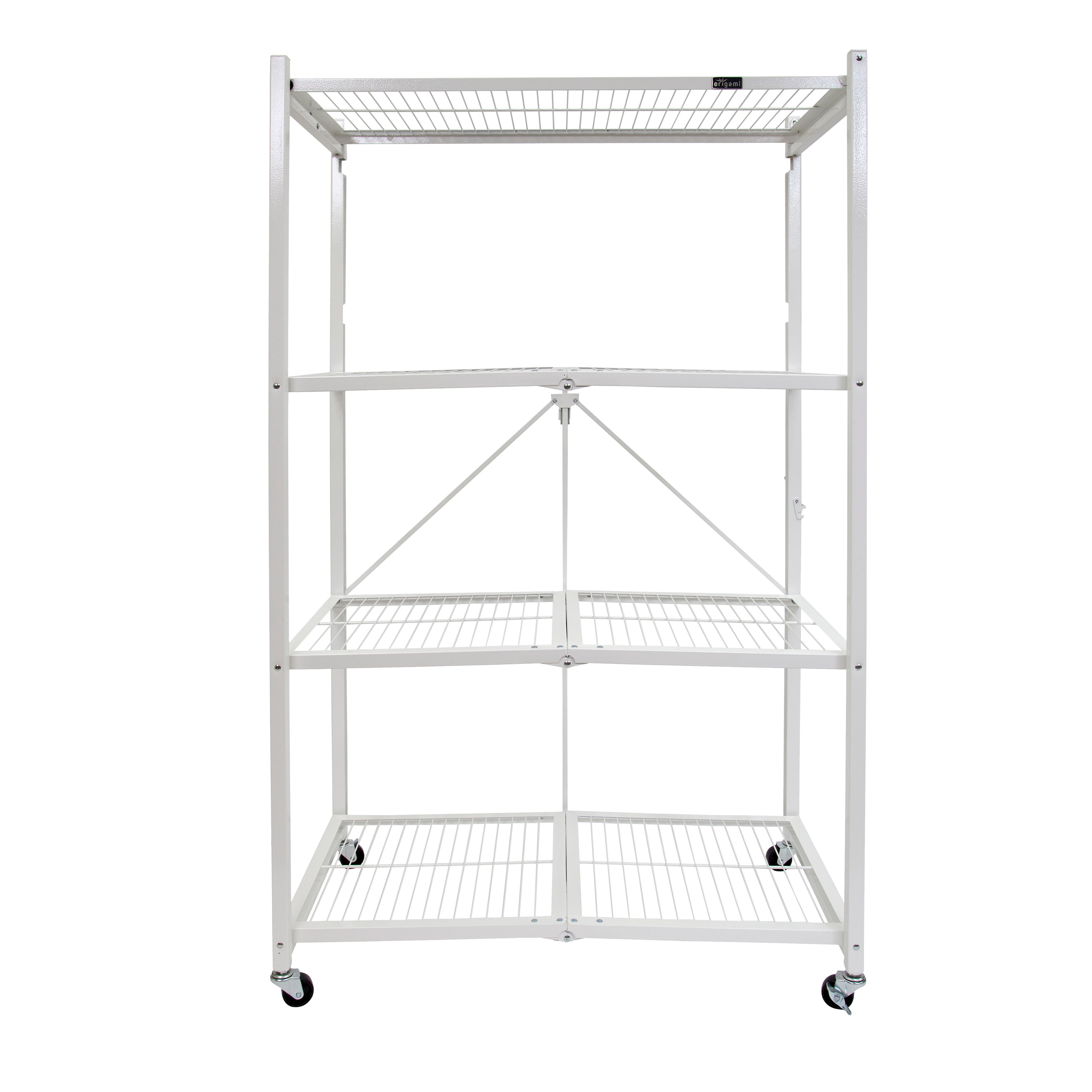 These versatile and robust multipurpose storage units from Origami are a must-have organizational solution for every modern home. With their sleek finish, the R5 Folding 4-Tiered Shelf Storage Racks on Wheels seamlessly blend into any living space and offer an efficient and convenient way to declutter your surroundings.Designed with spacious shelves and made from commercial-grade powder-coated steel, these 4-tiered organization and storage rack ensures optimal storage for your belongings. For added convenience and mobility, the shelving unit includes 4 caster wheels. Without wheels on the rack, these shelf organizers can hold up to 750 pounds (250 pounds per shelf), while they can hold up to 225 pounds (75 pounds per shelf) with wheels. Boasting both durability and optimal functionality, these foldable garage shelving units have multiple tiers to accommodate a wide range of household items. These shelving units are built for convenience and reliable storage, suitable for garages, warehouses, offices, basements, classrooms, and more. Use them for bathroom storage, laundry room organization, as a closet organizer cart, open pantry and kitchen storage, or as a bookshelf in the living room.Best of all, these rolling carts require no tools or lengthy assembly time. To set up, unfold the wire shelving frame, flip the top shelf down, and secure the patented Origami connection clip. You're ready to store bins and boxes in just about 20 seconds! Simply fold the storage carts flat when not in use.When it's time to tidy up, declutter, or you want to add a display shelf for home decor, Origami has the versatility you need. Take on any storage and organization task with confidence using the R5 Foldable 4-Tier Storage Racks on Wheels.