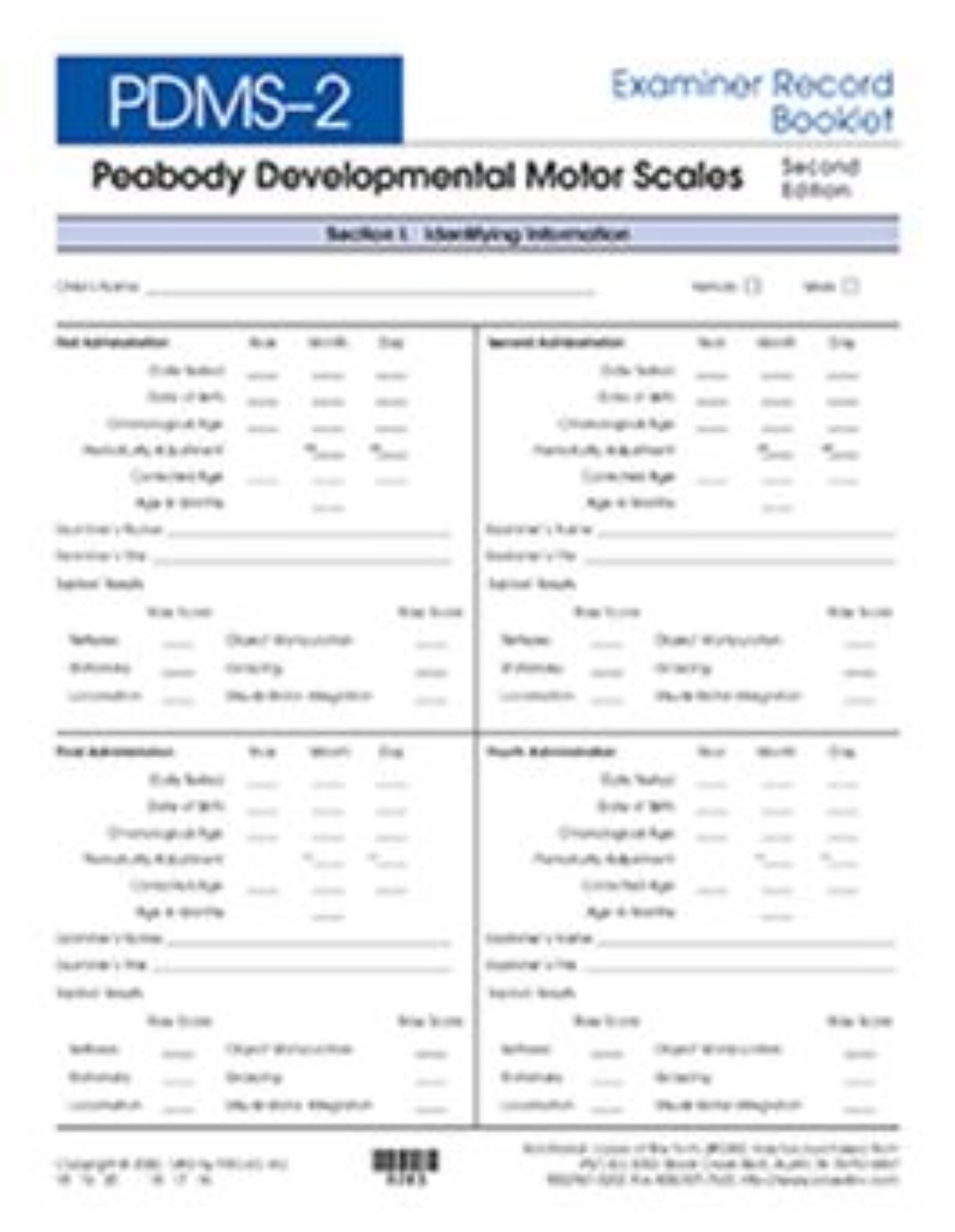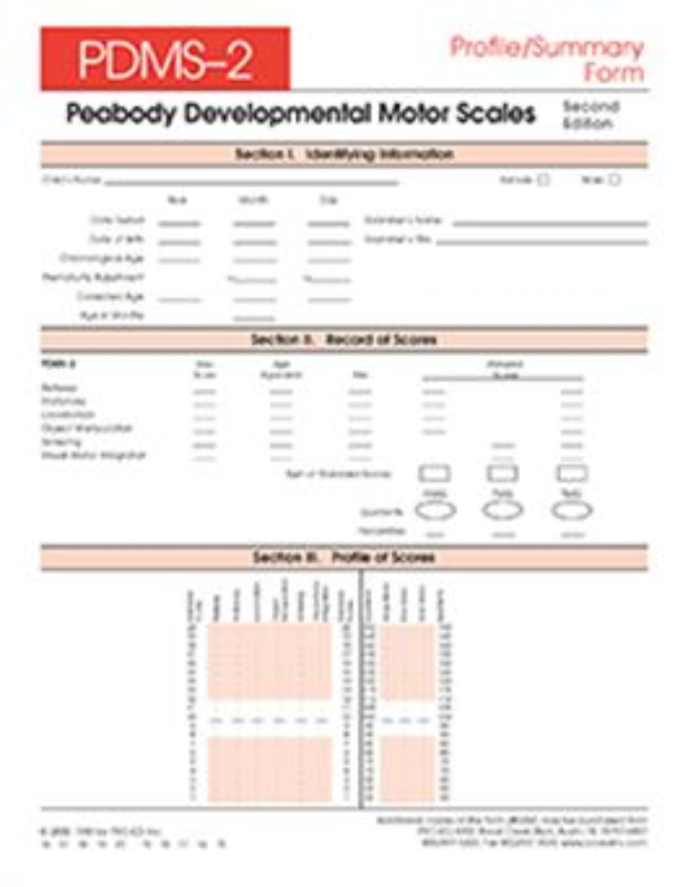 The PDMS-2 (Peabody Developmental Motor Scales - Second Edition) has been improved based on research and feedback from users. The package provides in-depth assessment and training of gross and fine motor skills for children from birth through six years of age. Six subtests: reflexes, stationary, locomotion, object manipulation, grasping and visual-motor integration (VMI) measure interrelated motor abilities and has been standardized on over 2,000 children.