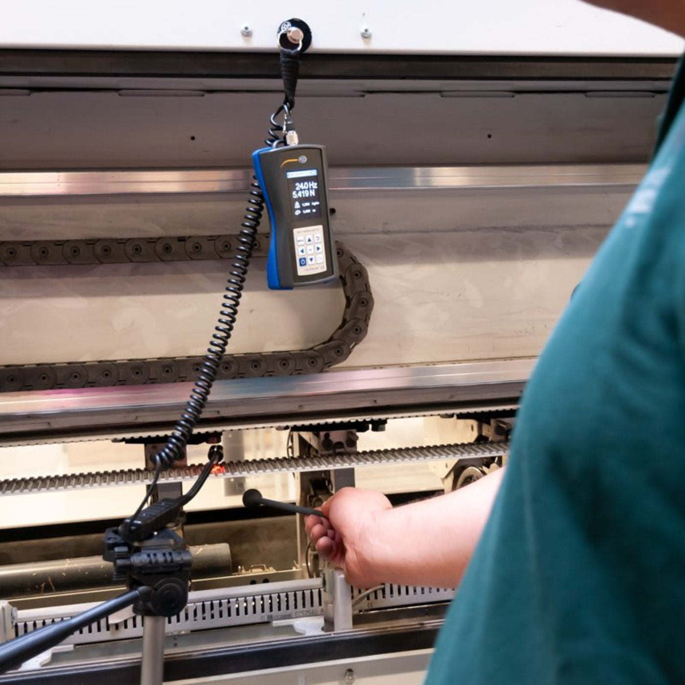A small impulse on the belt is sufficient to set the belt vibrating. The devise measures with the sensor the natural frequency of the belt generated in this way and visualizes it on the display. The meter can directly determine the actual tension (in Newton / Pound Force) of the belt from the belt frequency combined with the optionally entered belt length and belt mass. However, entering this data is not necessarily required in order to carry out the measurements directly with the belt tension measuring device. The measurement units in the device can be switched between N (SI unit) and pound force (US unit).