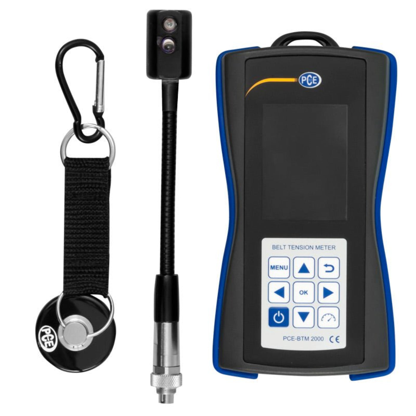 The PCE BTM 2000 Belt Tension Force Meter is an optically measuring maintenance tool for determining the belt tension force. It consists of a display device and a sensor head attached on a semi-flexible gooseneck. The advantage of the gooseneck is that the sensor head can be flexibly positioned. Due to the mobility of the gooseneck, the sensor can measure the strand force even in hard to reach places. The belt tension measuring device measures the belt tension (in Newton) and the belt frequency (in Hz) of the belt in the stationary state.