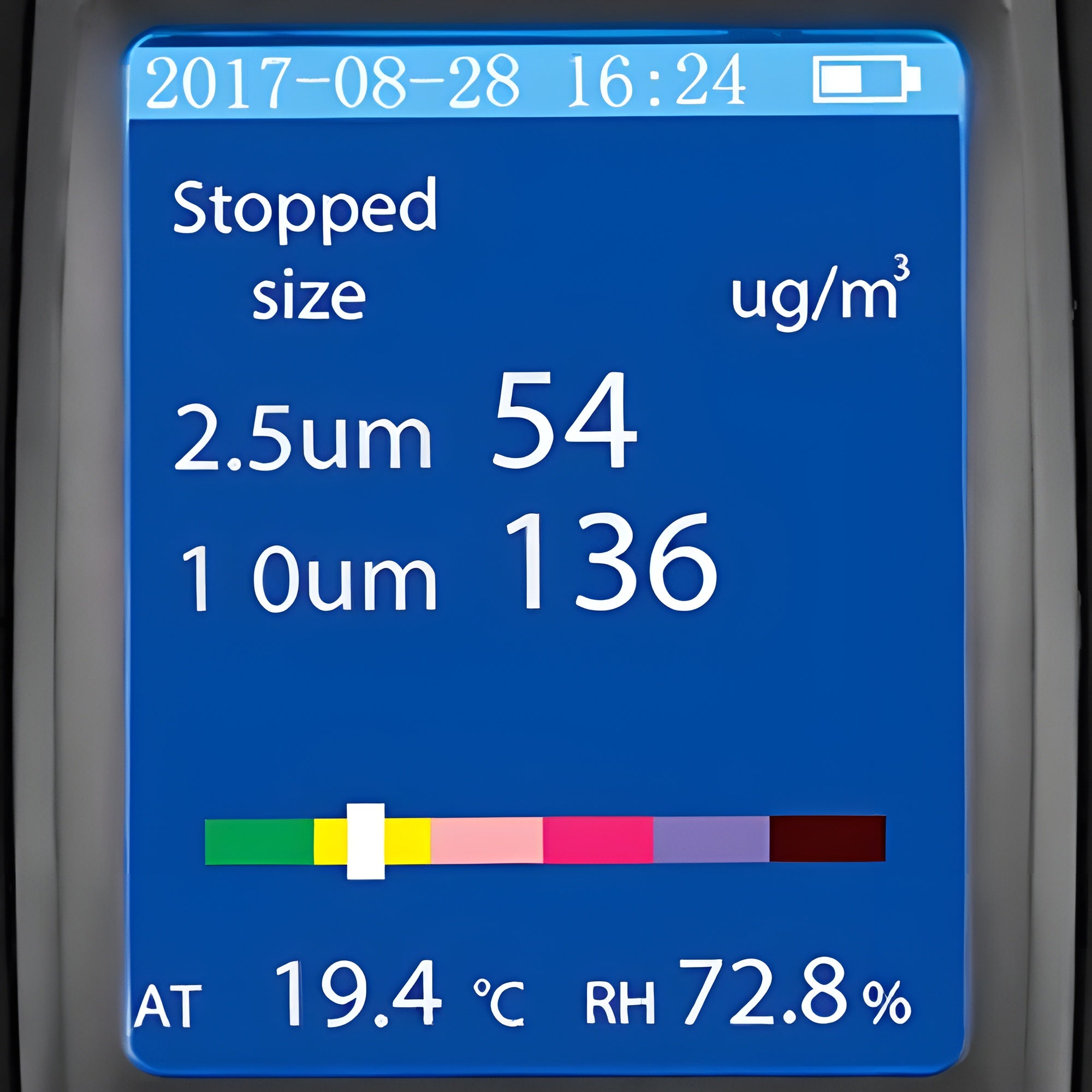 The particle counter displays all measurements simultaneously on the device's 2" full-color LCD screen. Temperature units can be shown in either degrees Celsius (°C) or Fahrenheit (°F). A scale below the measured values provides a visual warning via a band of colors increasing from green (safe) to violet (extreme danger). This visual color-coding system makes it easy to recognize when PM concentration levels become dangerous, allowing for quick action.
