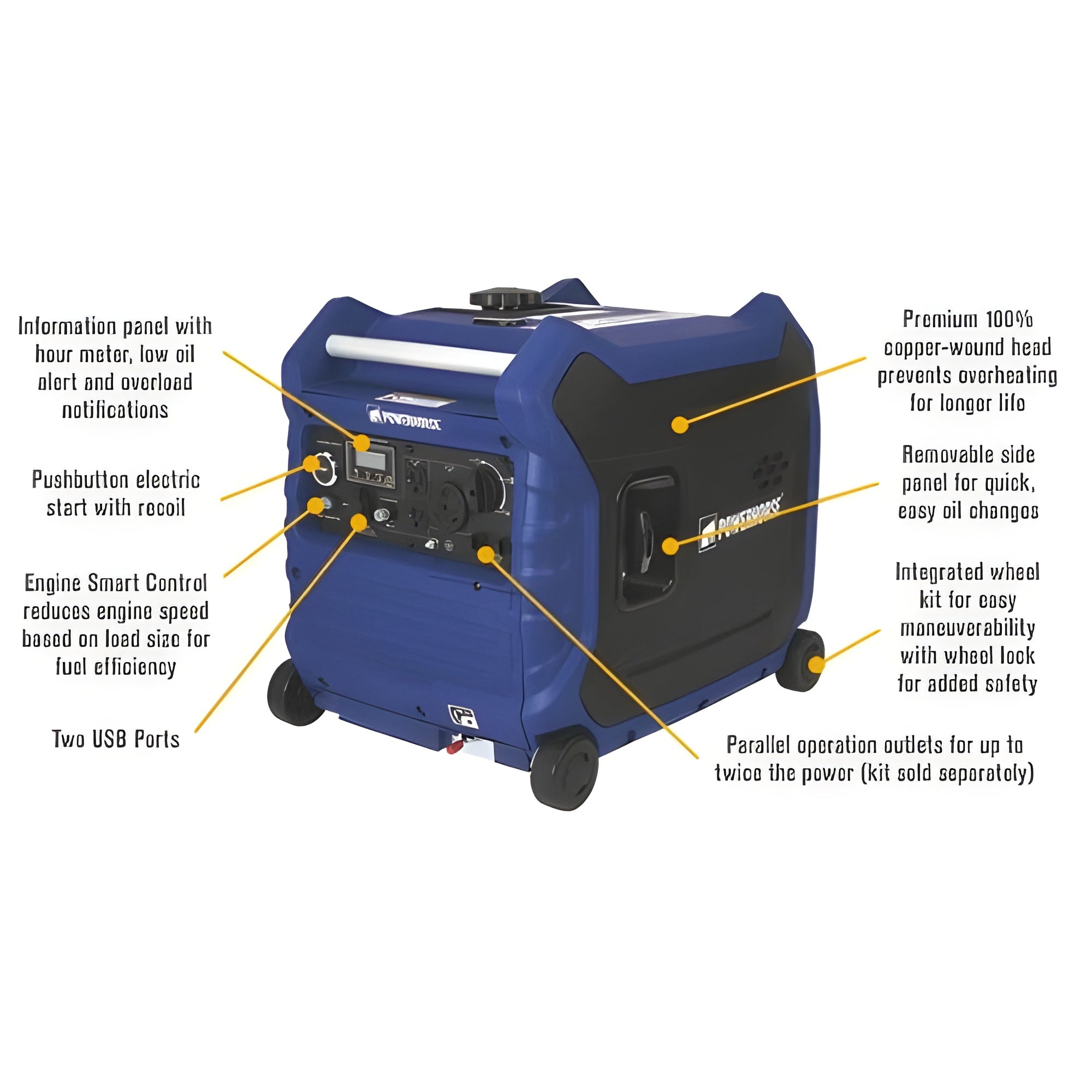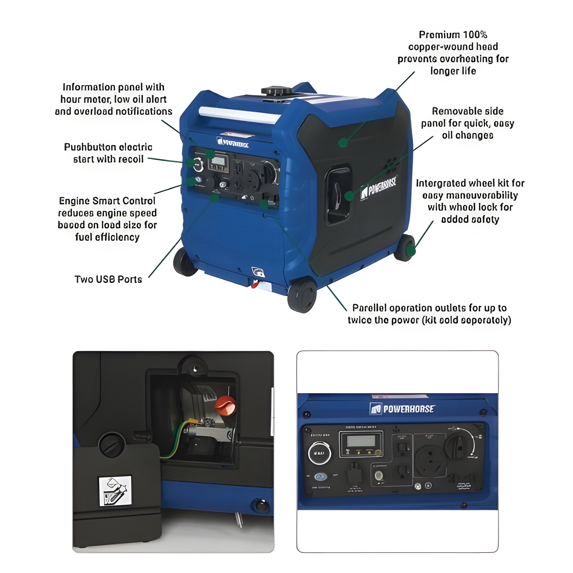 This Powerhorse Inverter Generator operates at an impressively quiet 57dB at 1/4 load, making it ideal for home use, camping, tailgating, and outdoor recreation. The parallel-ready design allows you to connect two Powerhorse units (4500 Watts) for up to twice the power, giving you flexibility and increased power options.