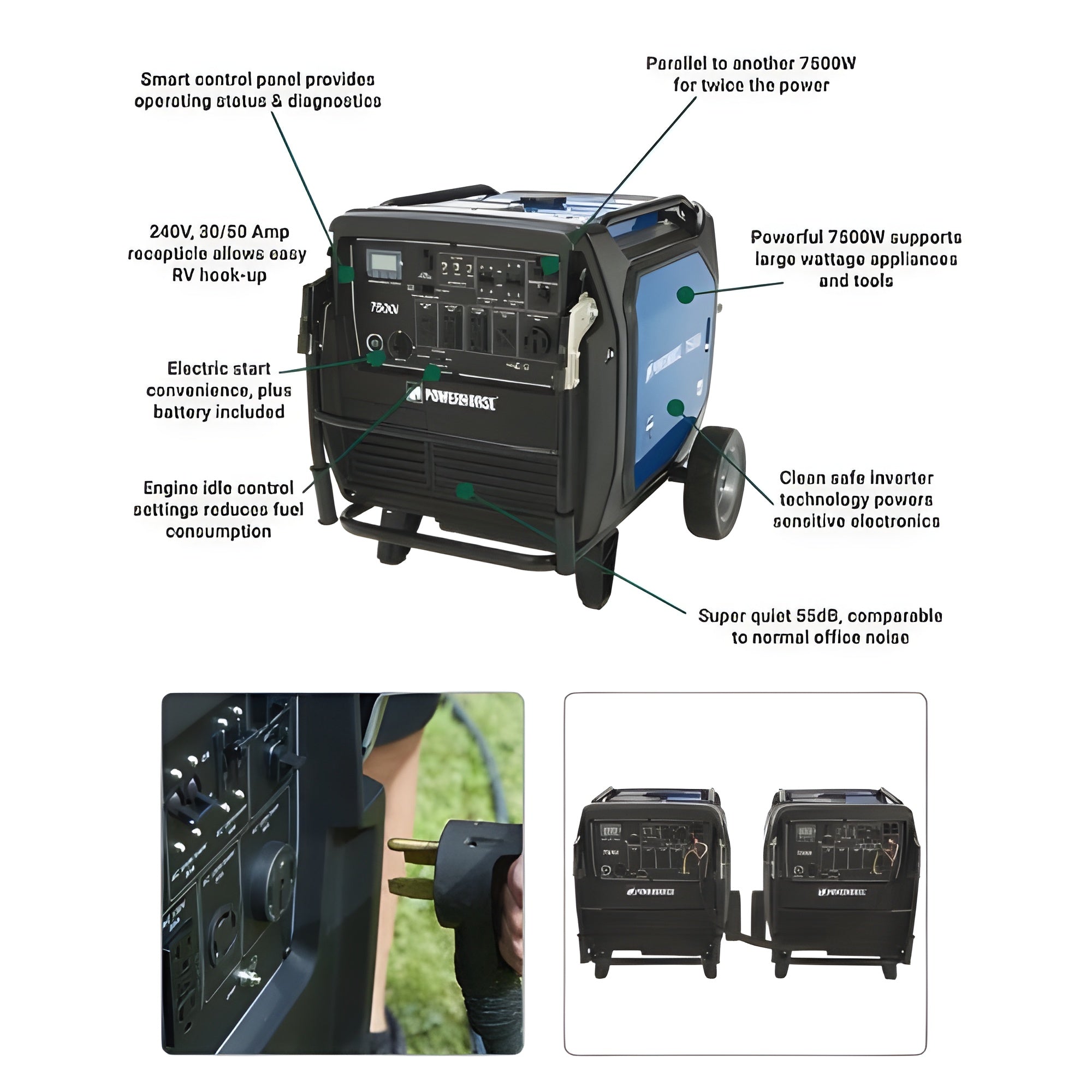 A: A high-performance inverter generator with 7500 surge watts and 6500 rated watts, featuring electric start and inverter technology for clean, stable power.