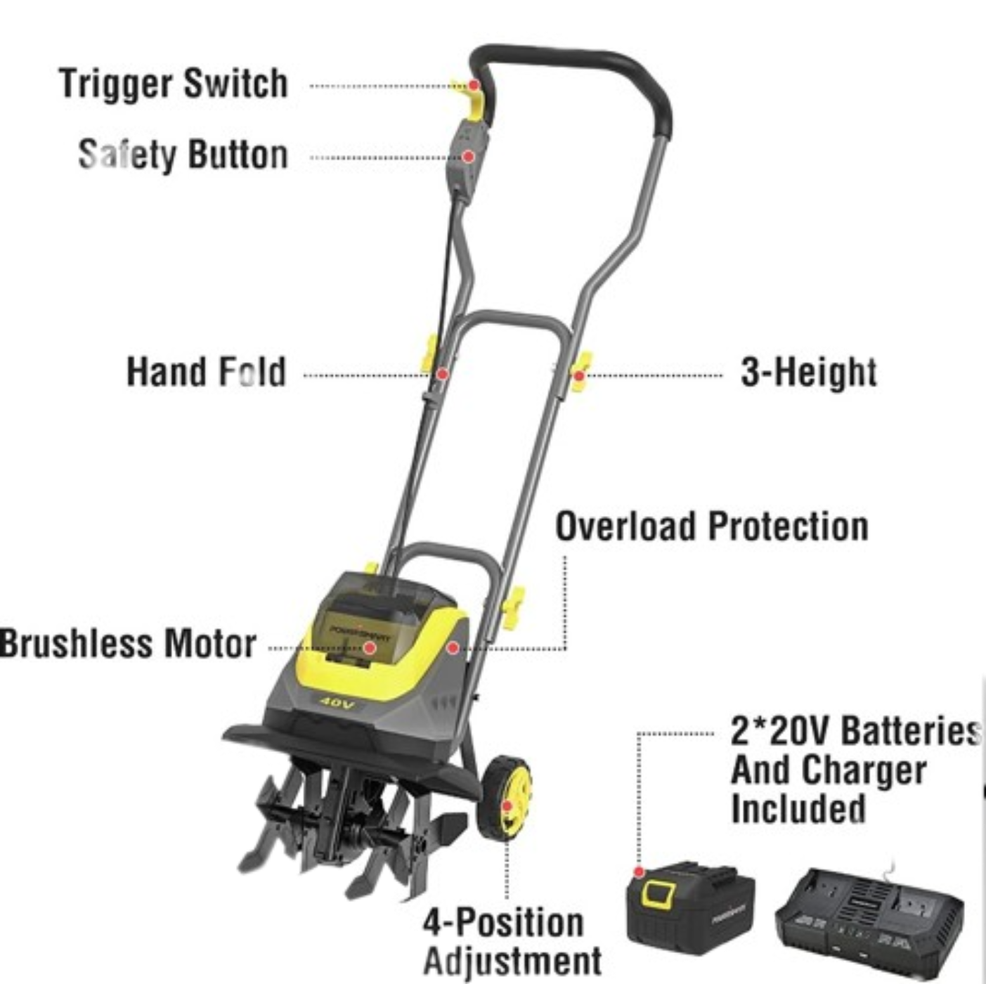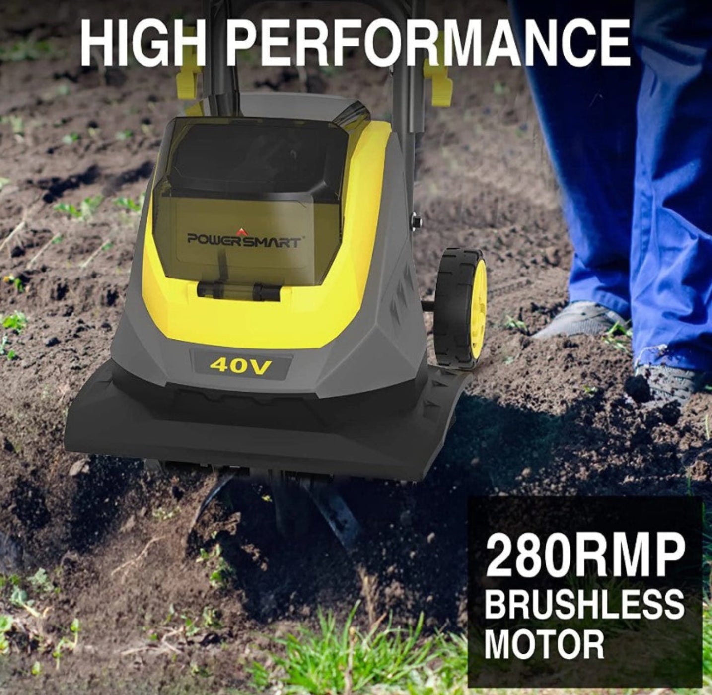 The Powersmart PS76221A is a powerful gardening tool that will help you get the job done quickly and efficiently. With its brushless motor, it offers 180RPM No Load Speed and up to 40 minutes of runtime. The wheel adjustment settings allow for a maximum tilling depth of 7.8-inches and a maximum tilling width of 11.8-inches. Added safety measures include a Safety Button and Overload Protection.