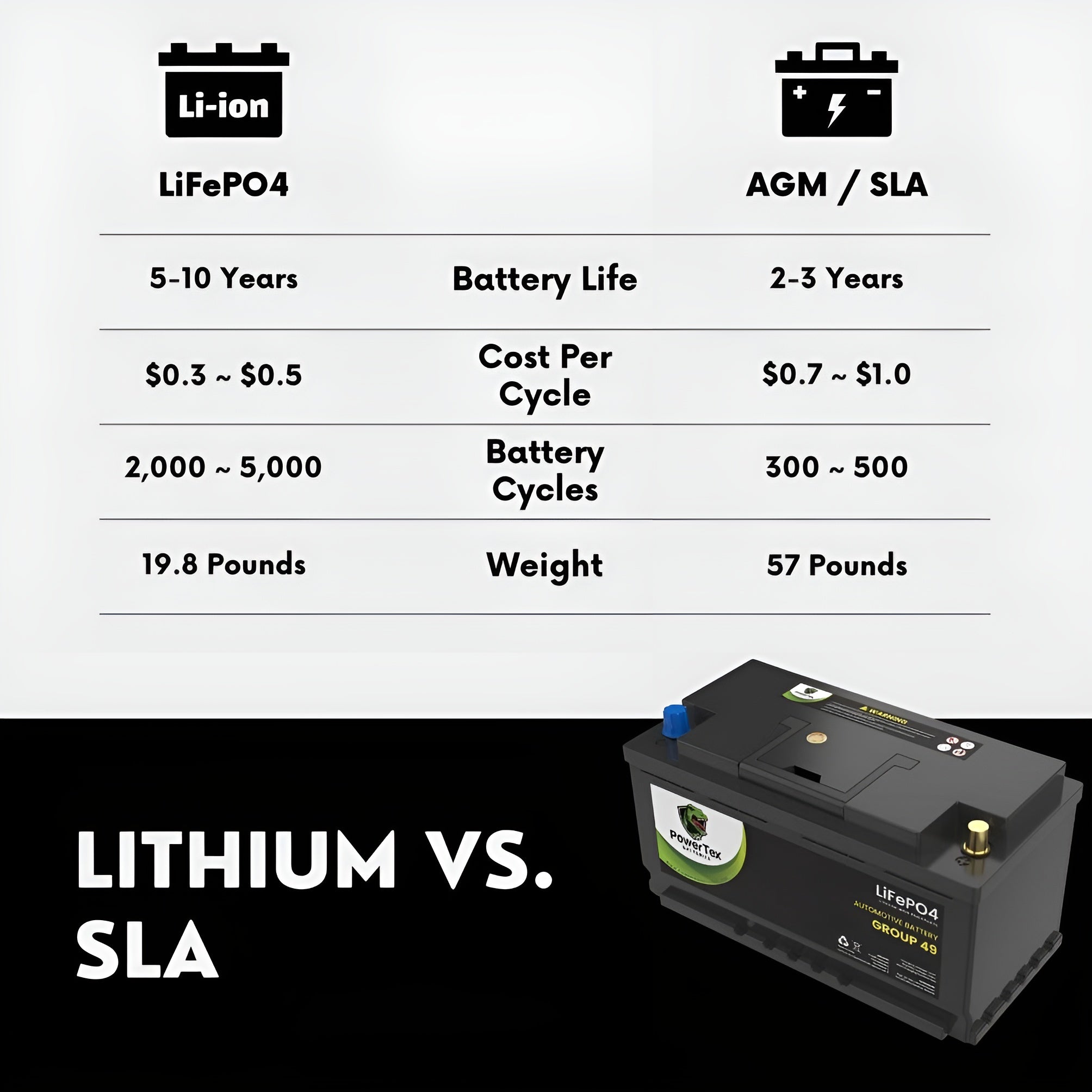 A: The PowerTex PTLG49 uses LiFePO4 (Lithium Iron Phosphate) technology, offering longer life, faster charging, and lighter weight compared to traditional lead-acid batteries.