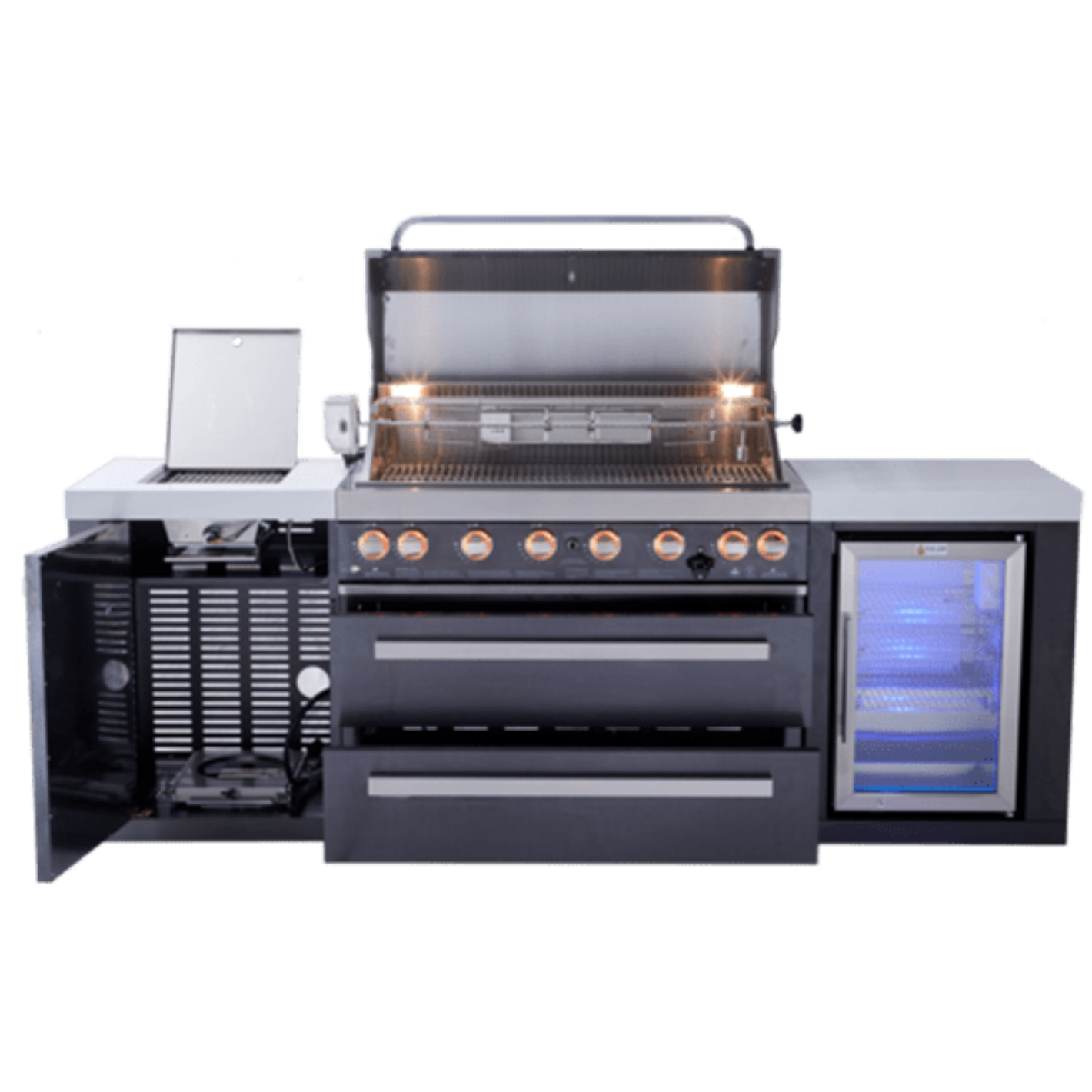 A: It typically includes a premium stainless-steel grill, side burners, storage cabinets, and a spacious countertop for food preparation.