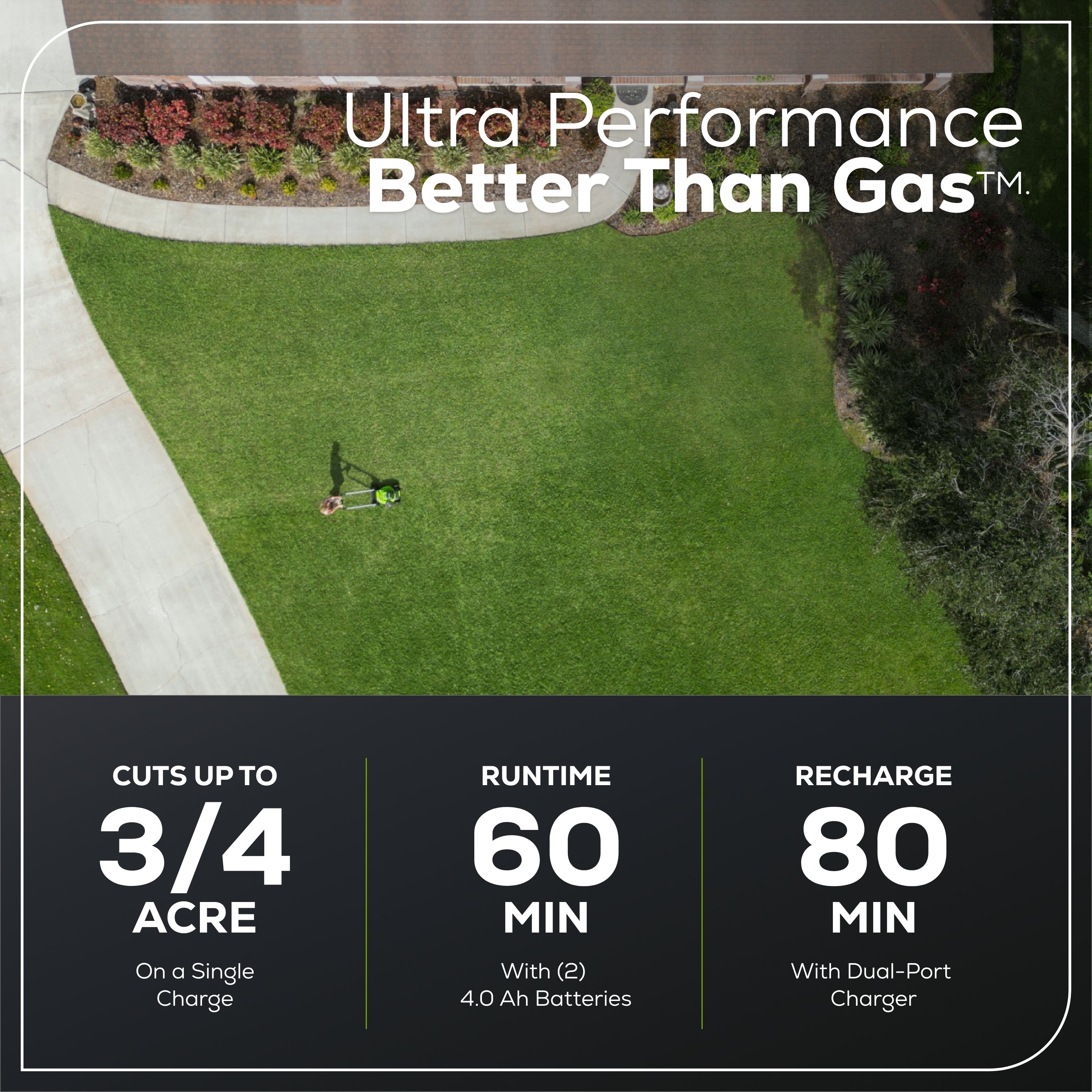 Runtime: Up to 1 hour or 3/4 acre. Charge Time: 80 minutes with included charger.