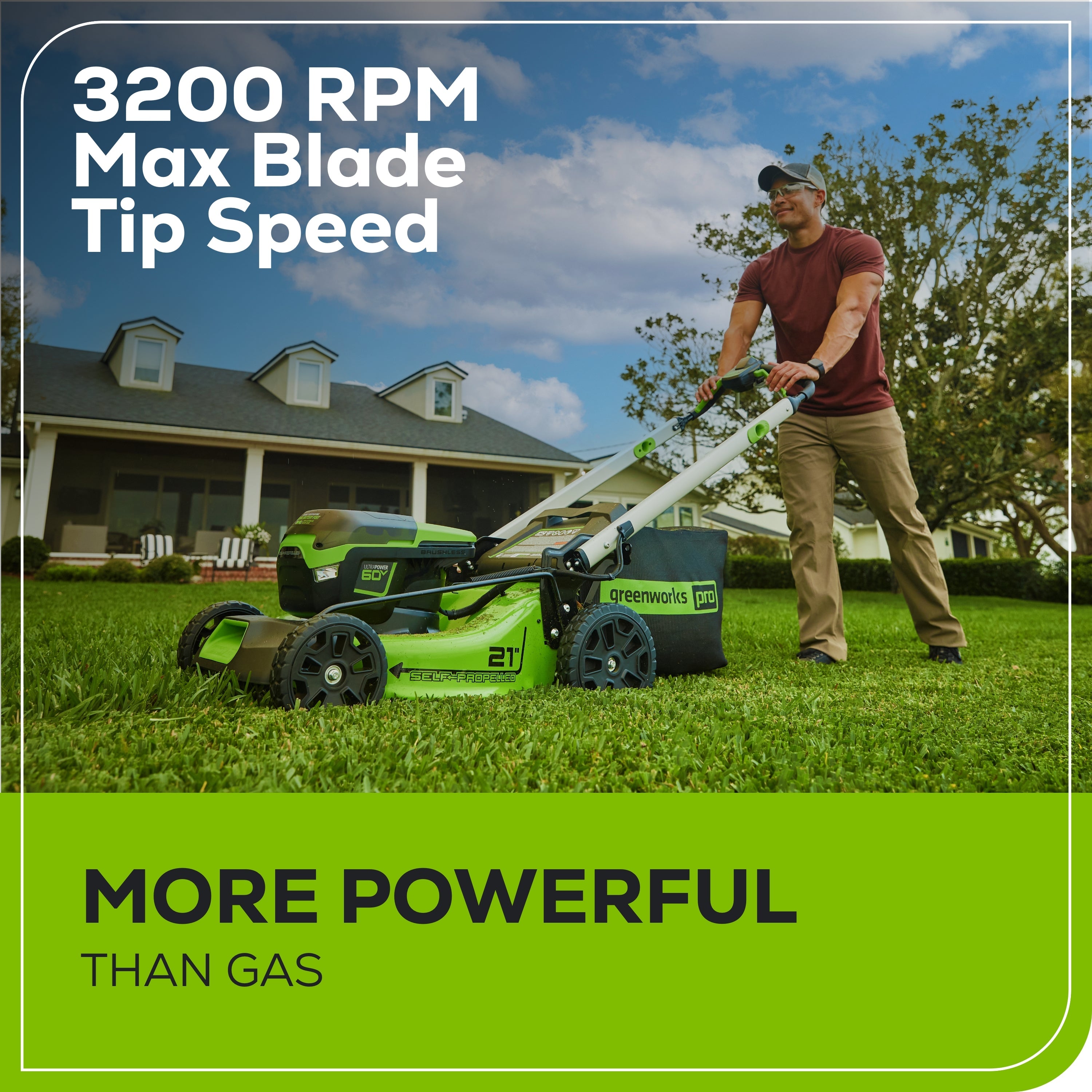 The Greenworks 60V Self-Propelled mower features the most advanced power-cutting system in the industry. Where gas mowers bog down, our mowers sense extreme conditions to send optimal power to the blade motors, maintaining consistent blade speeds of 2,800-3,200 RPM through tall, thick, and wet grass.