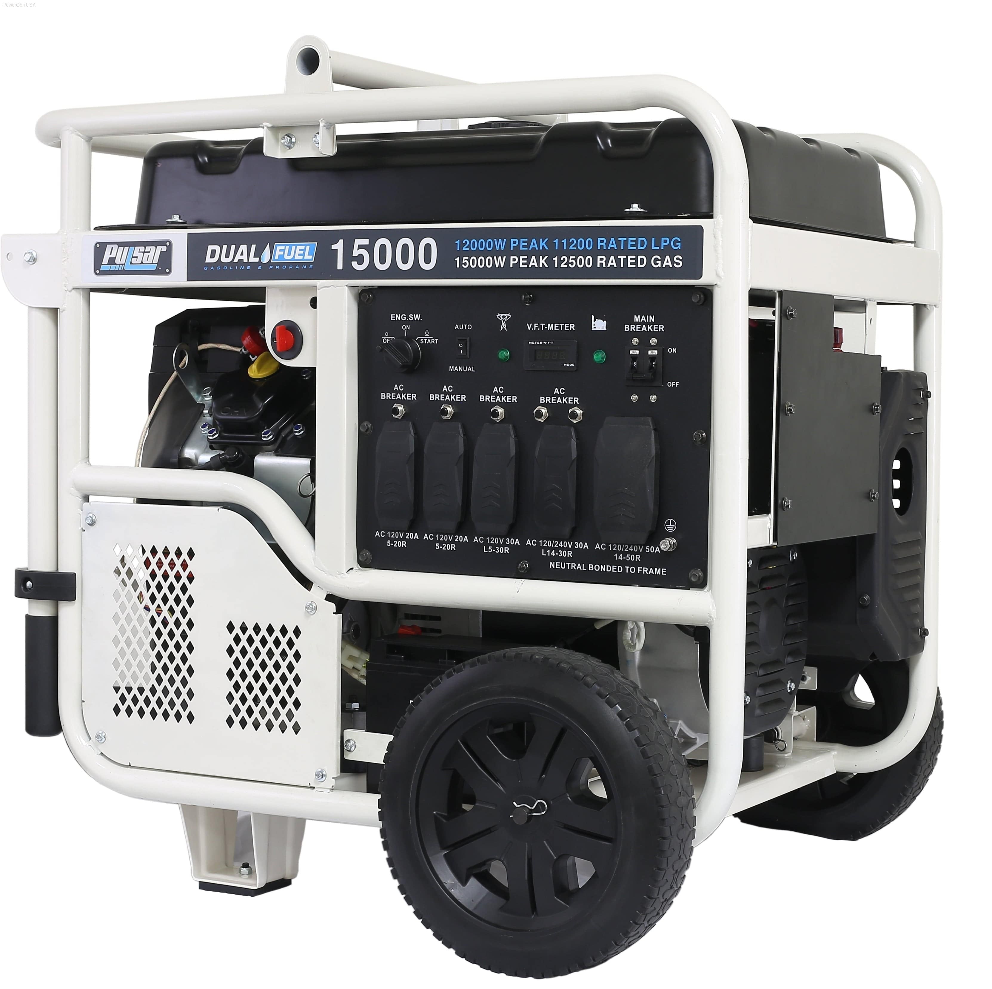 Pulsar’s PG15KVTWB Dual Fuel Portable Generator was built to keep you out of the dark during power outages. The dual fuel feature with the ability to run on gasoline or propane provides you with more options and peace of mind in the event of a power outage. Its 713cc, V-Twin, 4-stroke, OHV engine produces 15,000 Peak Watts/12,000 Running Watts Gasoline and 13,500 Peak Watts/11,000 Running Watts Propane. The extended run time and high output make it an ideal source of backup power for running large appliances and other electrical loads, so you can comfortably weather the storm.