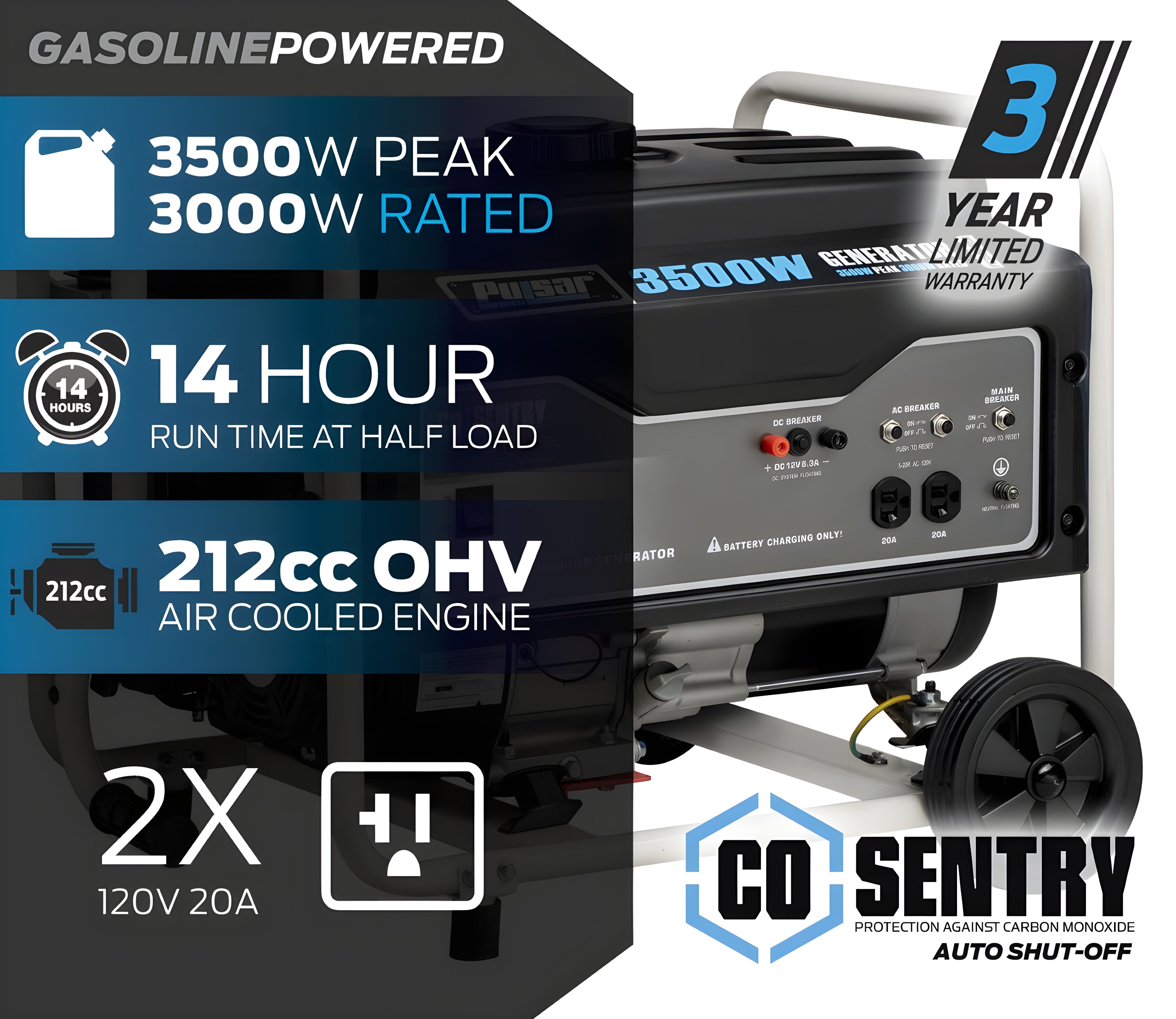 With a four-gallon fuel tank, the PG3500MRCO offers up to 14 hours of run time at half load. Its control panel is fitted with two 120V outlets for your standard plugs and one 12V DC output for battery charging. And, starting the generator is a breeze thanks to the reliable recoil start.