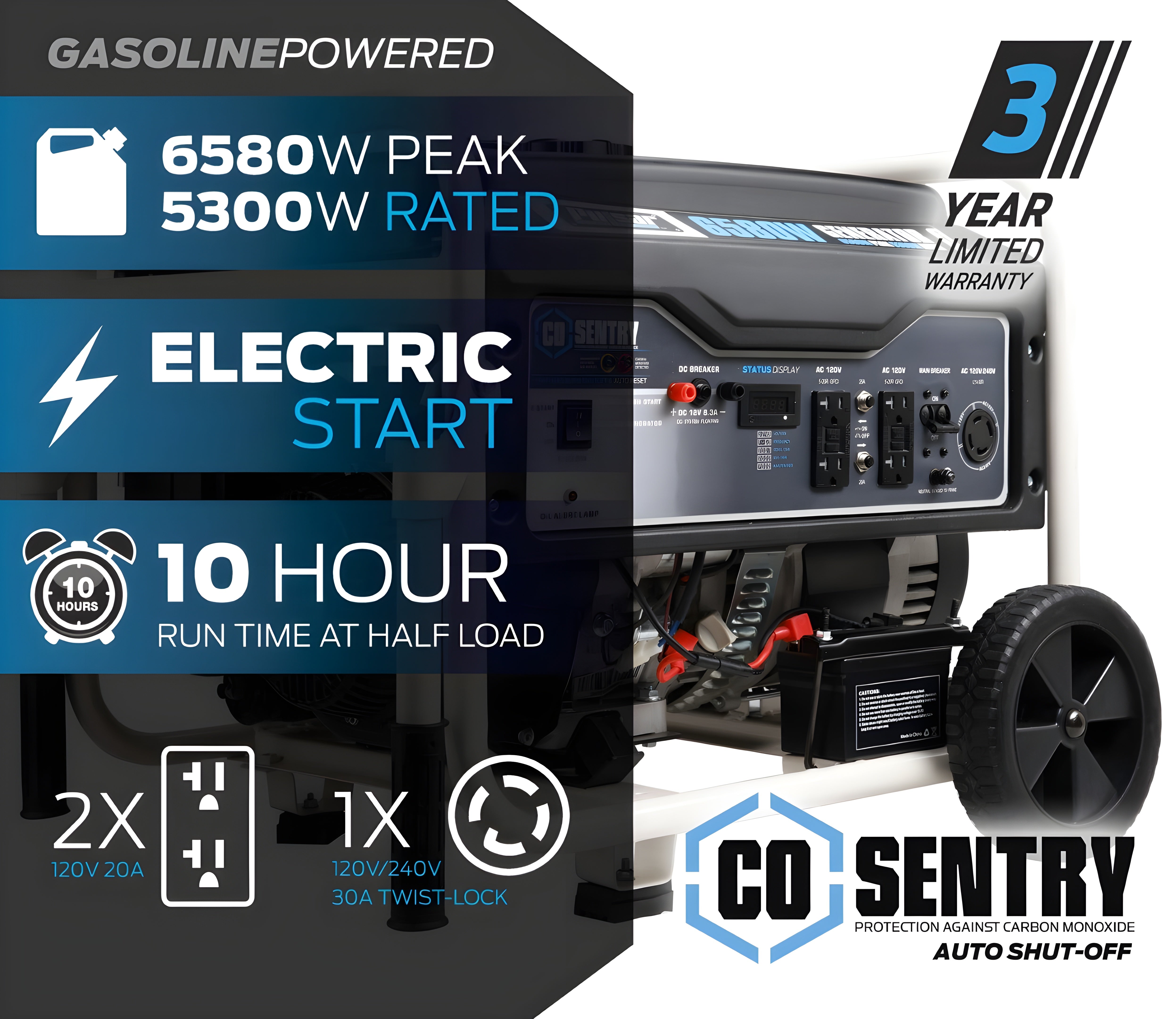 A: A powerful 6,580W gasoline-powered generator with CO Shutdown Sensor for safety, perfect for home backup, outdoor activities, and job sites.