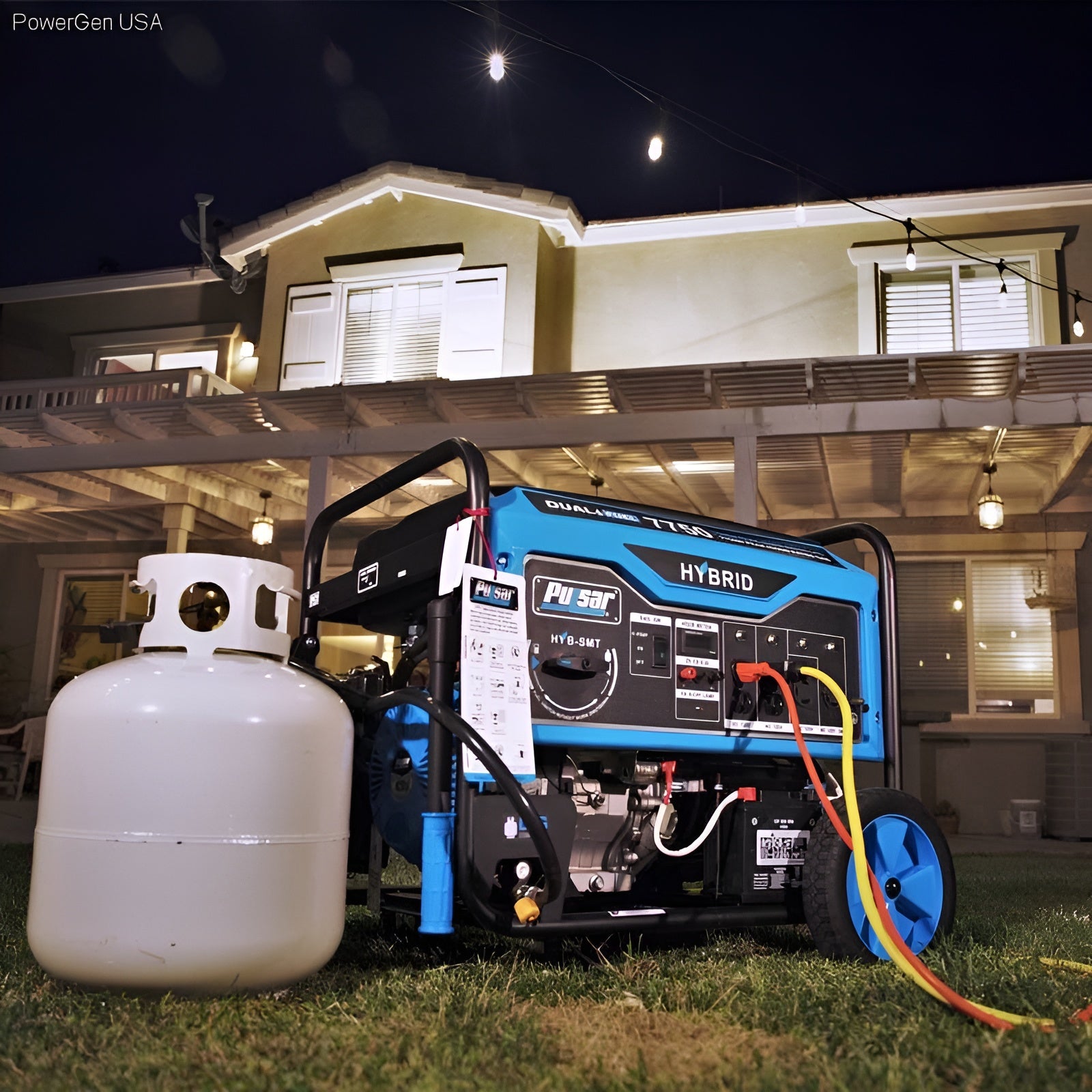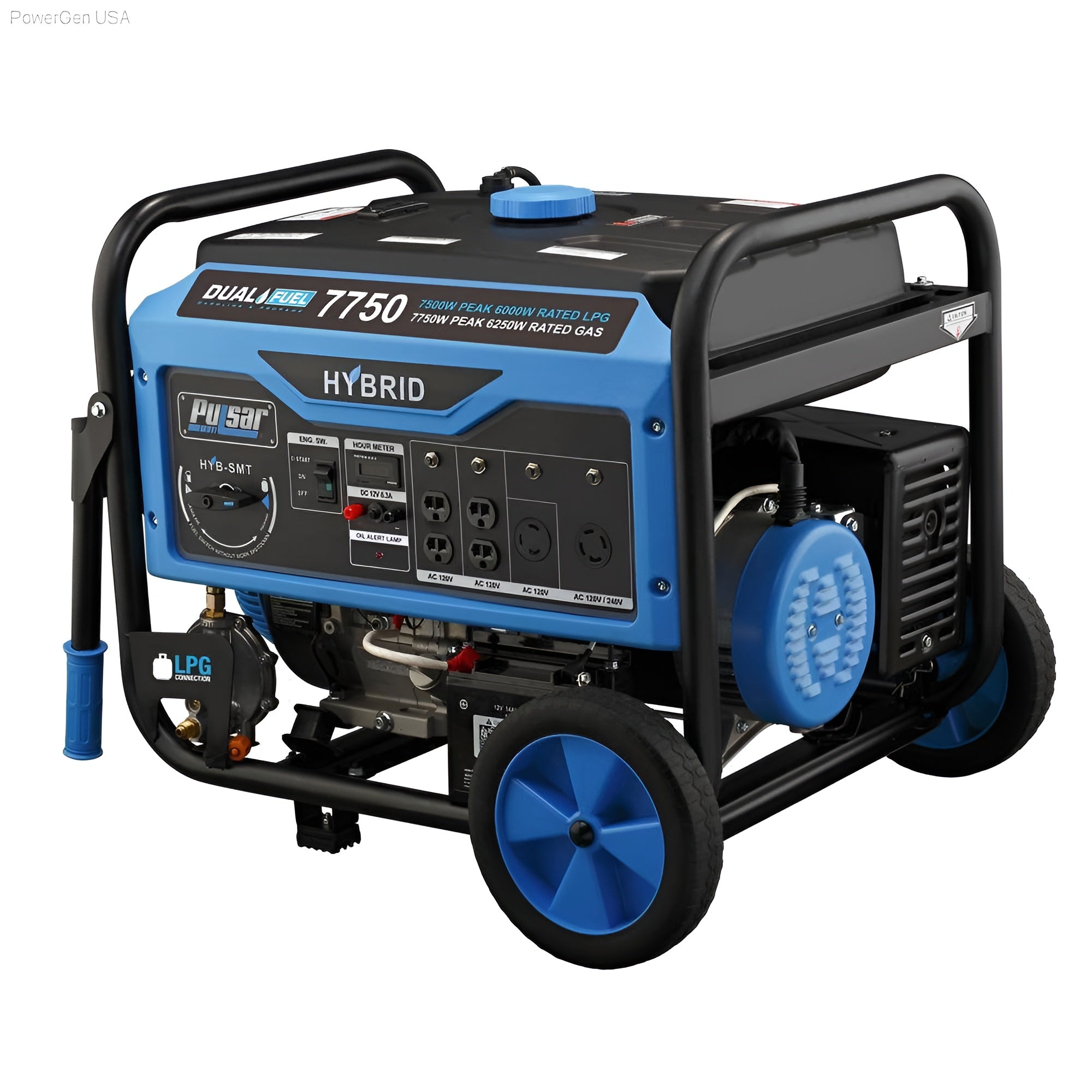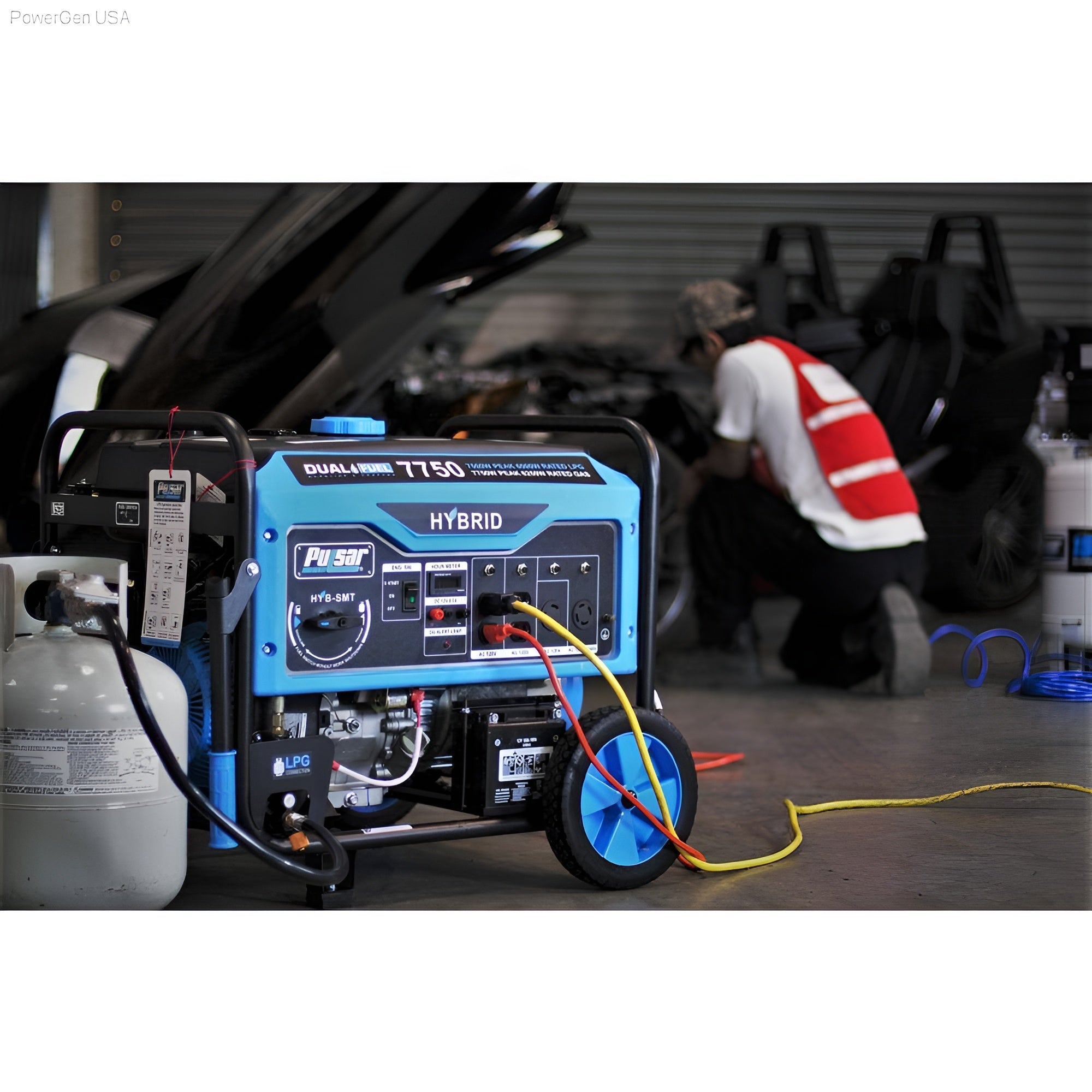 When you need the convenience of portability and the power to perform, the Pulsar PG7750B dual fuel generator is a strong candidate for satisfying your power needs. The dual fuel feature gives it the ability to run on gasoline or liquid propane to provide you with more options and peace of mind in the event of a power outage or natural disaster. Its patented Switch & Go technology allows you to switch from LPG to gas or gas to LP while the generator is running. This generator is ideal for the job site, home use and outdoor activities. Designed with a strong powder coat steel frame, no-flat tires, fold-down locking handle, electric start and cutting-edge technology, this unit makes an outstanding addition to anyone's assortment of must-have portable power.