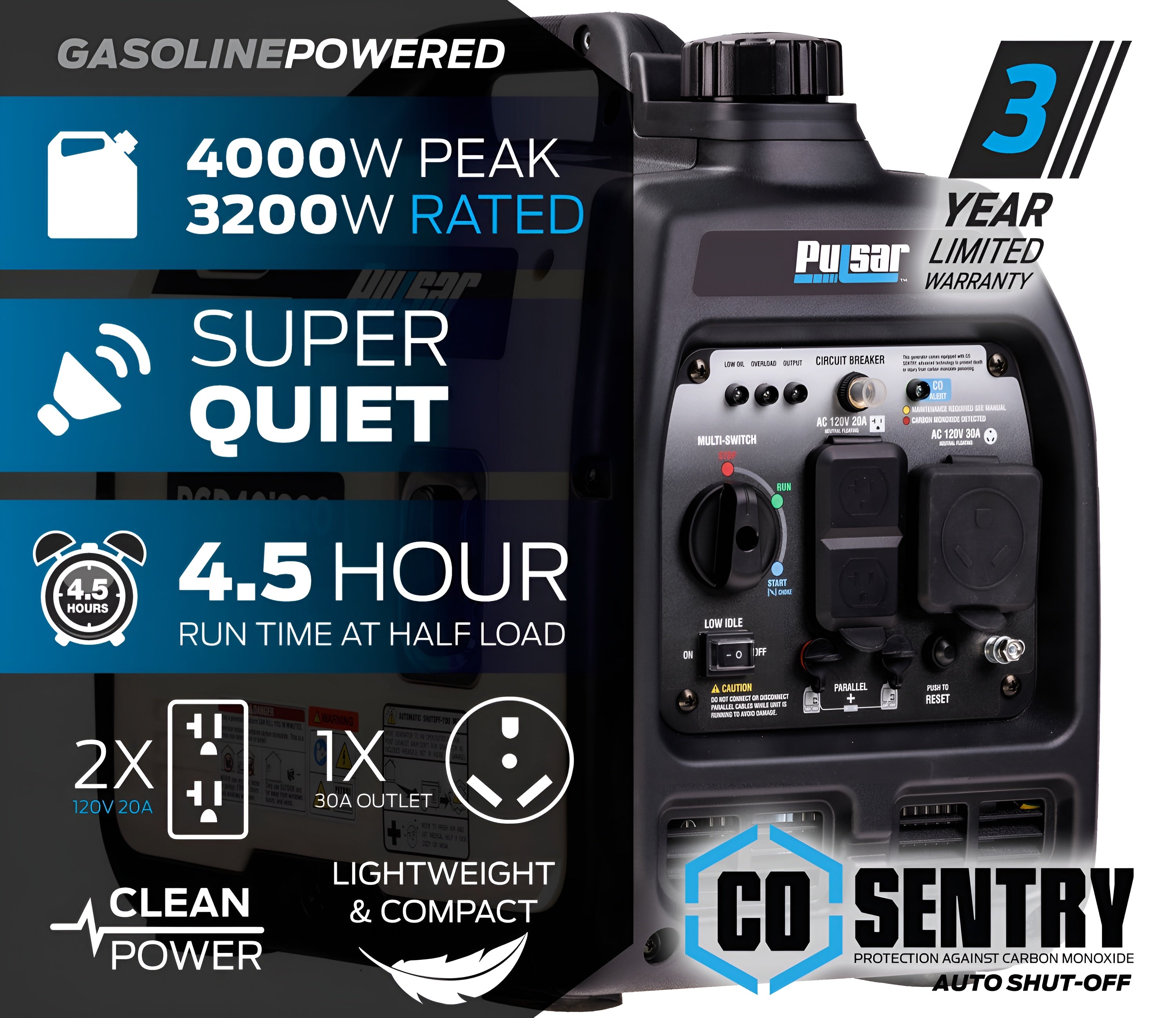 Whether you’re looking for a portable generator for camping, tailgating, or emergency backup power, the Pulsar PGD40iSCO is an excellent choice. With its reliable 145cc OHV air-cooled recoil start engine and one-gallon fuel tank, it provides up to 4.5 hours of runtime at half load. And with its two standard 120V 20-amp outlets and one 120V 30-amp RV outlet, you can power a variety of devices and appliances.