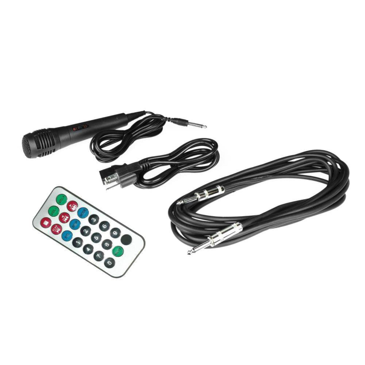This kit includes an active speaker, passive speaker, 2 stands, wired microphone, remote control, and power cable.