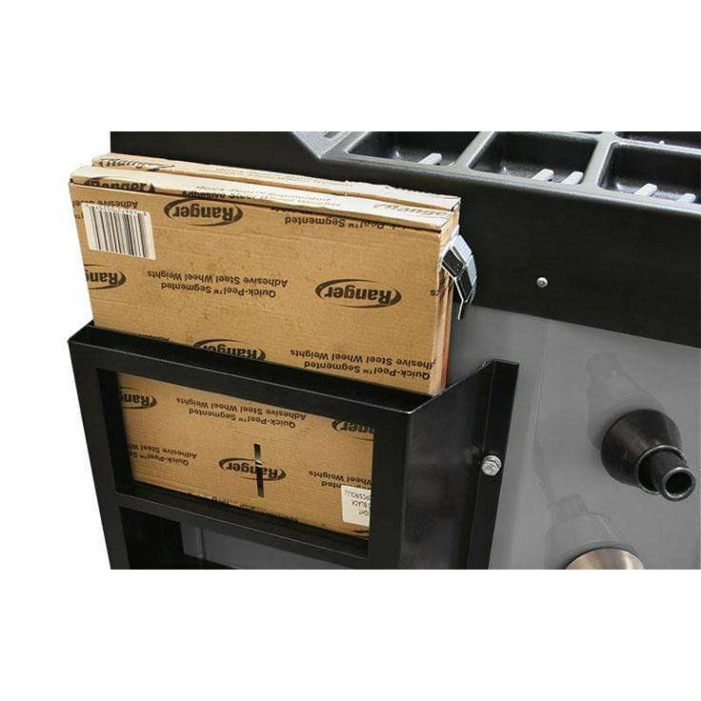 Newly designed side shelf features an open-top design that accommodates Ranger Quick-Peel™ adhesive tape weight. These weights are sold separately in convenient bulk rolls.