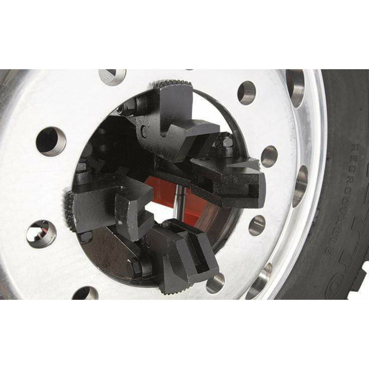 Secure Clamping: Self-centering hydraulic clamping chuck and hydraulically operated spreader jaws provide secure clamping for a wide variety of rims and off-road wheels