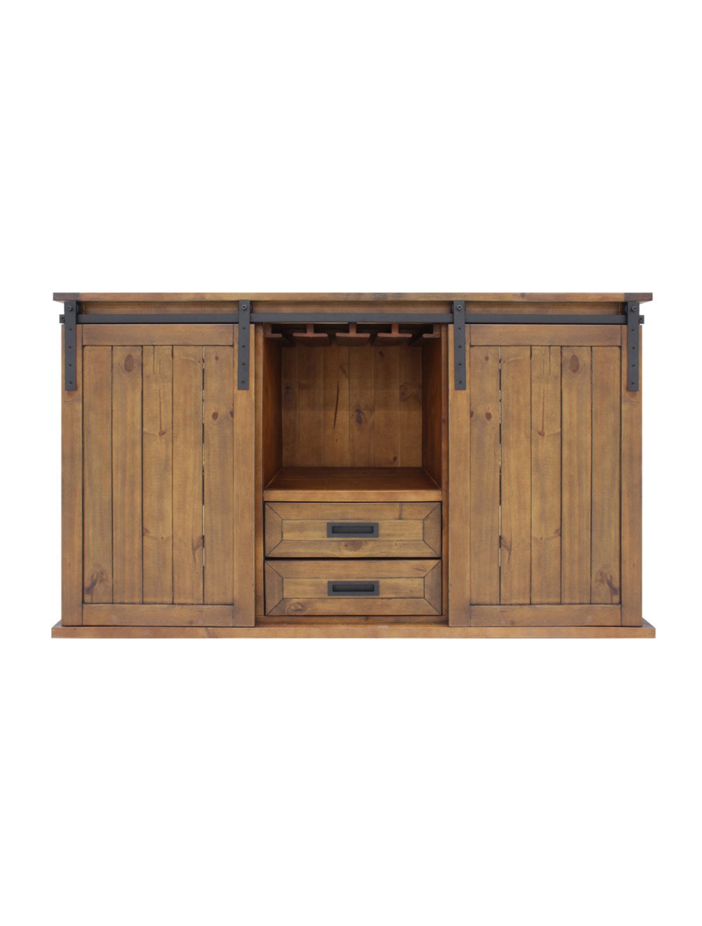 - Barn style doors slide to reveal your storage for a tall wine cooler, glassware and accessories