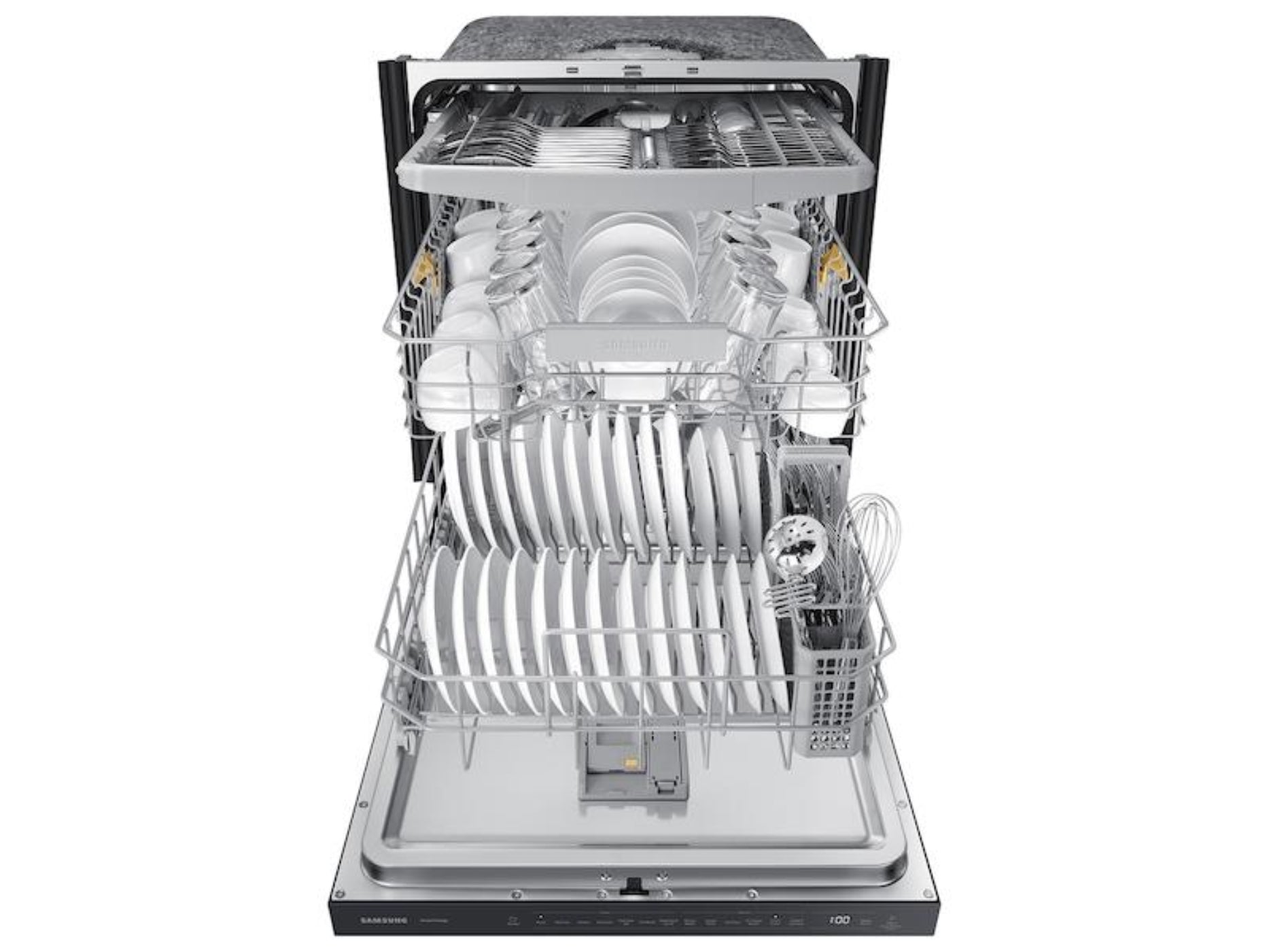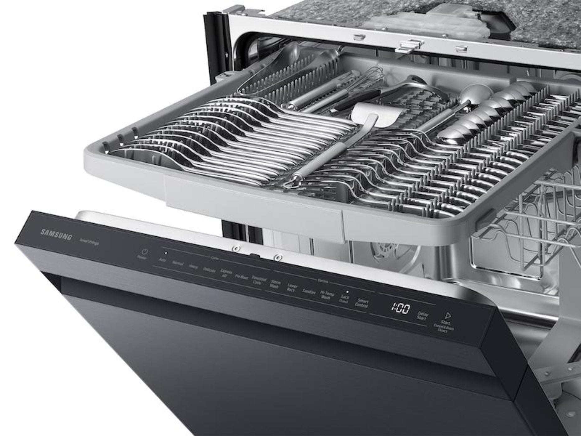 A: It’s a 46 dBA AutoRelease smart dishwasher in matte black steel with StormWash technology for powerful, efficient cleaning.