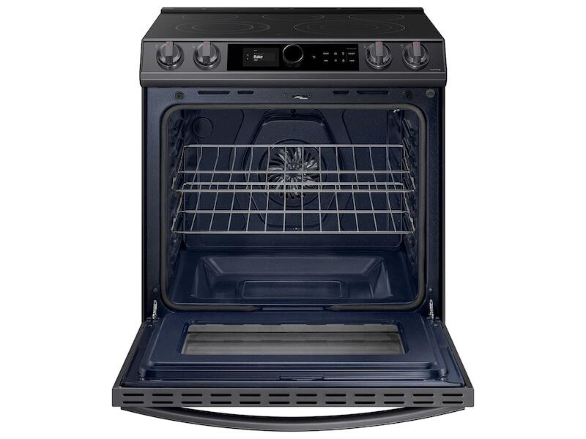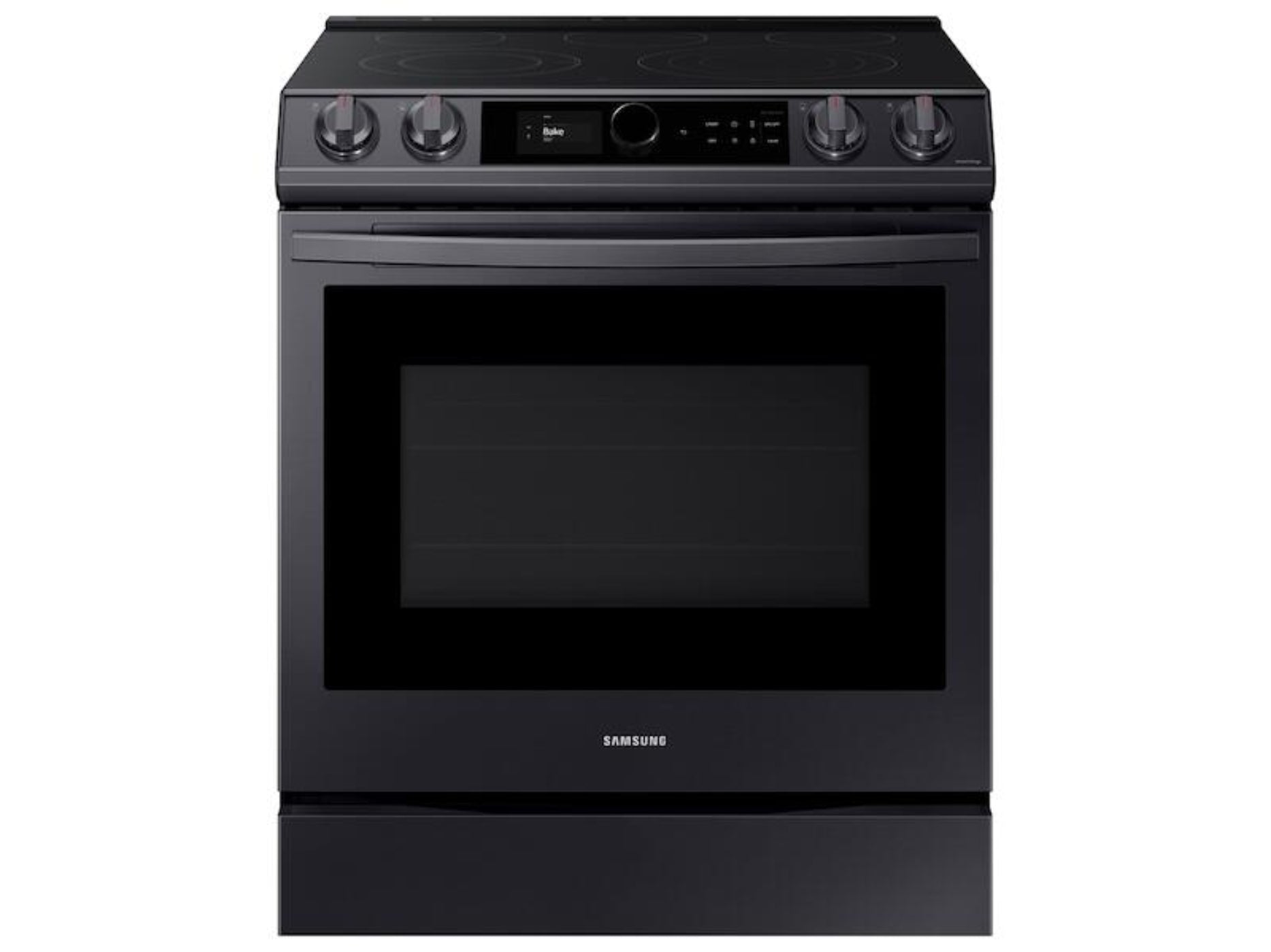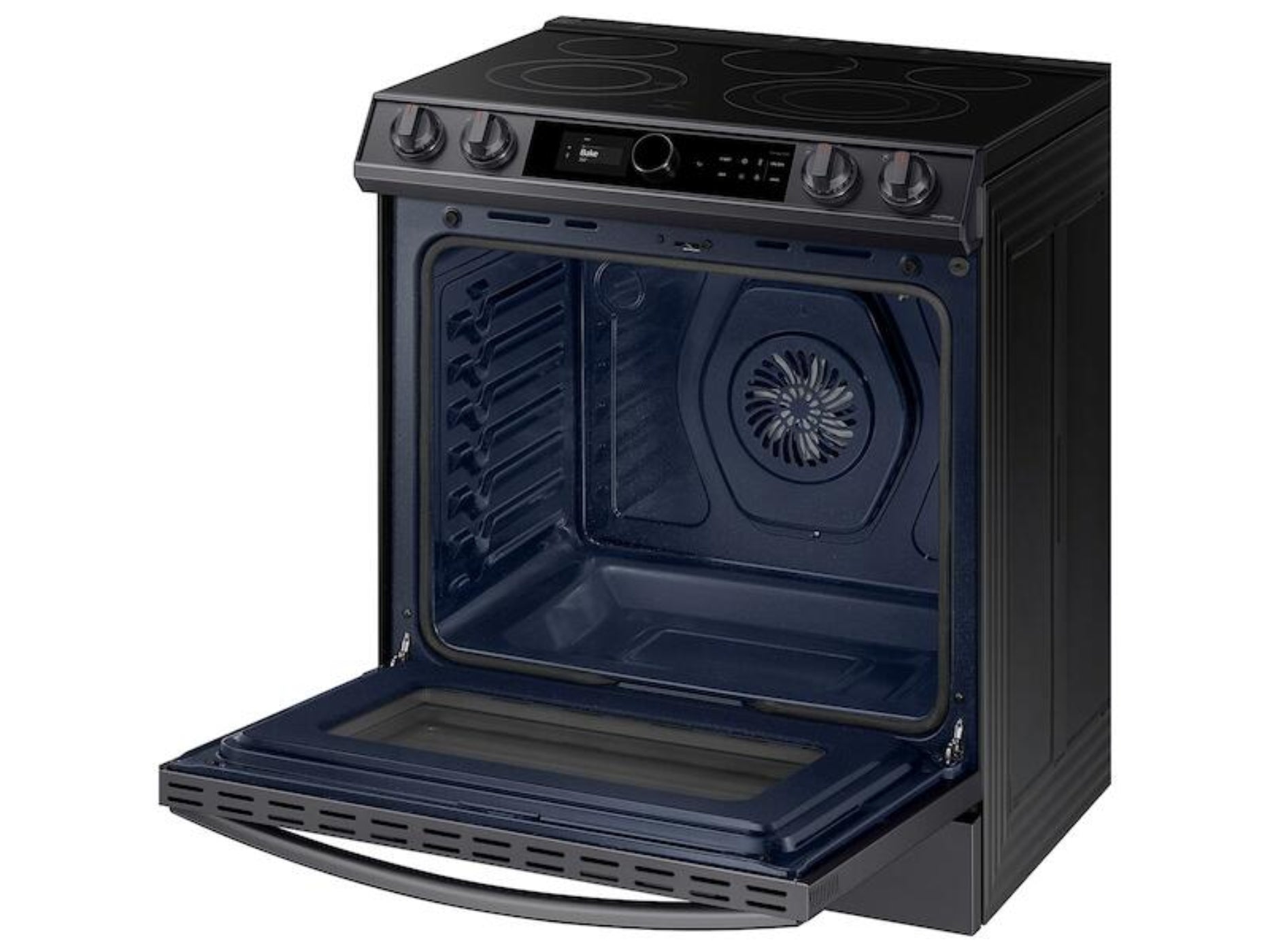 A: This 6.3 cu. ft. smart slide-in electric range features Smart Dial, Air Fry, True Convection, Rapid Boil™, and Wi-Fi connectivity, all in a sleek black stainless steel finish.