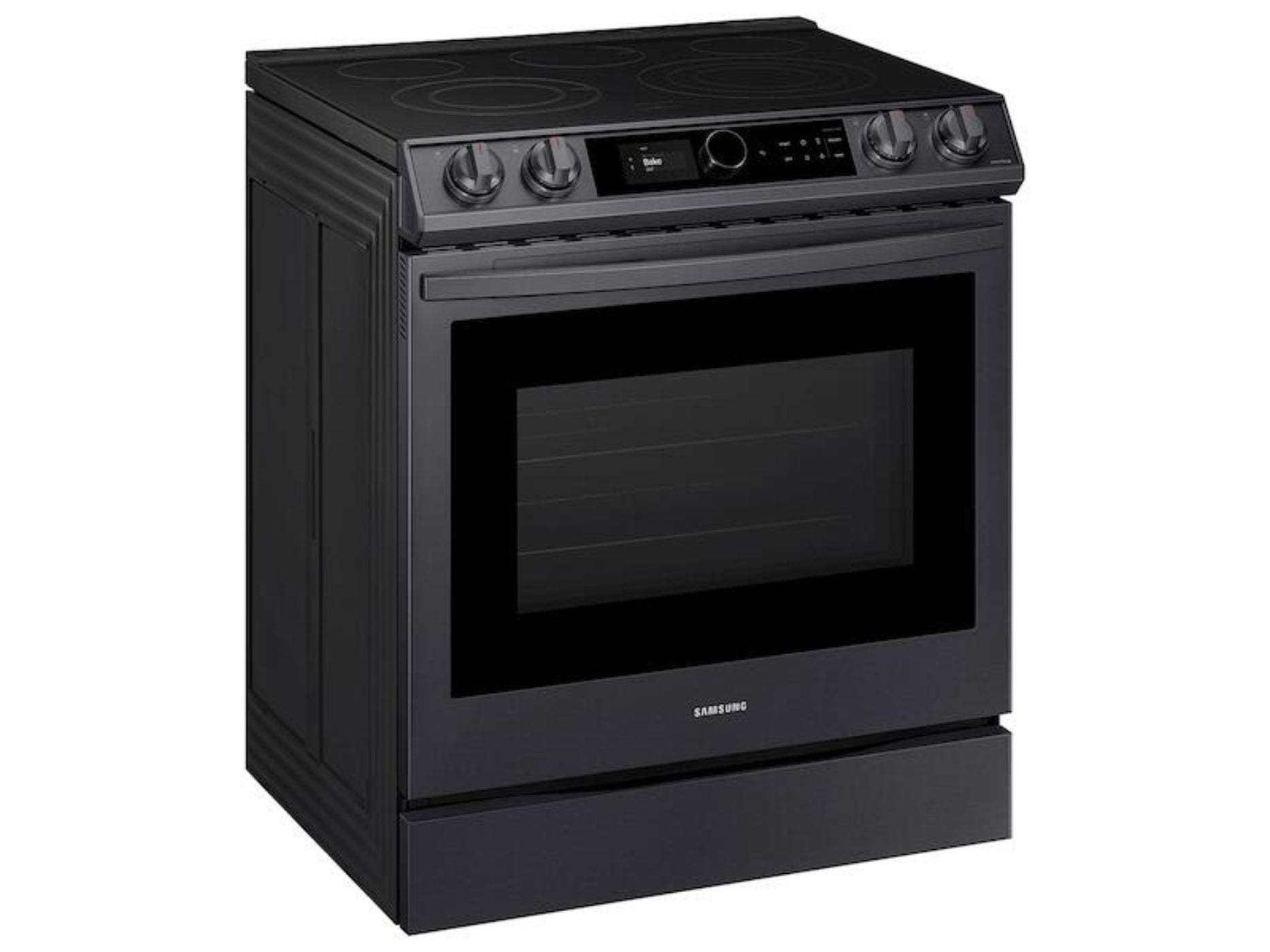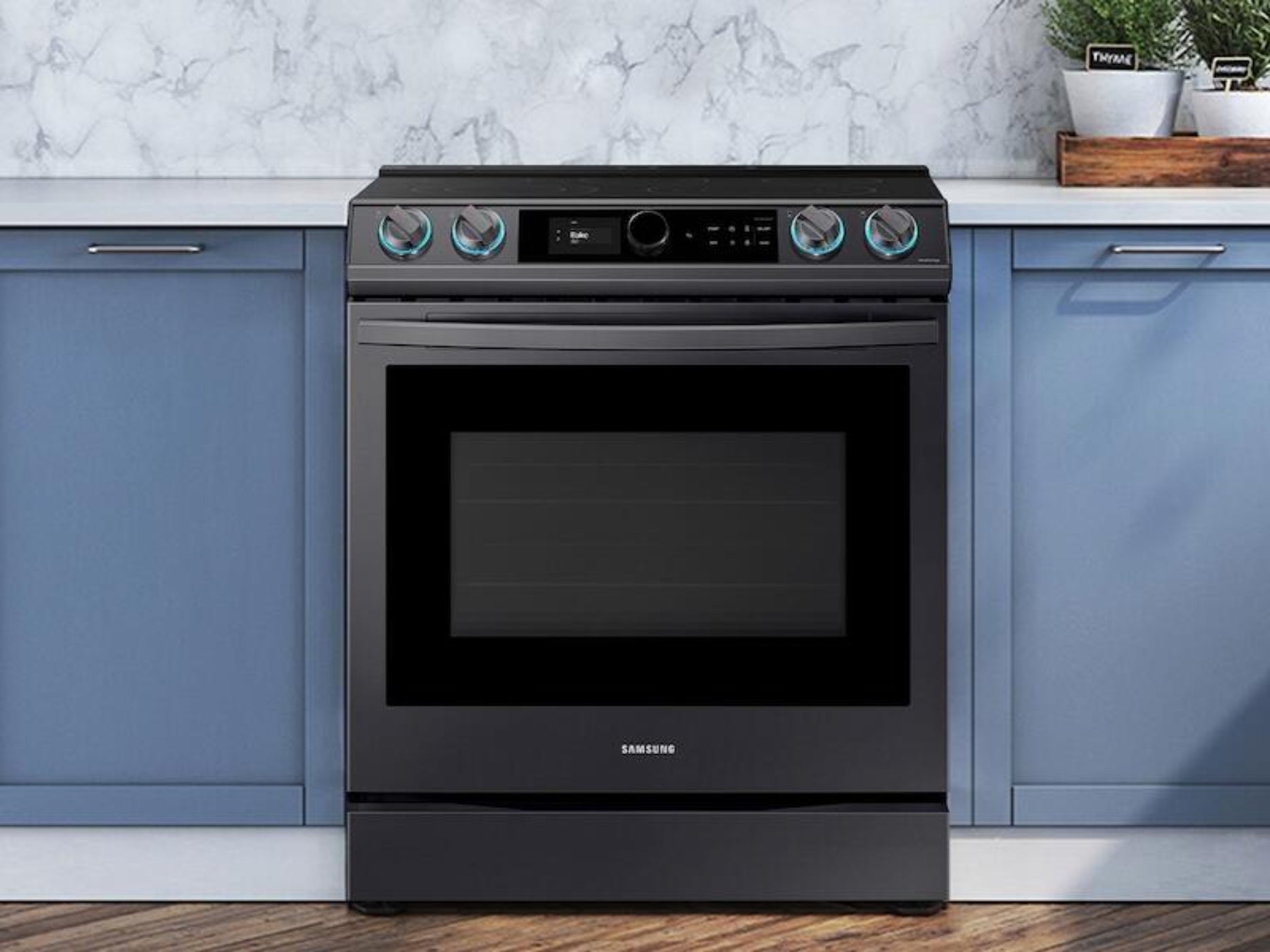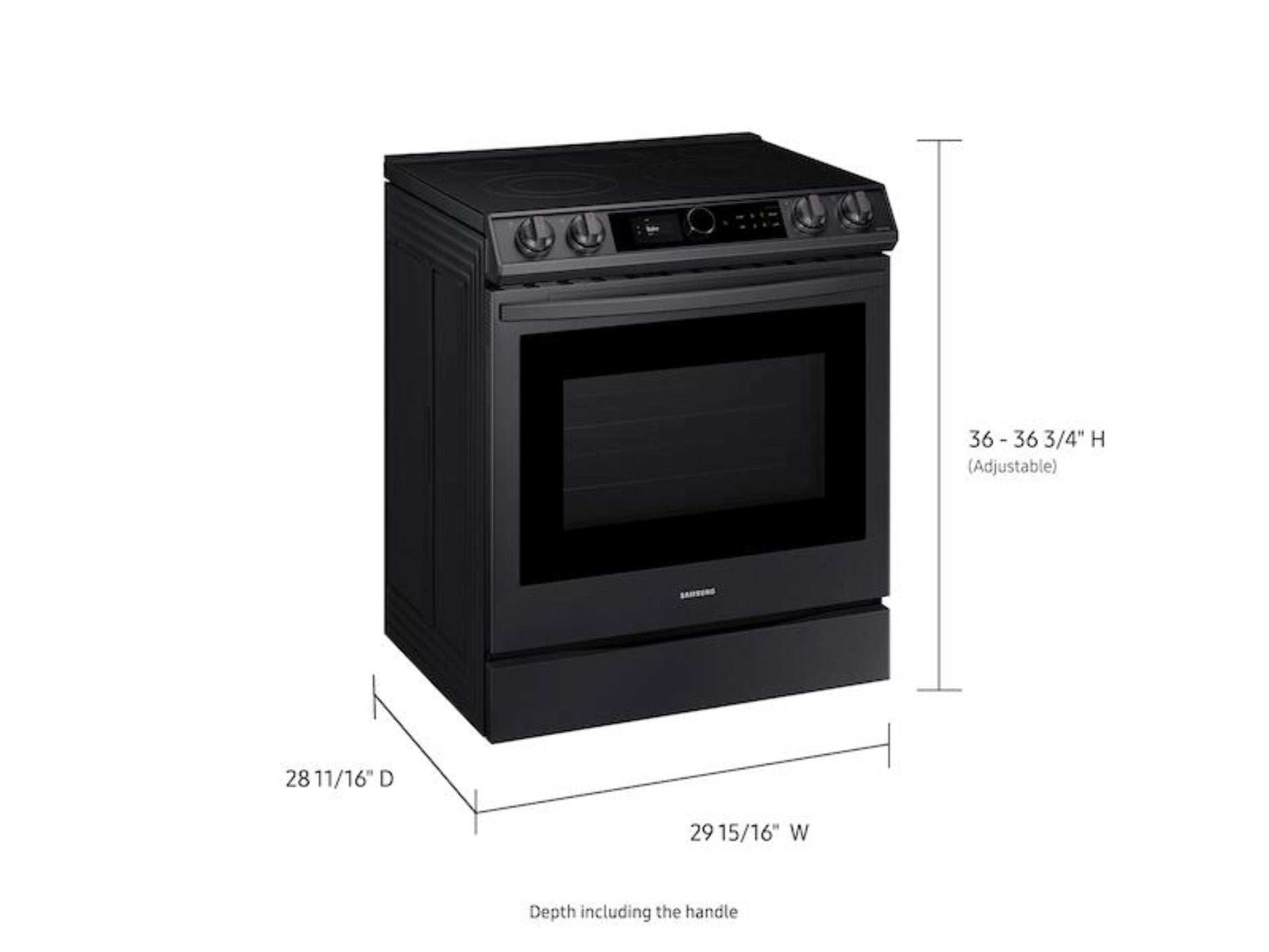 A: This 6.3 cu. ft. smart slide-in electric range features Smart Dial, Air Fry, True Convection, Rapid Boil™, and Wi-Fi connectivity, all in a sleek black stainless steel finish.