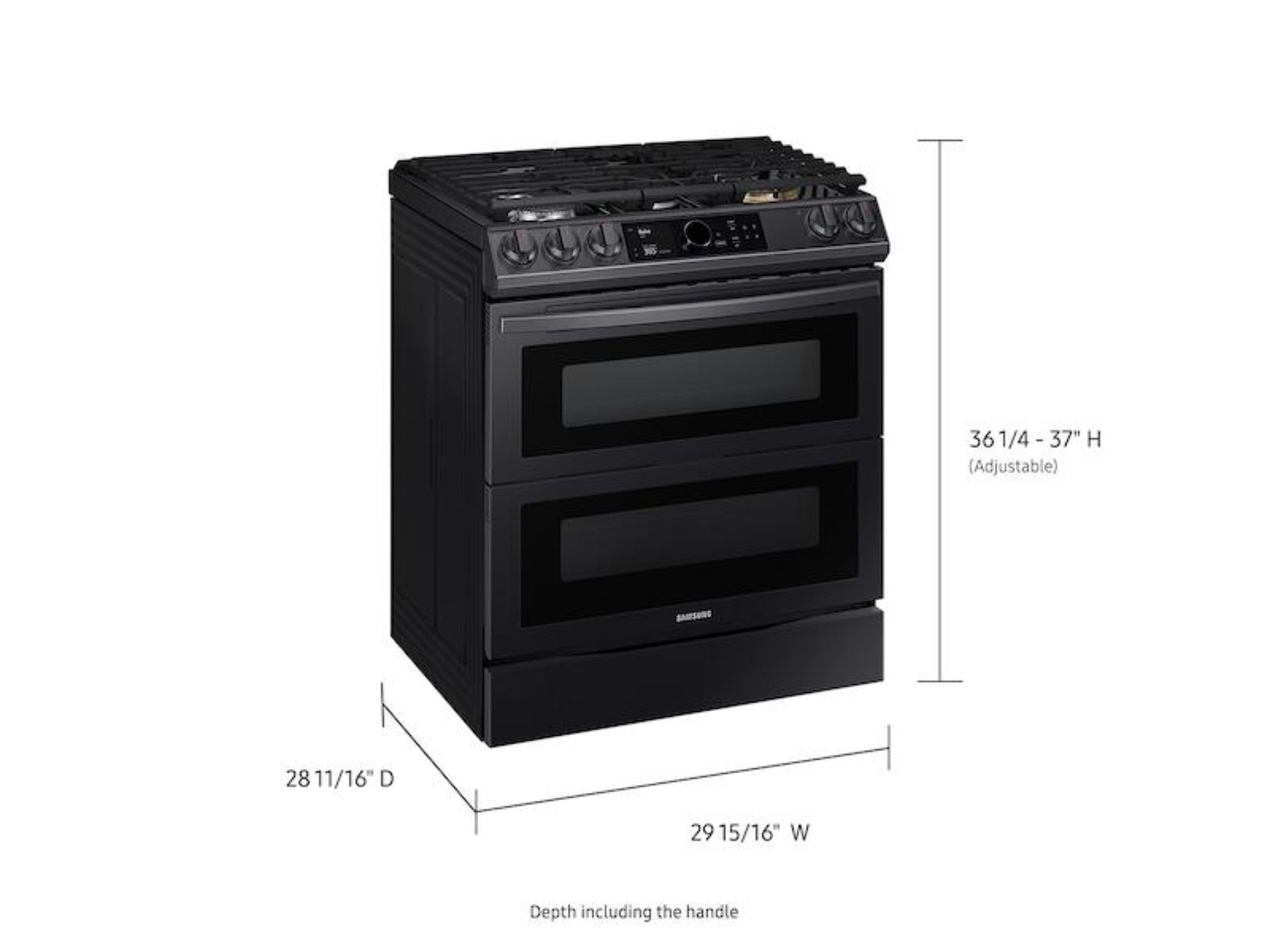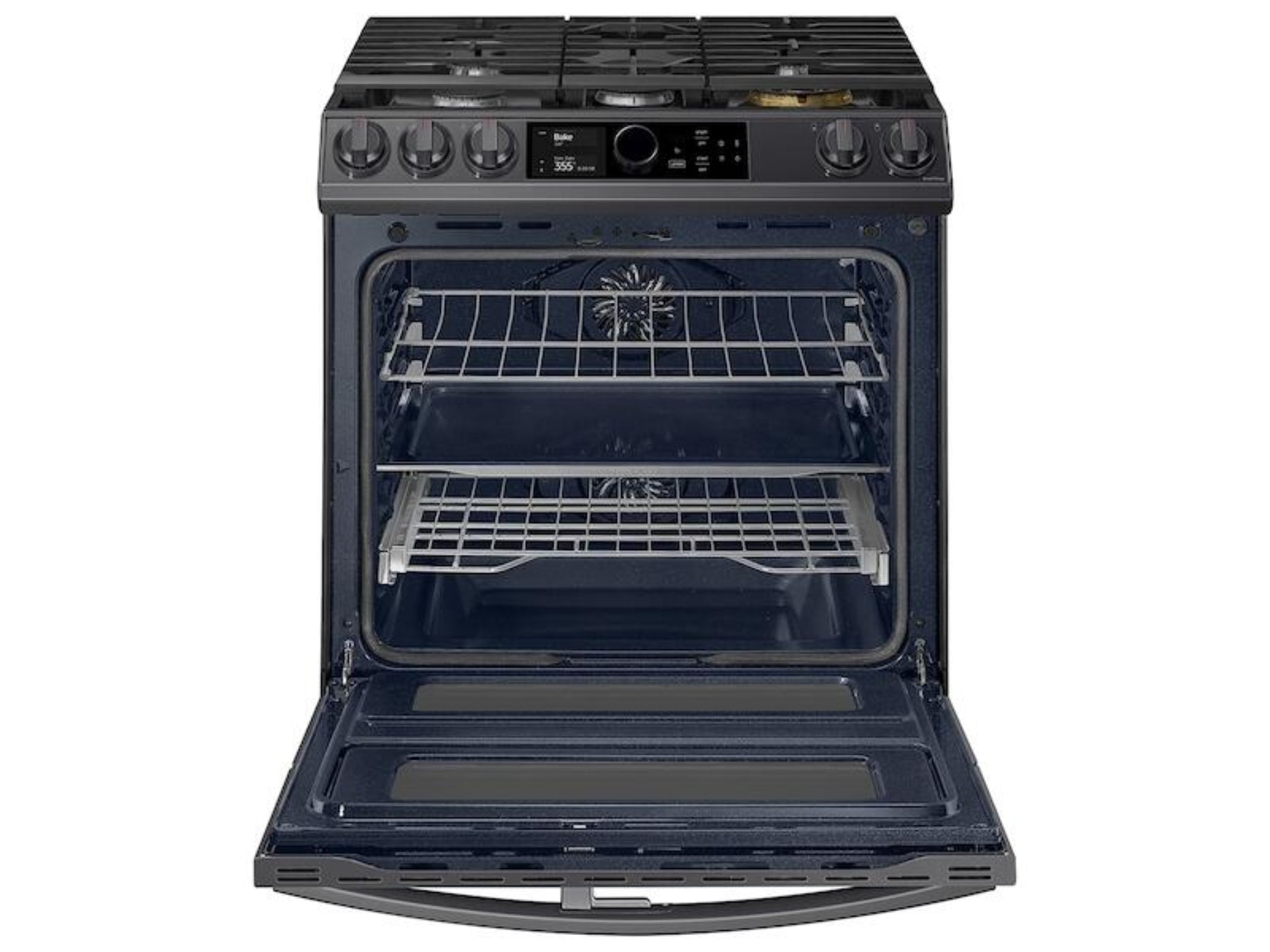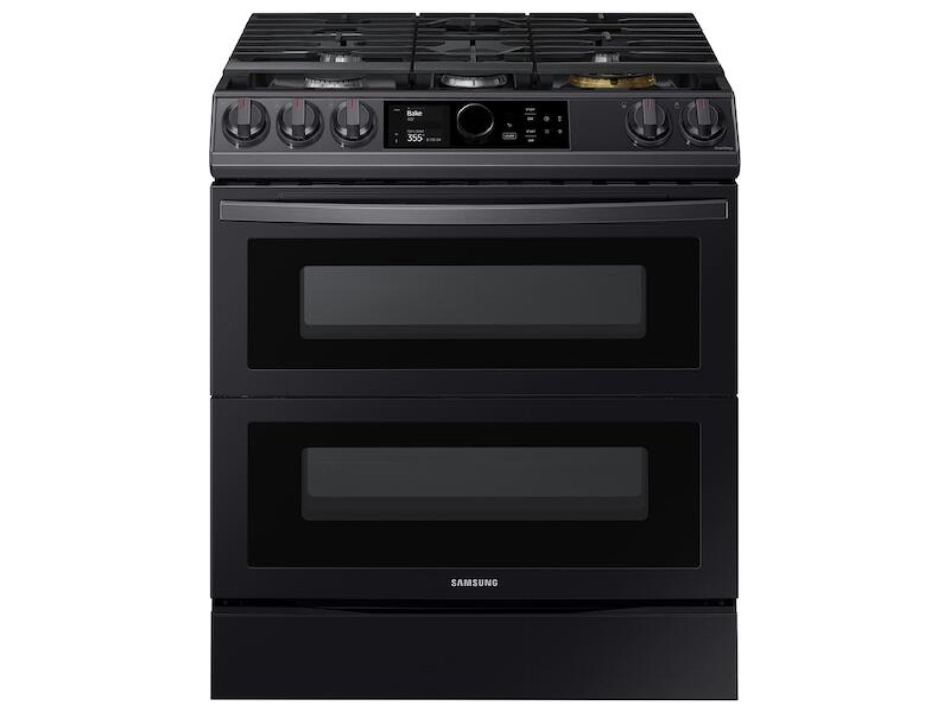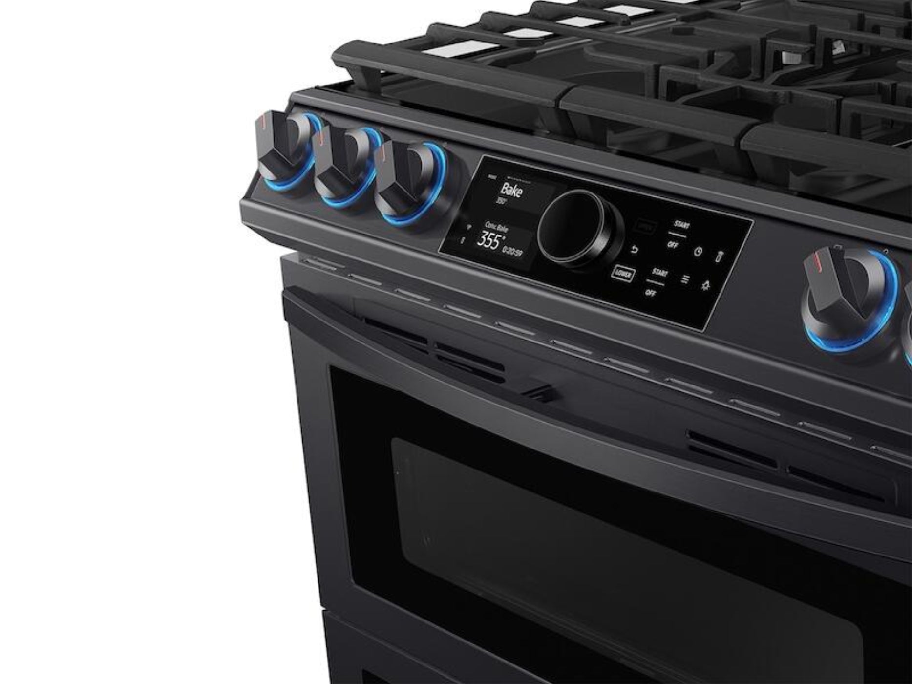 A: This 6.3 cu. ft. smart slide-in gas range features Flex Duo™ for dual oven zones, a Smart Dial for intuitive control, No-Preheat Air Fry for healthier crispy meals, and Wi-Fi connectivity for remote monitoring via the SmartThings app. It also includes Power Burners for high-heat cooking and a Reversible Cast-Iron Griddle for versatile cooking.