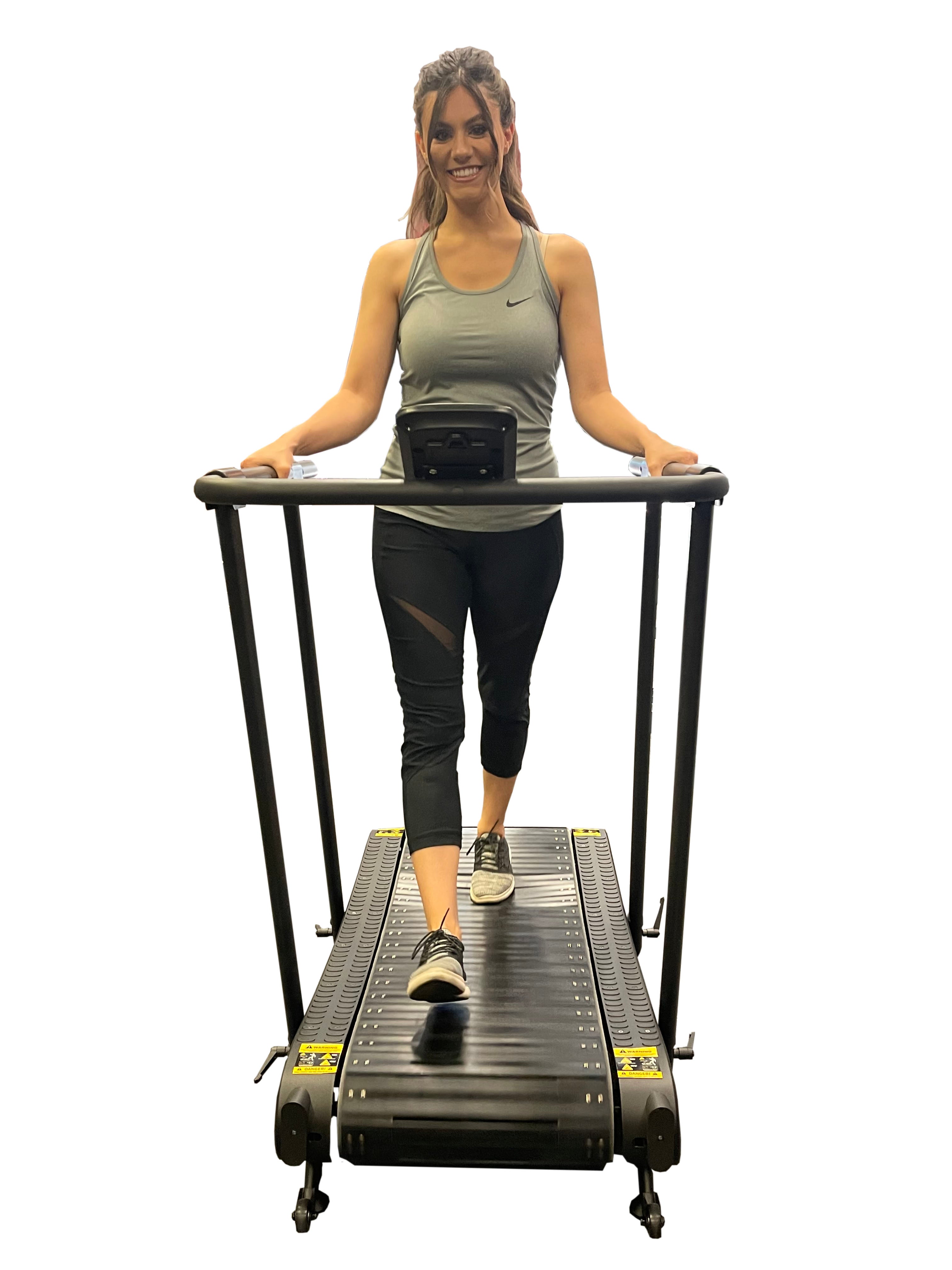 Self-generated ultra-smooth curved treadmill for low-intensity and high-speed walking with medical handrails for increased safety.