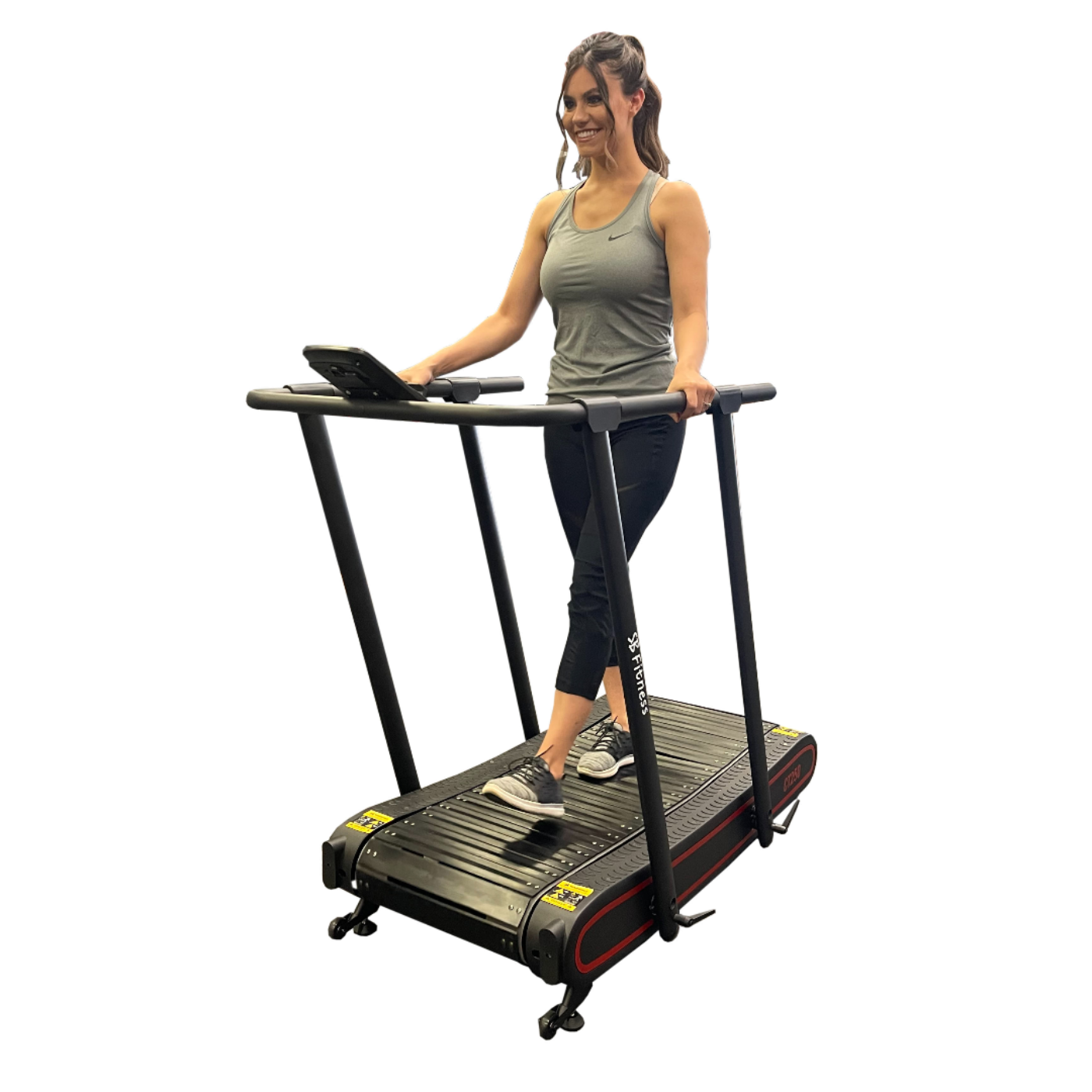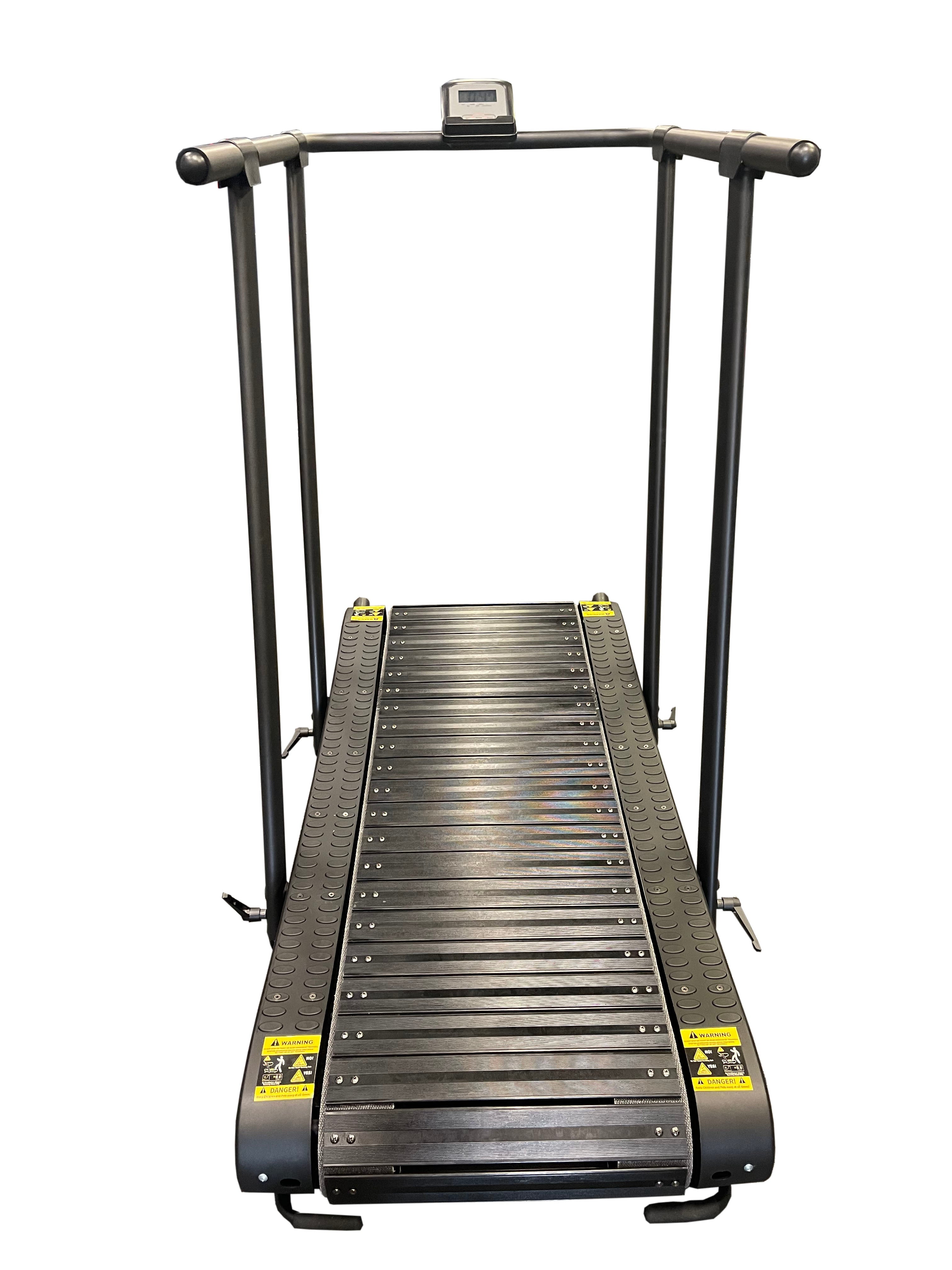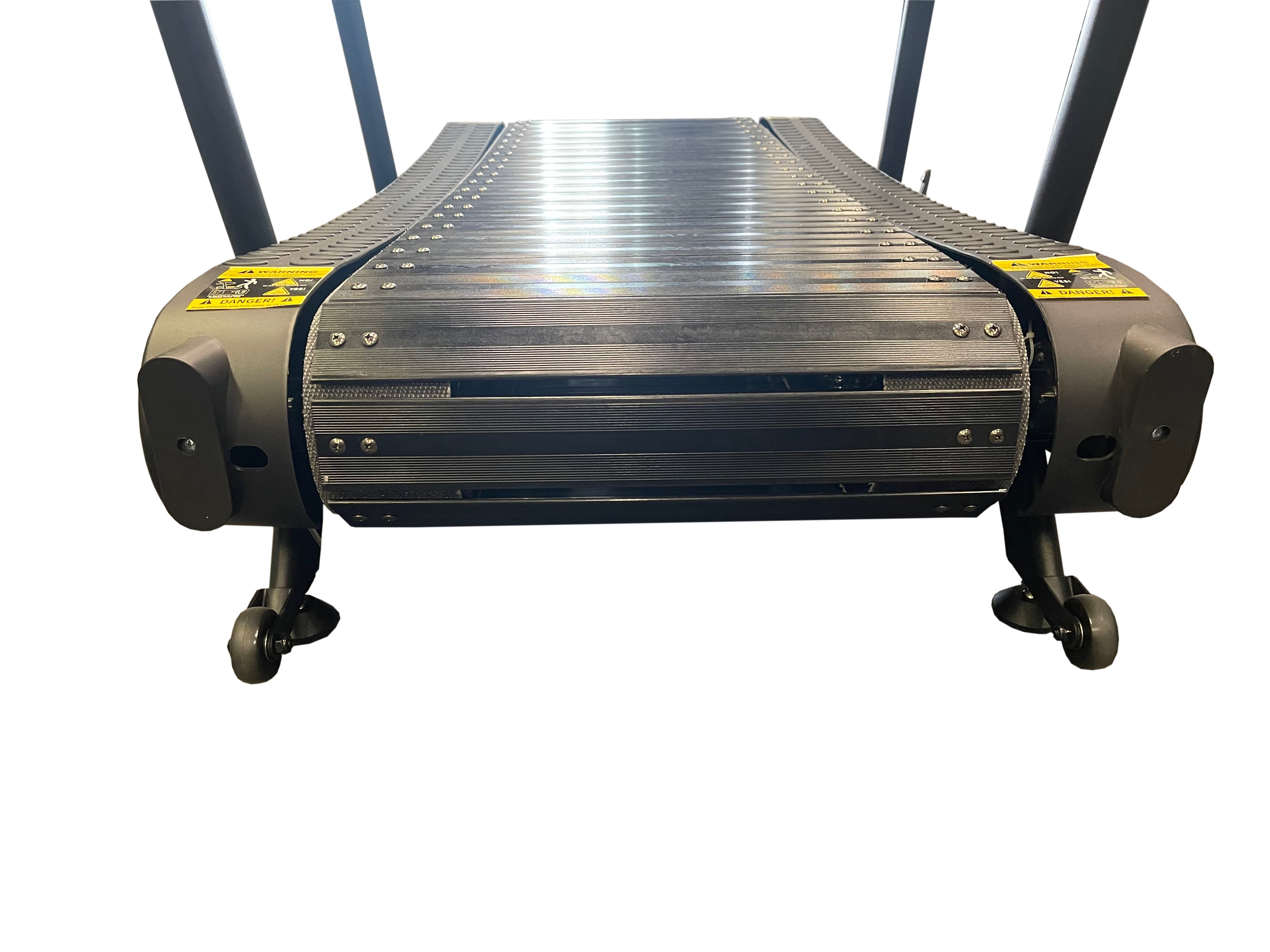 A: The treadmill is powered entirely by the user's movement, allowing for unlimited speed control without a motor.
