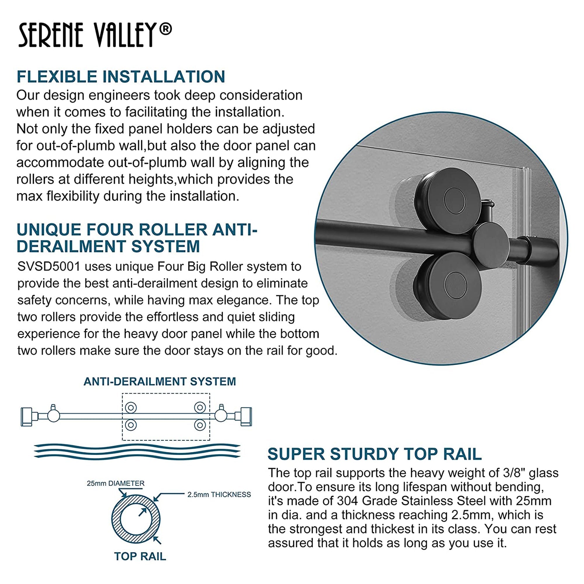A: The Serene Valley Big Roller Frameless Sliding Shower Door is a premium, stylish sliding door featuring 52" x 74" tempered glass, with a matte black finish and a big roller system for smooth, effortless operation.