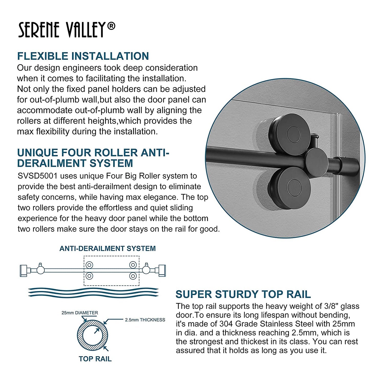 Q: What are the key features of the Serene Valley 60 x 74 Inch Big Roller Frameless Sliding Shower Door in Matte Black?
