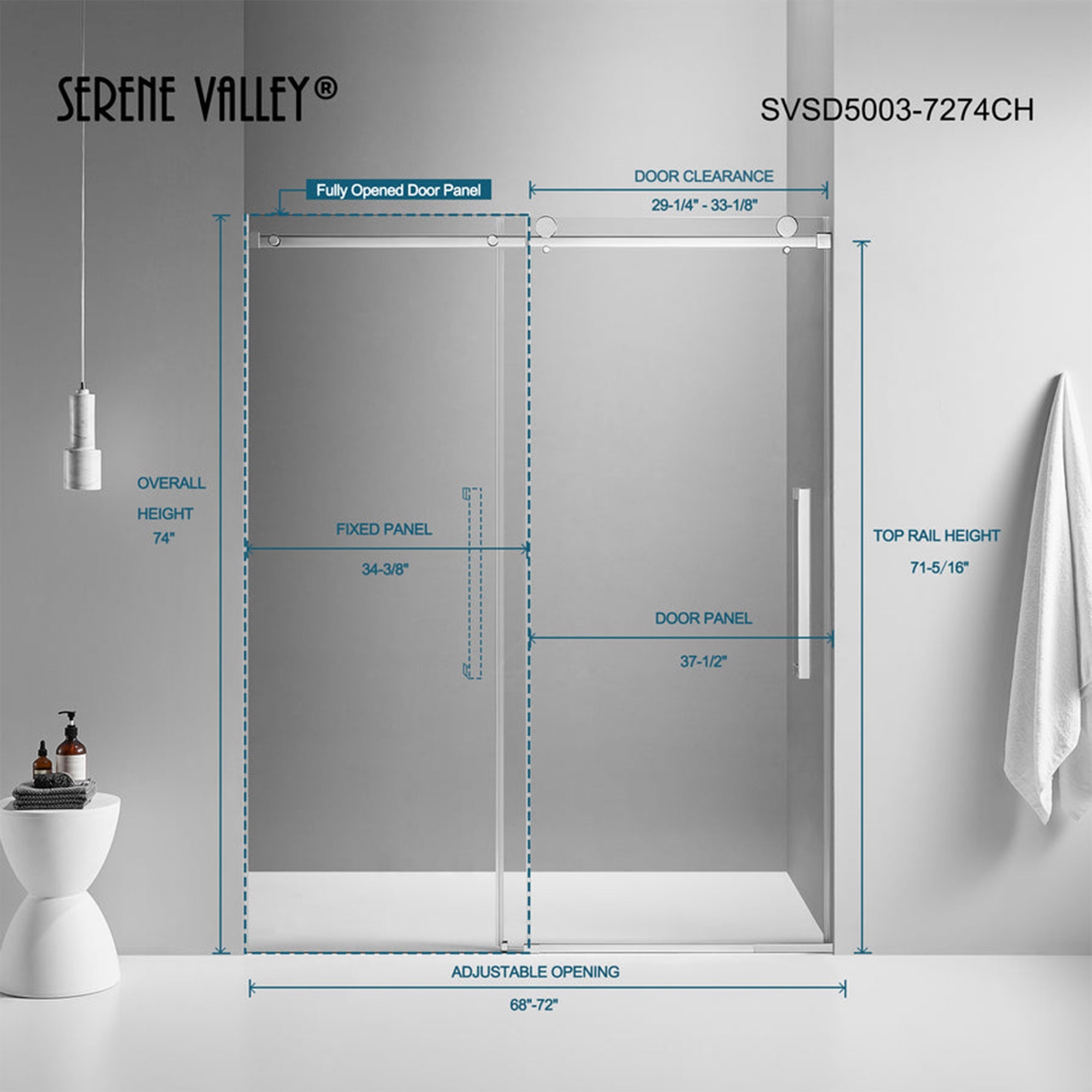 The shower door features an adjustable width from 68 to 72 inches wide and measures 74 inches high. Shower with confidence and ease with the 74 Inch Square Rail Sliding Shower Door from Serene Valley.