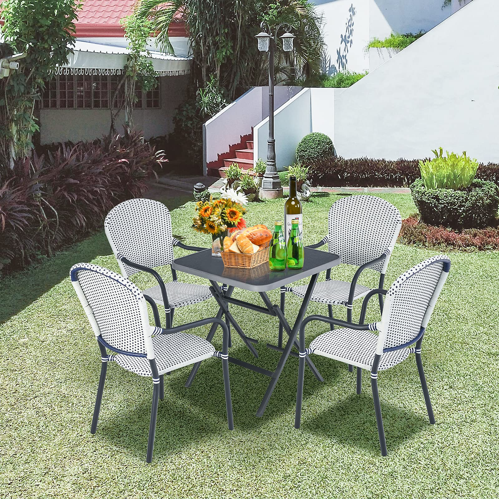 These stacking chairs are a great addition to different outdoor places, such as poolside, garden, backyard and patio, etc. If the guests come to visit your home, you can entertain them with these four chairs. When they leave, you can stack these chairs to save space. Made of weather-resistant PE rattan and a heavy steel frame, this outdoor dining set is durable and stable to hold up to 330 lbs for each chair.